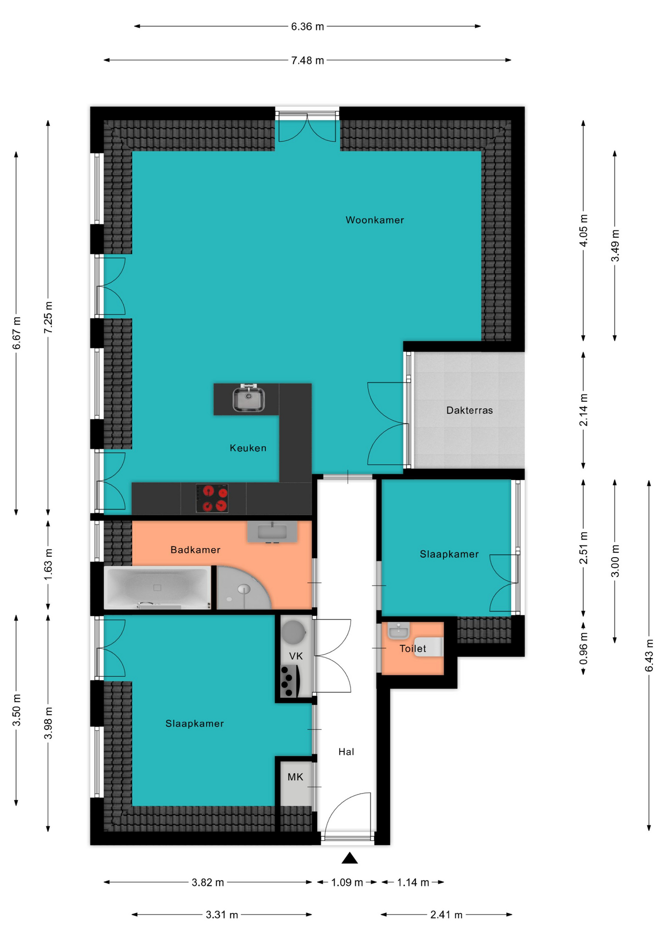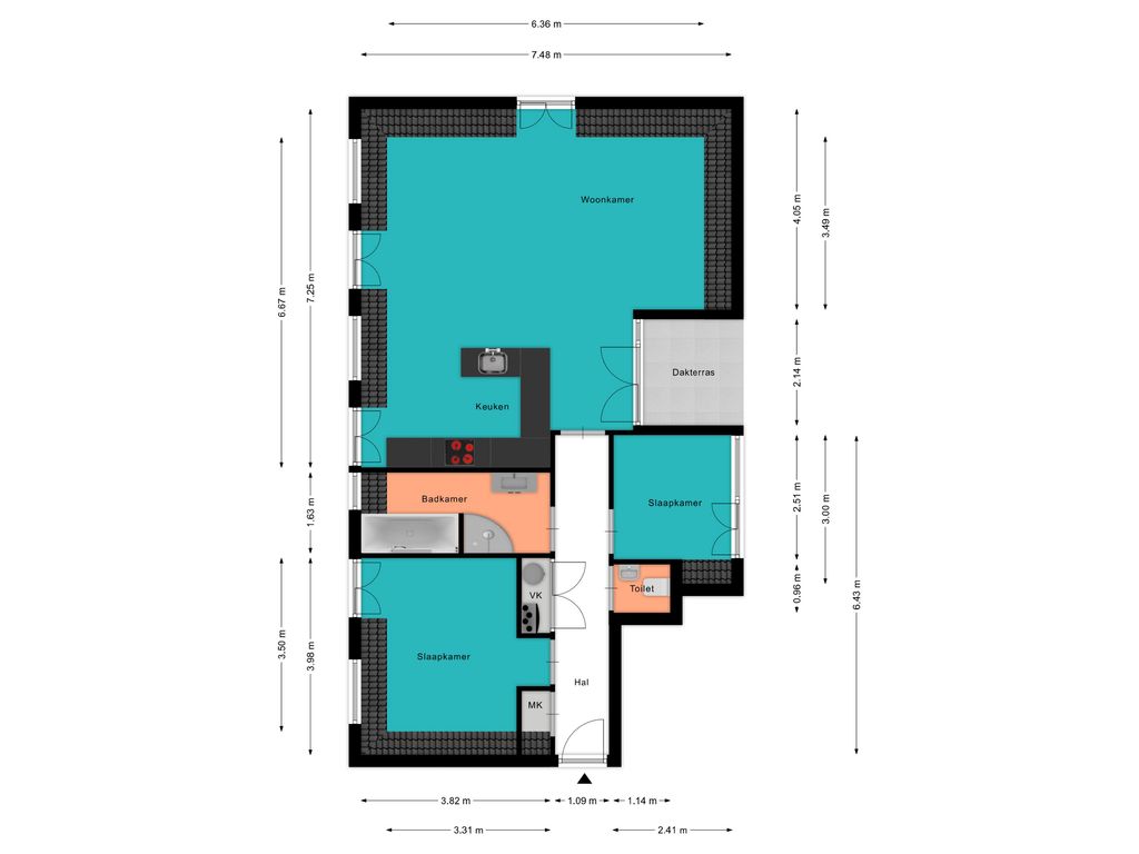Voor de afmetingen en indeling raadpleeg de gedetailleerde plattegrond.