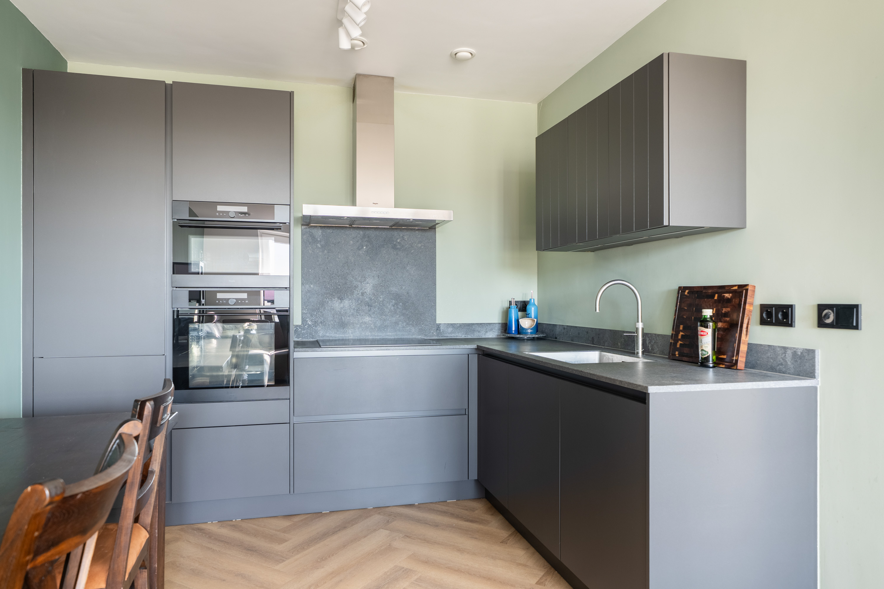 De keuken is modern afgewerkt, ruim van opzet en geplaatst in een hoek. Er is volop kast- en werkruimte aanwezig en de keuken is compleet uitgerust met de volgende luxe keukenapparatuur:
