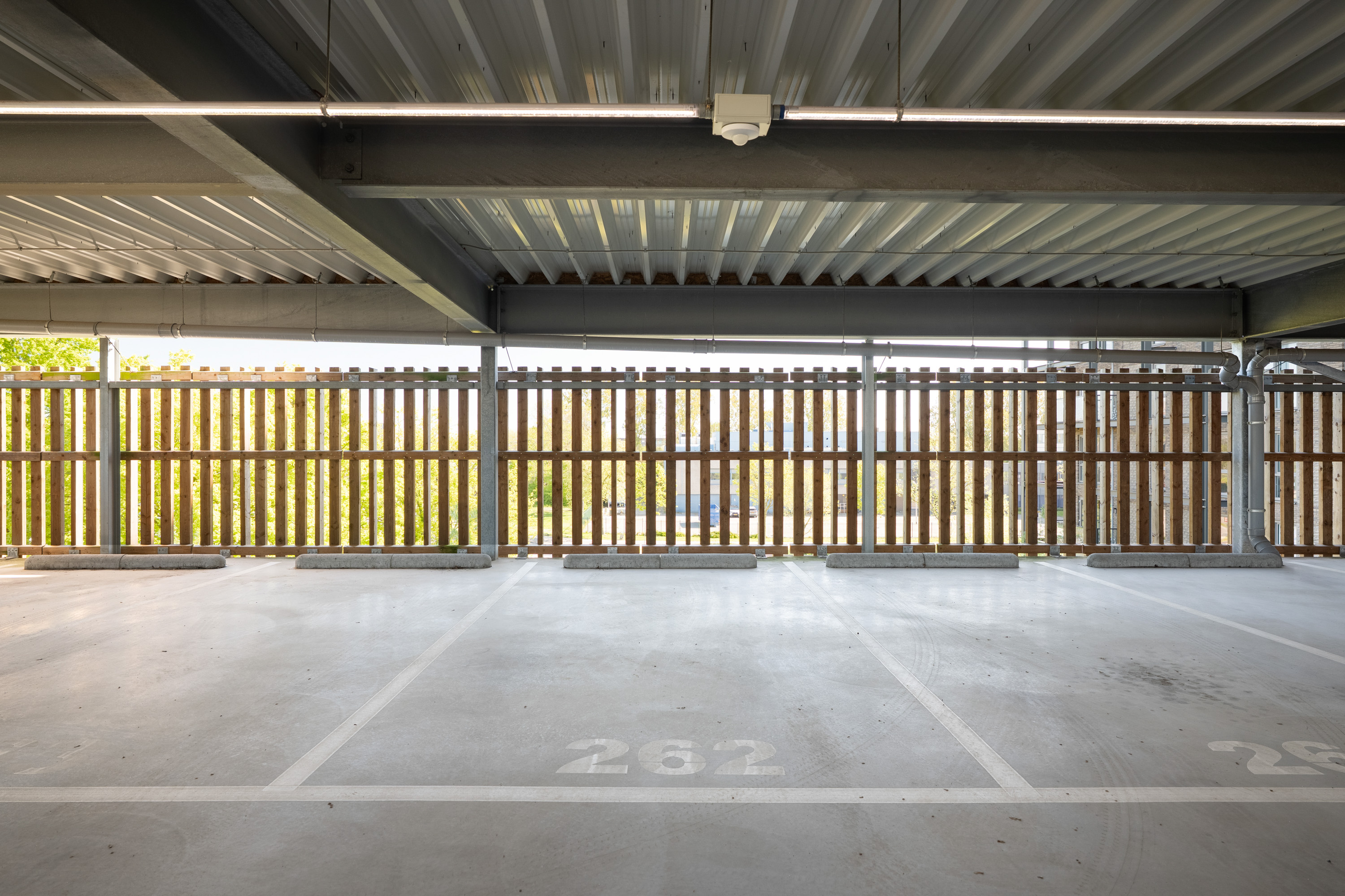 Via het elektronische hek is de eigen privéparkeerplaats te bereiken in de parkeergarage. De toegang wordt verschaft middels kentekenherkenning en via het trappenhuis of de lift kun je terug naar de begane grond. Voor bezoekers is vooraf een parkeerplek te reserveren via een app.