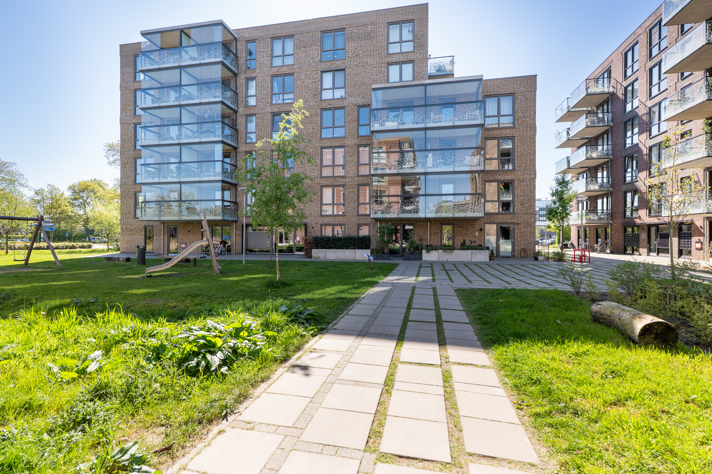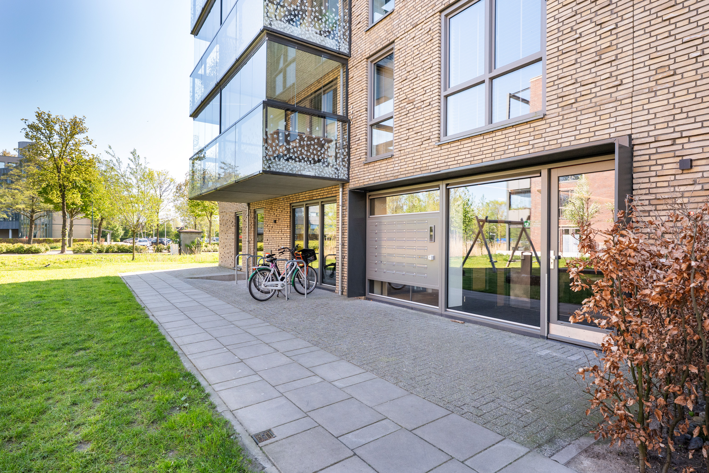 De centrale entree is voorzien van een videofooninstallatie en een nette, verzorgde hal. Vanuit hier zijn de appartementen bereikbaar via zowel de lift als het trappenhuis. De gezamenlijke fietsenstalling is ruim opgezet en beschikt over een elektrische toegangsdeur. Bij dit appartement horen maar liefst drie fietsplaatsen.