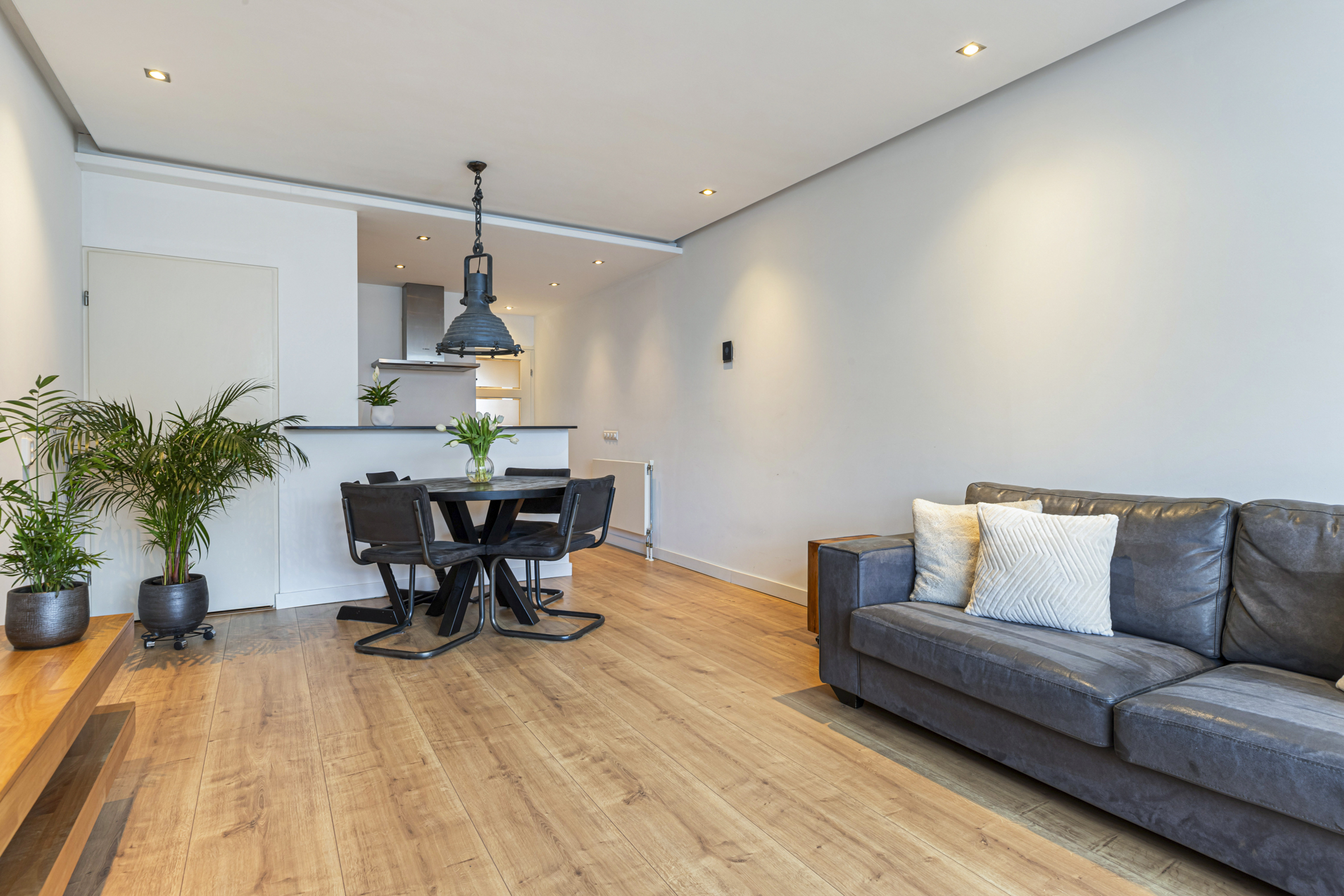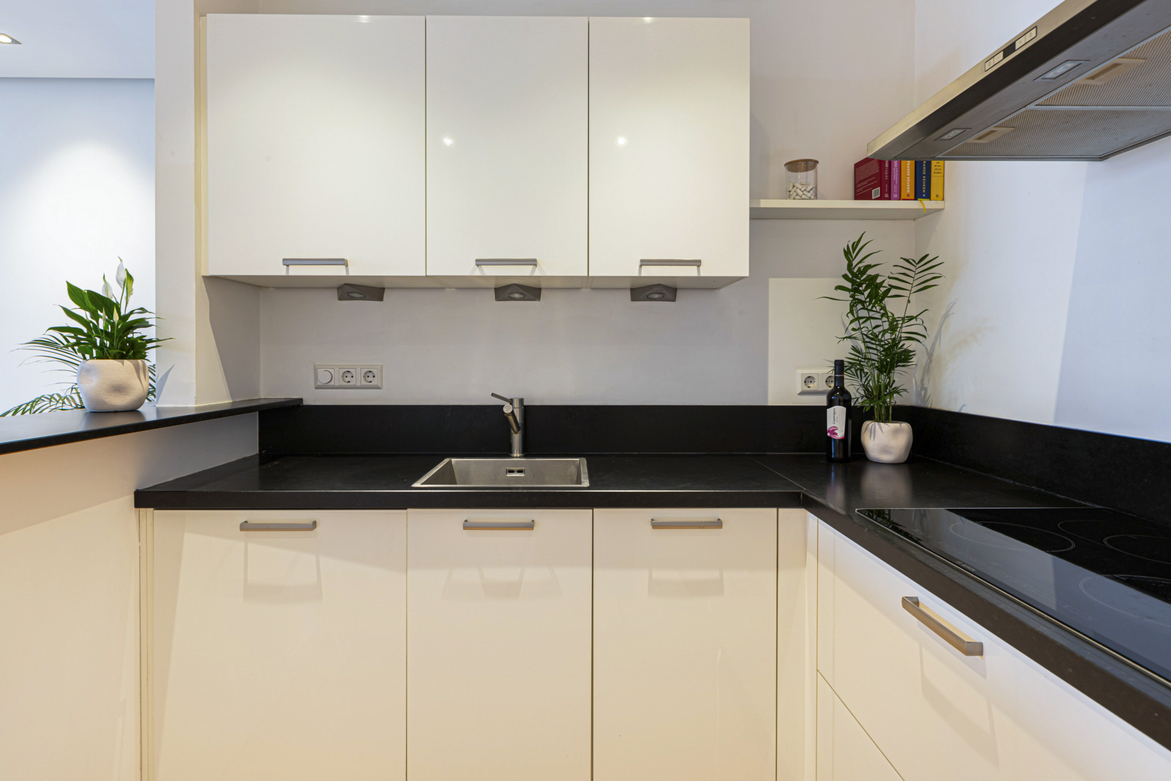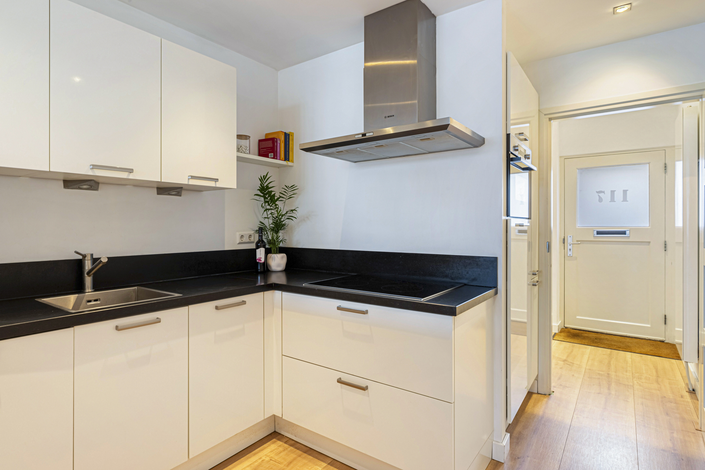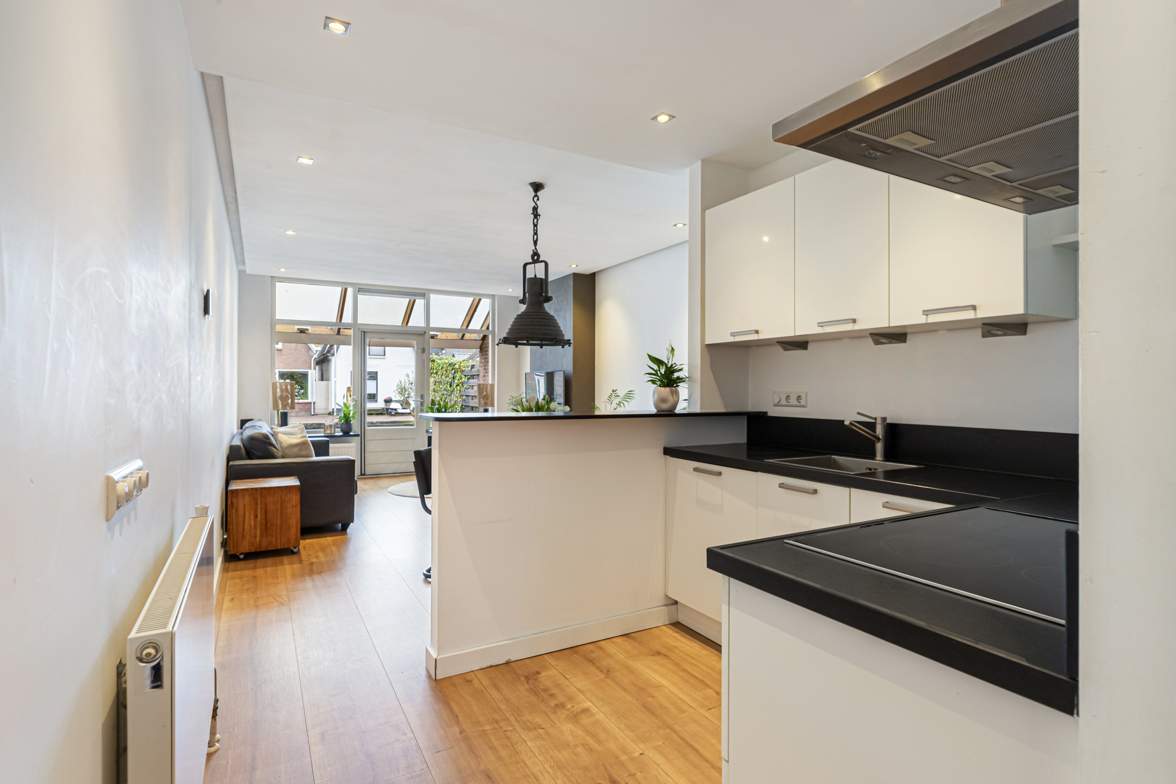 Aan de voorzijde van de woonruimte is de open keuken gesitueerd, geplaatst in een hoekopstelling en uitgerust met een inductiekookplaat, afzuigkap, vaatwasser (2024), koelkast en combi-oven (2025). Naast de keuken bevindt zich een praktische bergruimte onder de trap.
