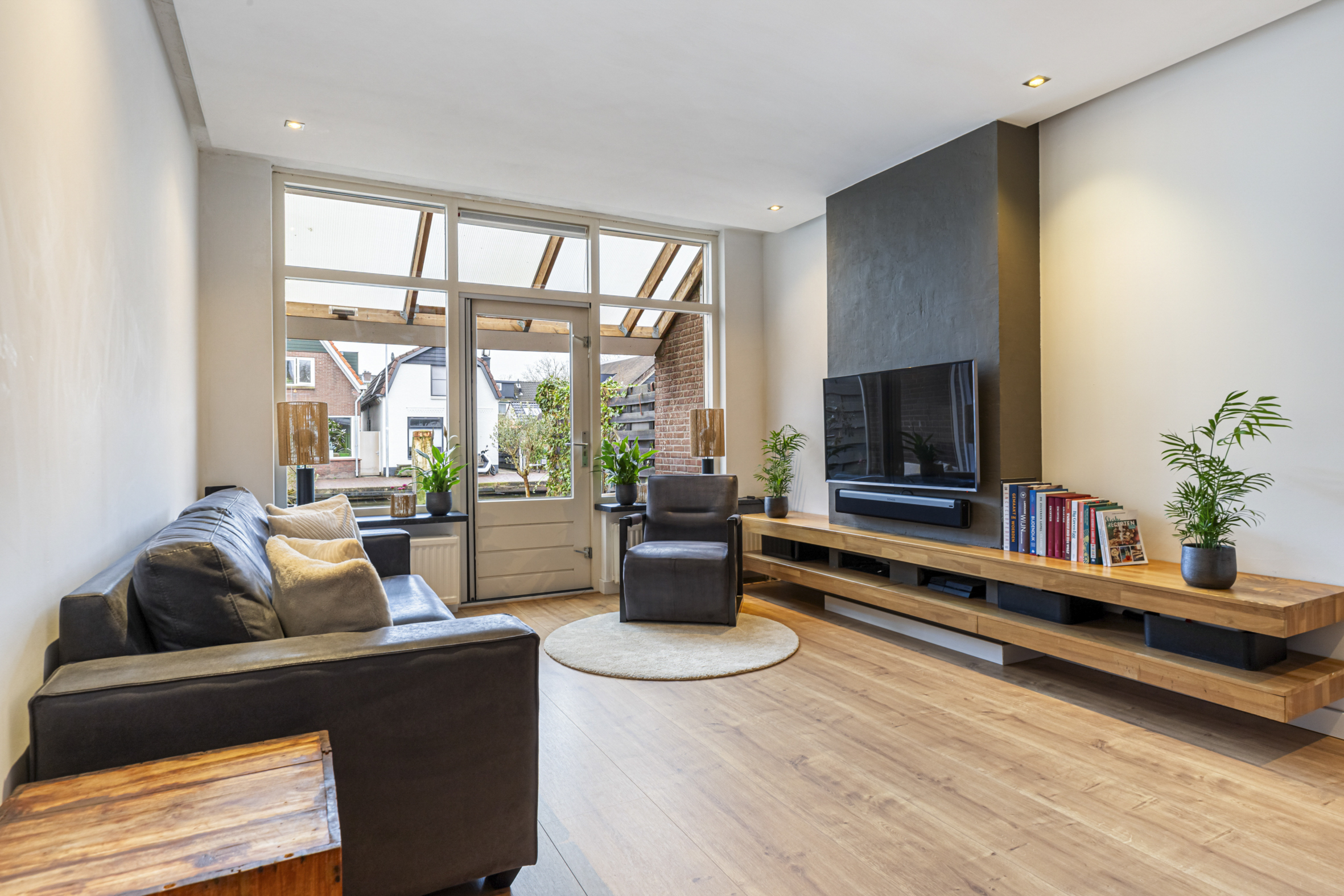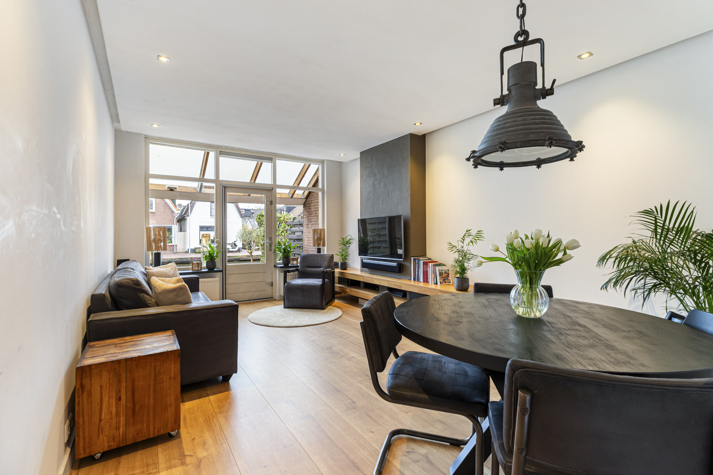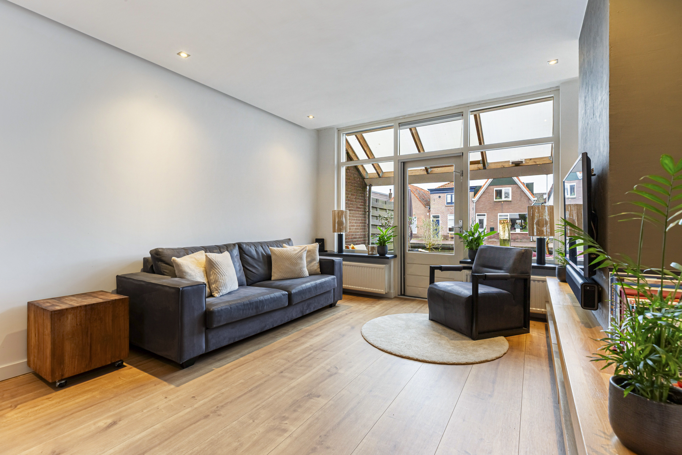 De woonkamer is dankzij de grote raampartijen aan de achterzijde heerlijk licht en biedt een gezellige zithoek met uitzicht op het water. Via een deur stap je zo de achtertuin in.