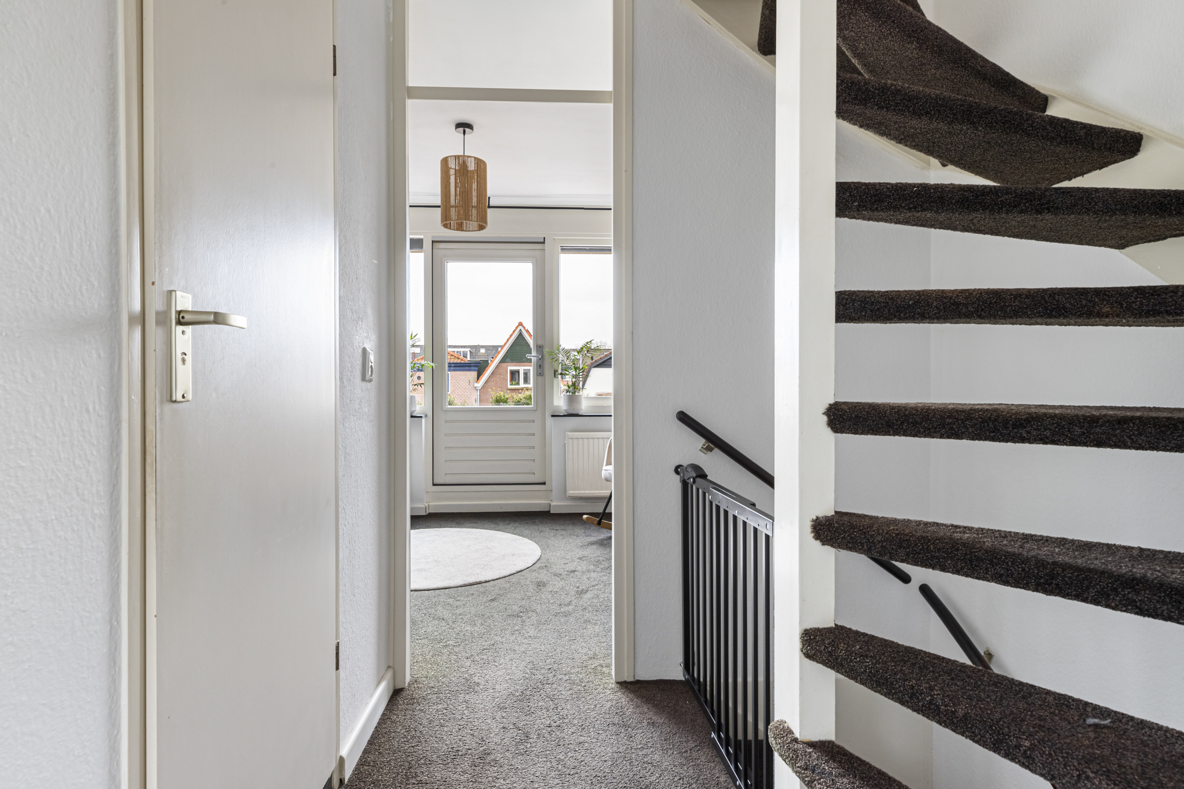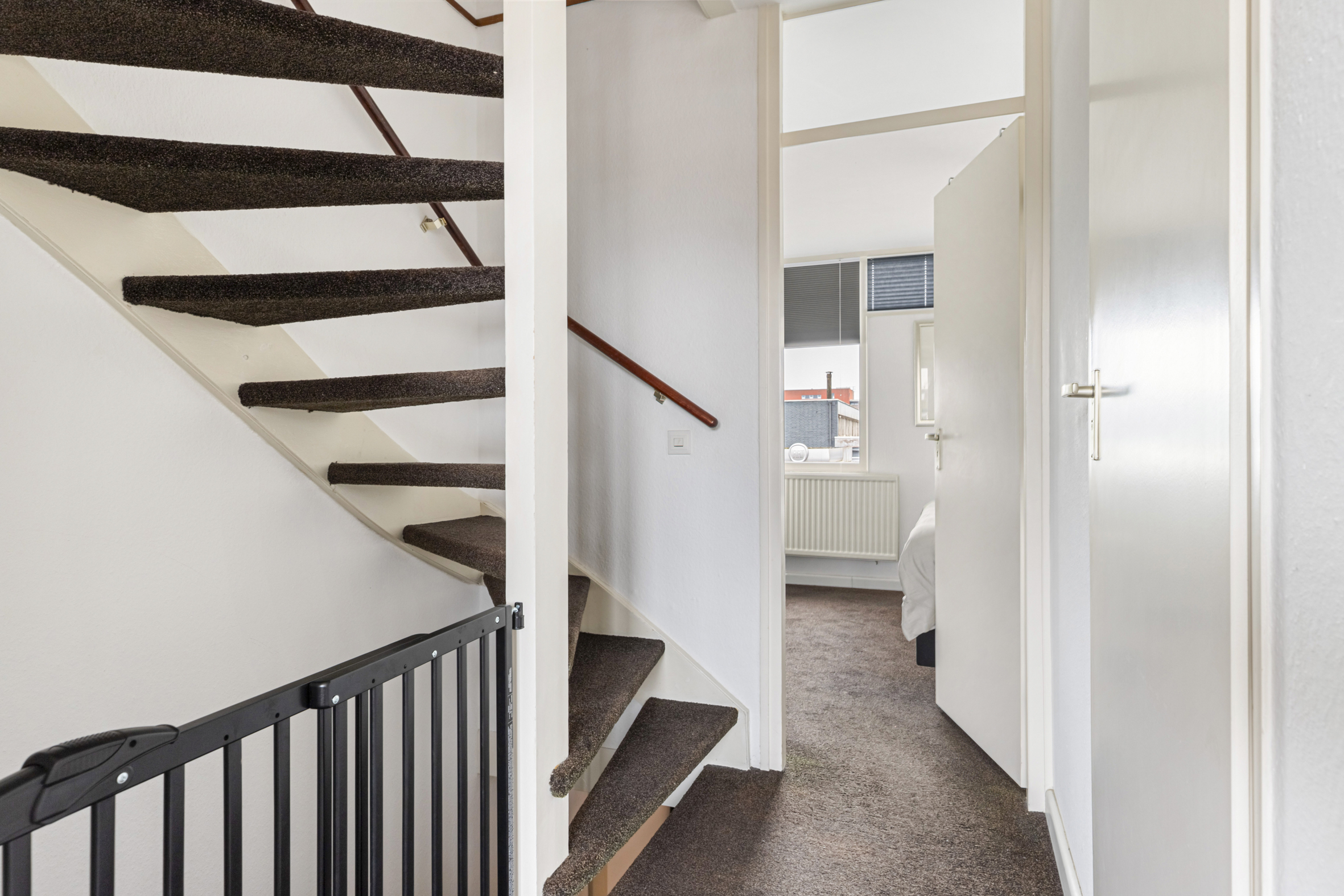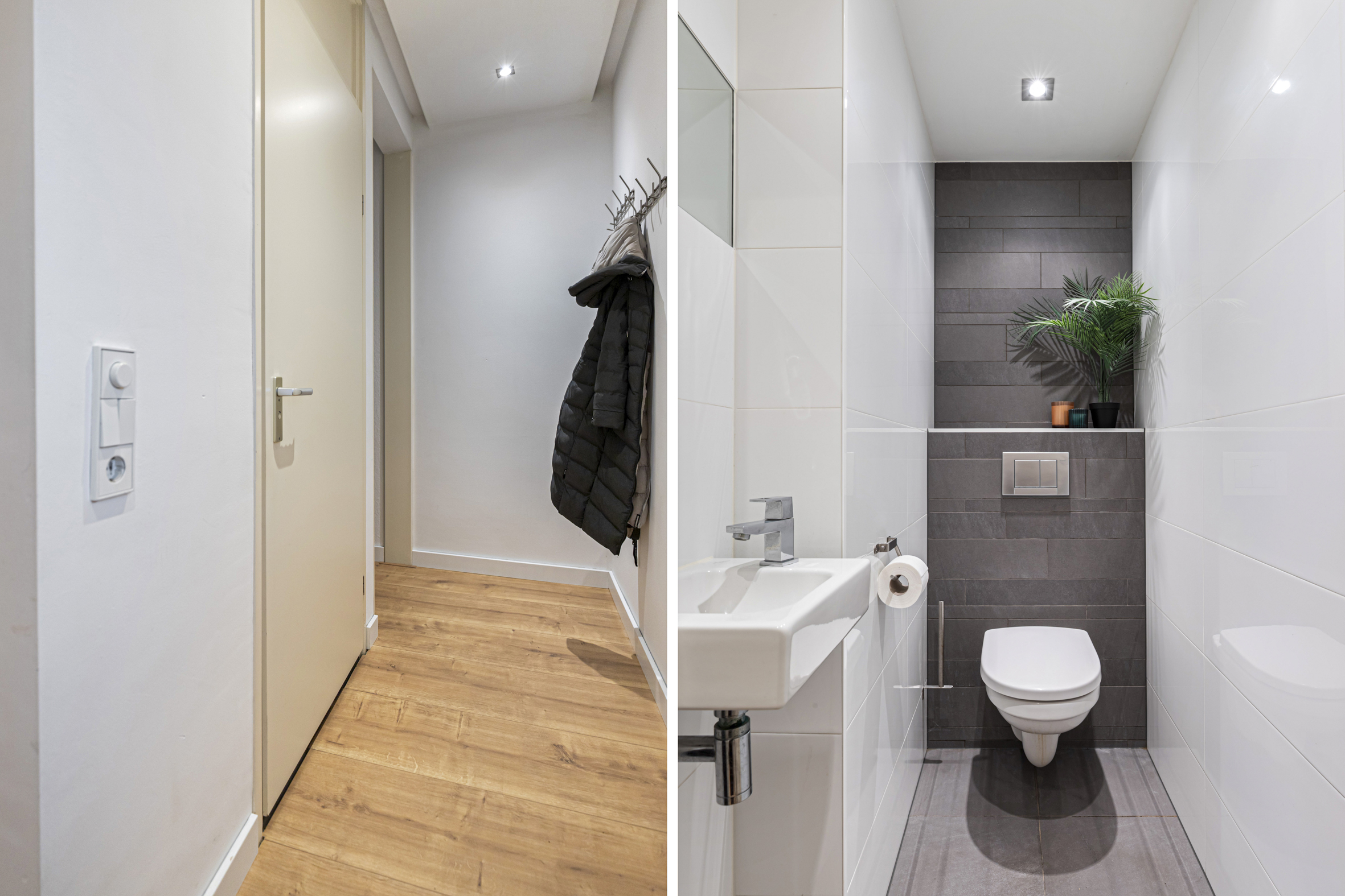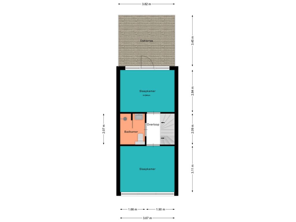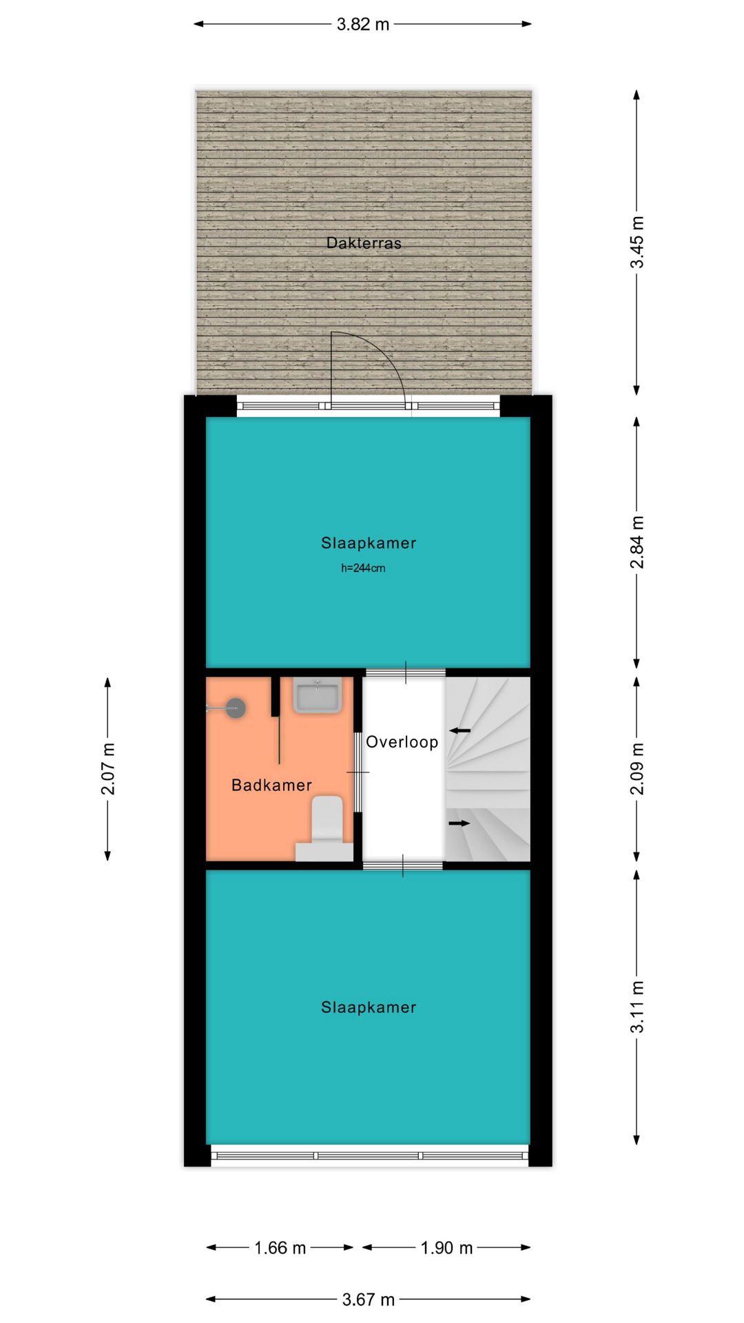 De overloop biedt toegang tot de badkamer en twee woningbrede slaapkamers aan de voor- en achterzijde. De slaapkamer aan de achterzijde beschikt over een deur naar het zonnige dakterras. De tussengelegen badkamer is uitgerust met een inloopdouche, tweede toilet en een wastafelmeubel.