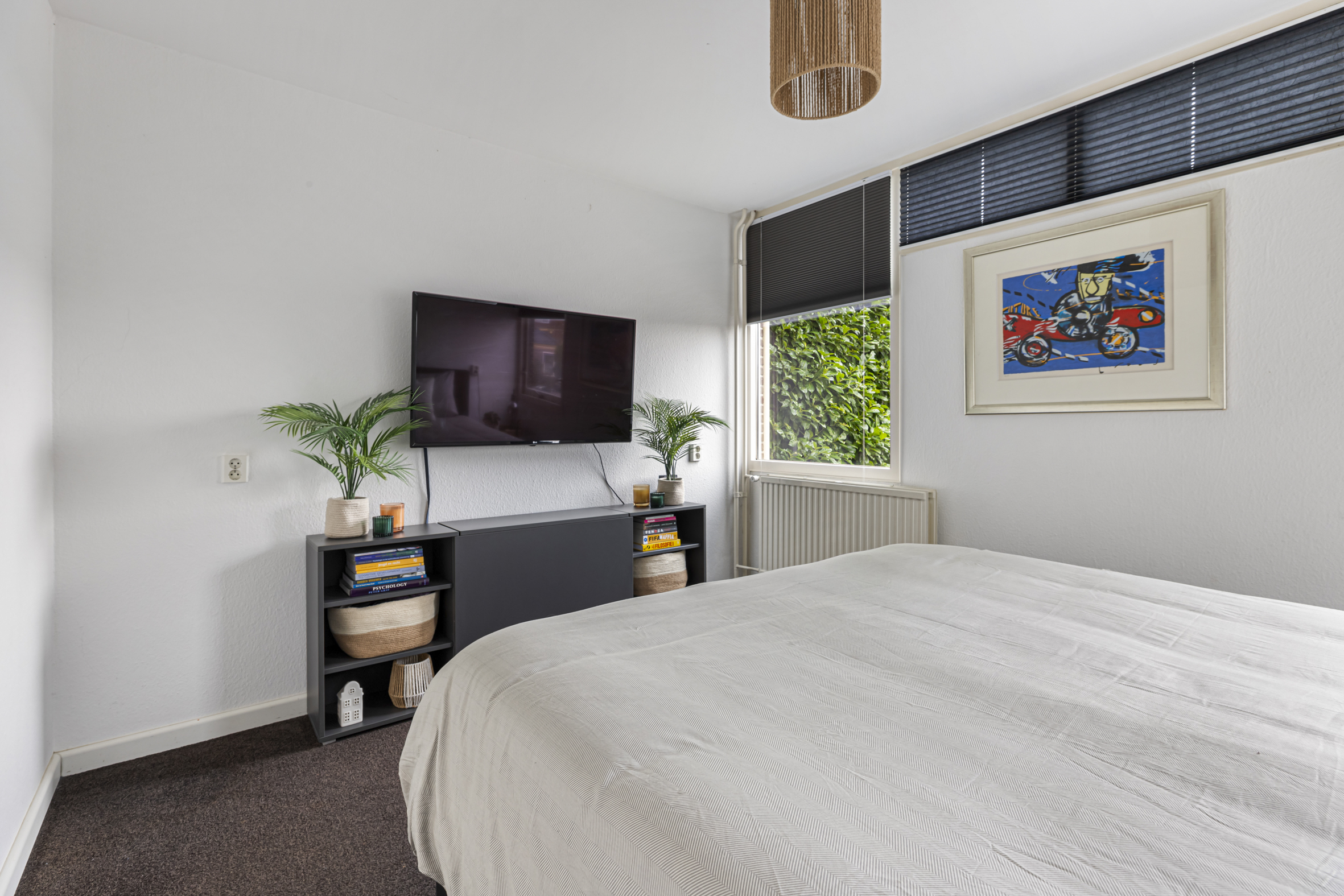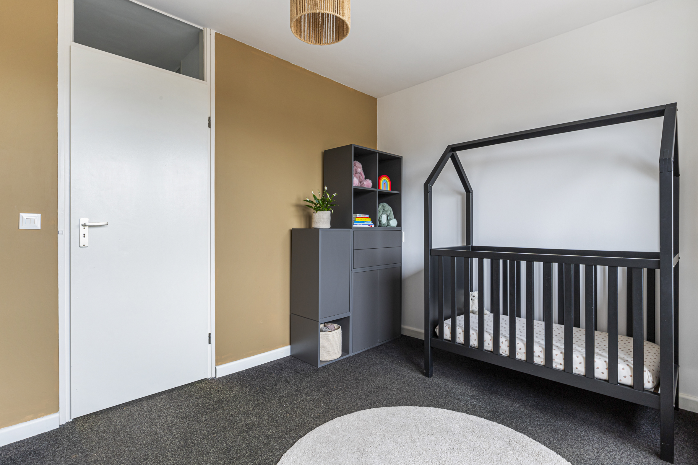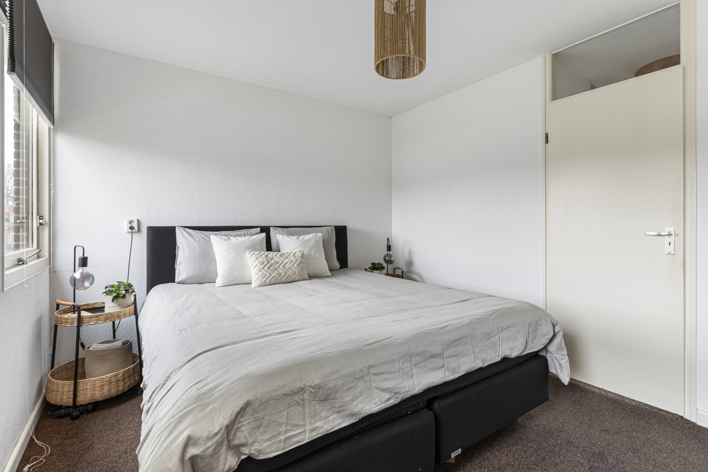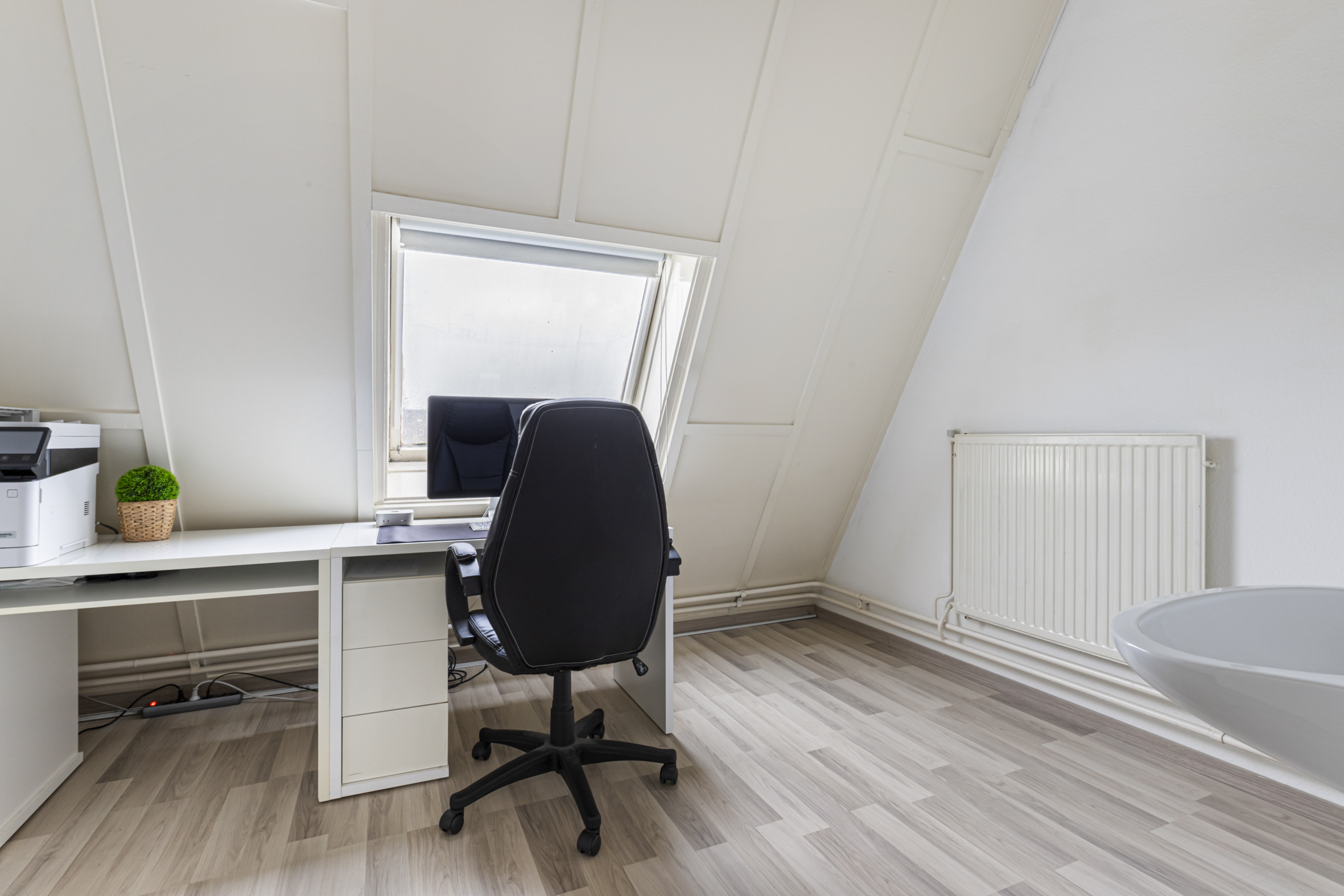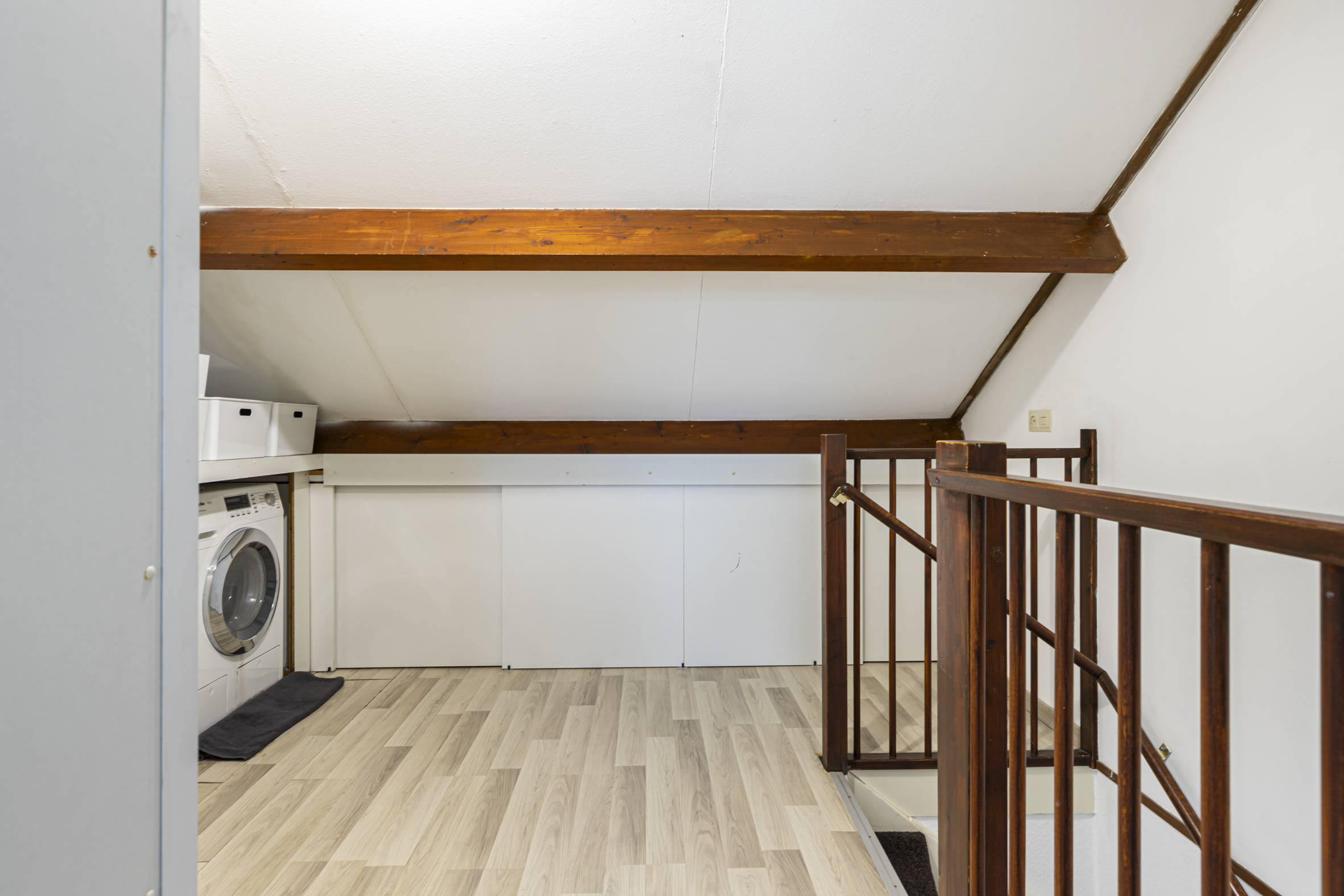 Op de overloop van de zolder is volop bergruimte onder de schuine kap en in de praktische vaste kast. Tevens bevindt zich hier een tweede wasmachineaansluiting. De derde slaapkamer aan de voorzijde beschikt over een wastafel en een dakraam, dat zorgt voor extra lichtinval.