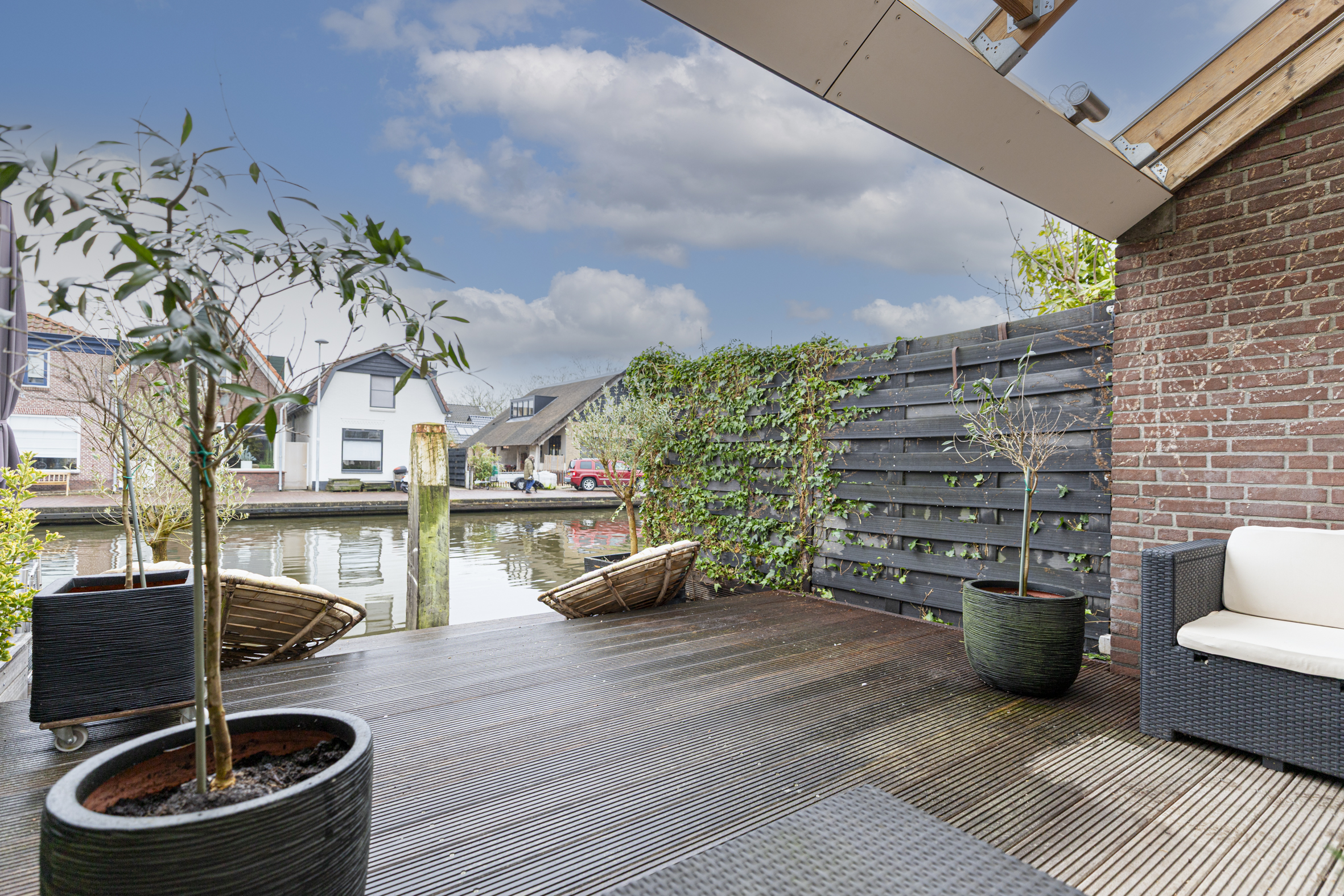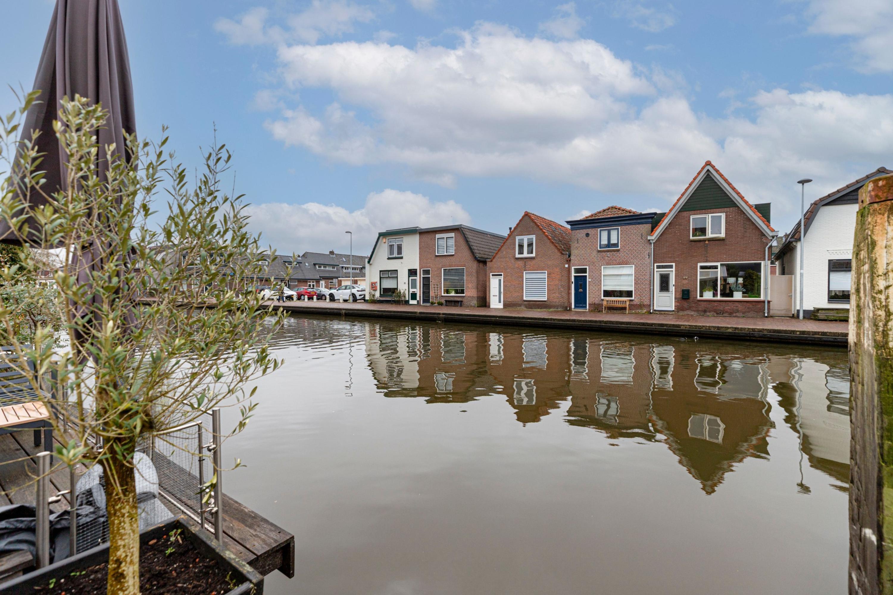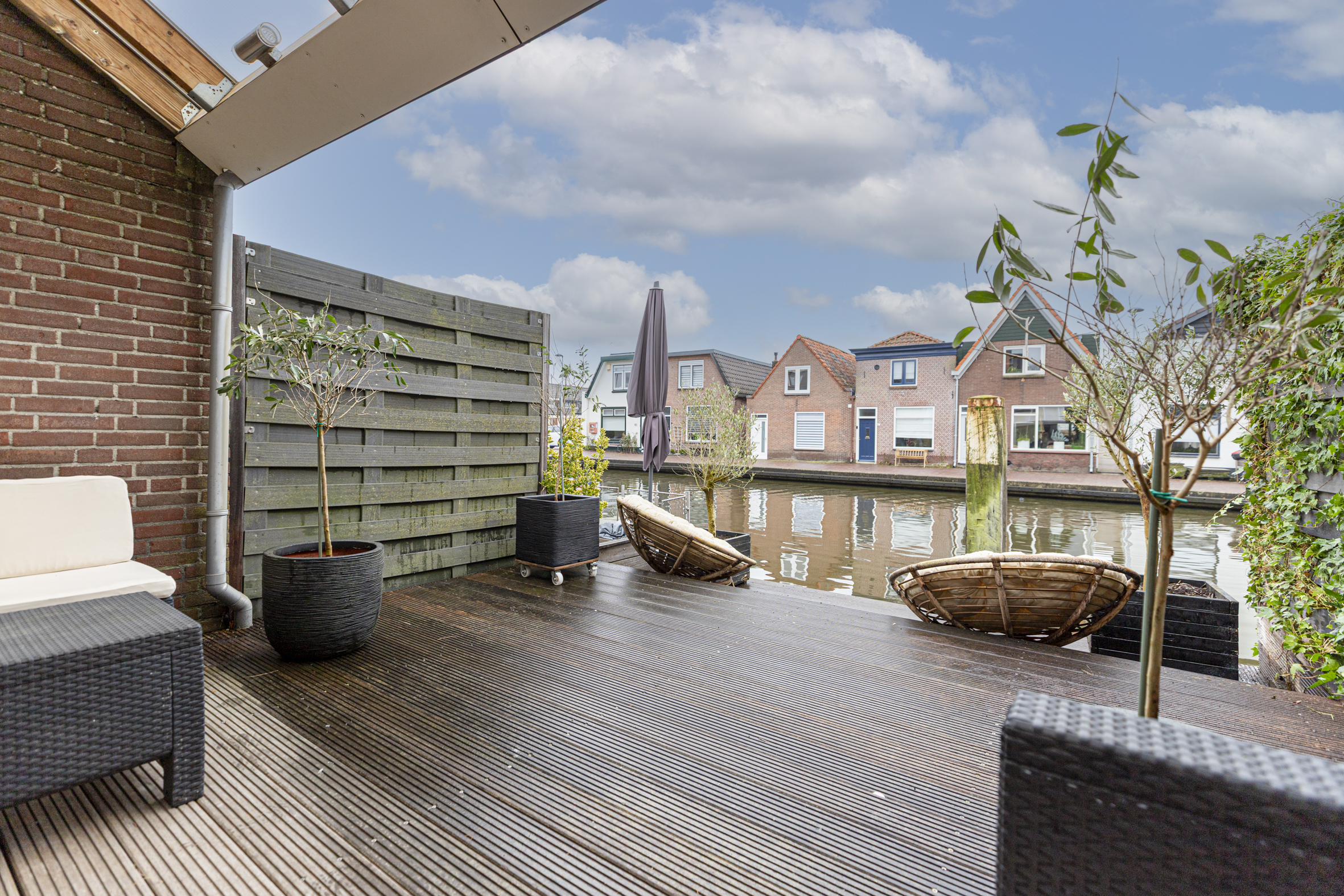 De zonnige achtertuin, vrijwel volledig op het zuiden gelegen, grenst direct aan het water. De tuin is deels overdekt en voorzien van een houten vlonder. Deze heerlijk buitenruimte biedt een unieke plek om volop te genieten van het wonen aan het water en het voorbijvaren van bootjes.