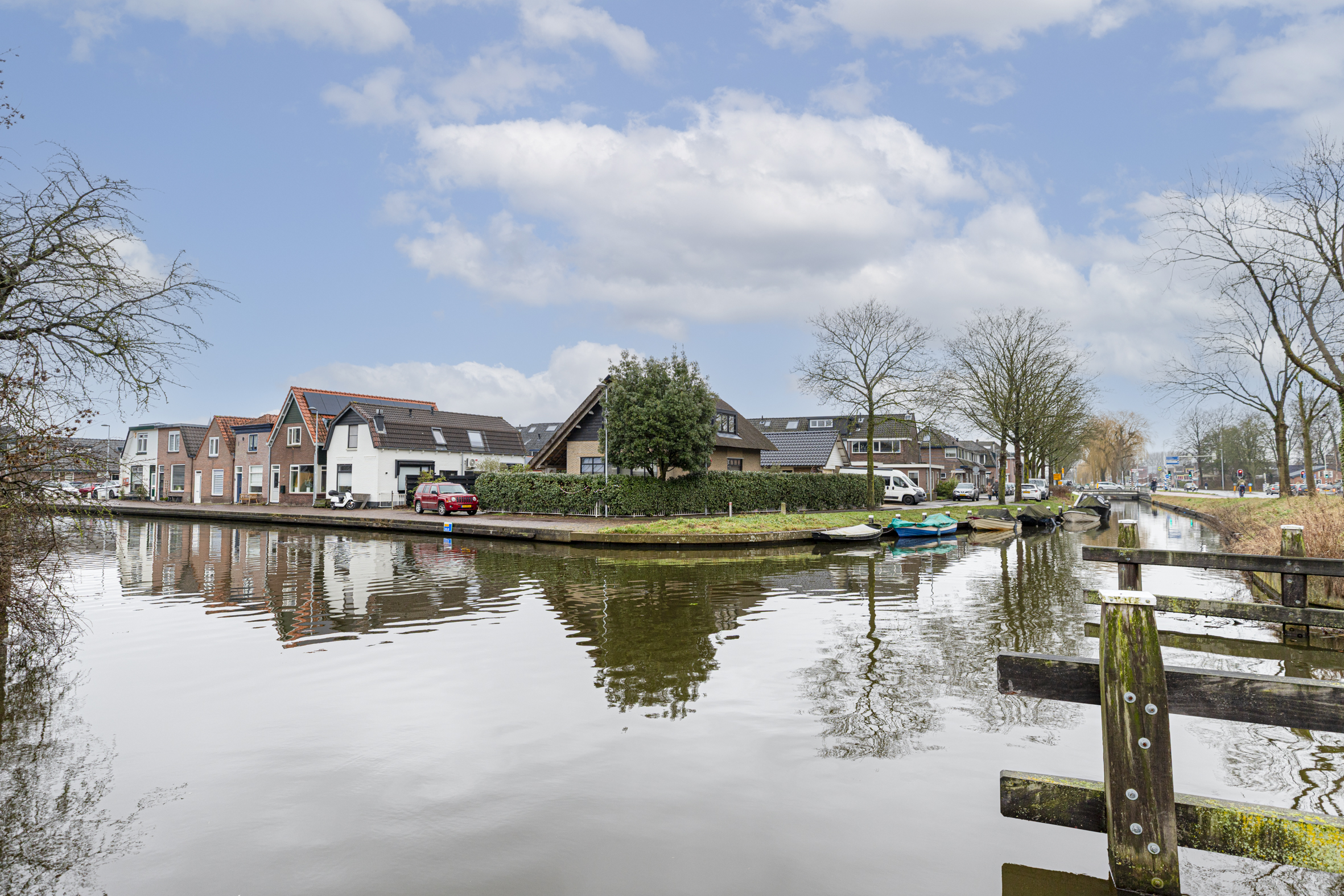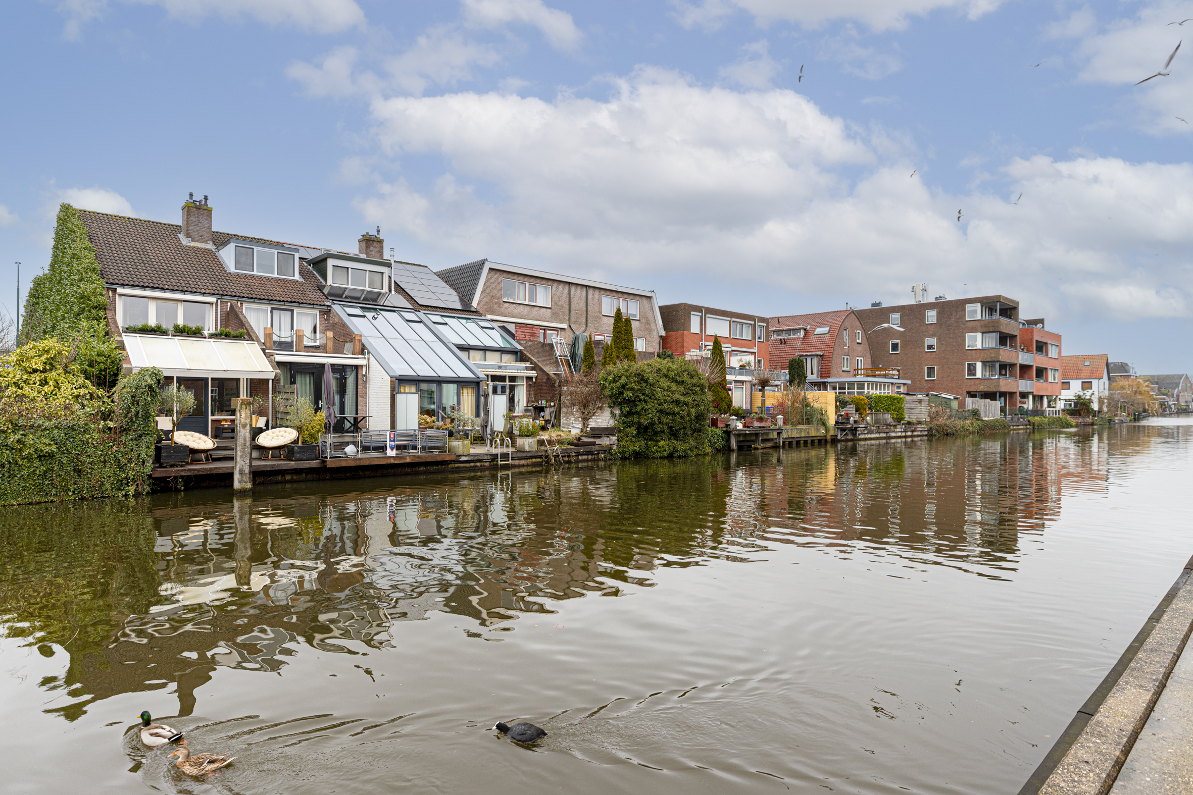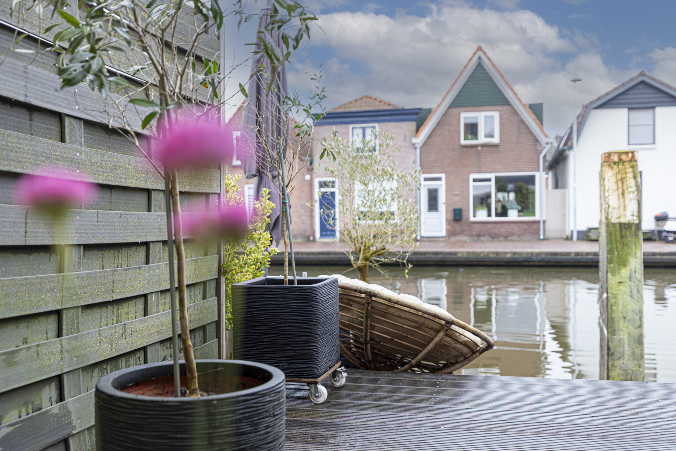 De zonnige achtertuin, vrijwel volledig op het zuiden gelegen, grenst direct aan het water. De tuin is deels overdekt en voorzien van een houten vlonder. Deze heerlijk buitenruimte biedt een unieke plek om volop te genieten van het wonen aan het water en het voorbijvaren van bootjes.