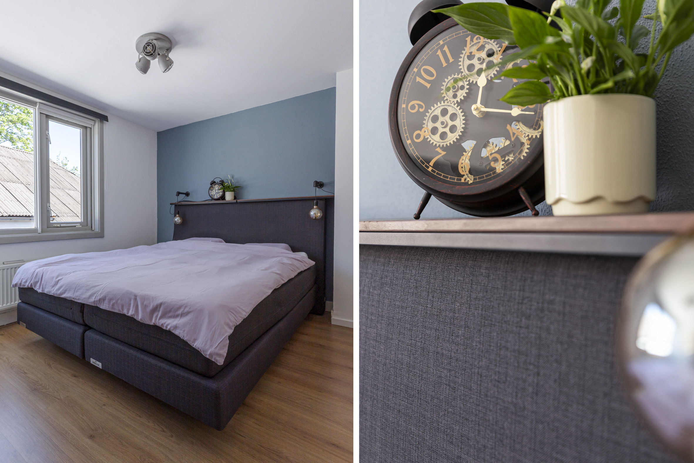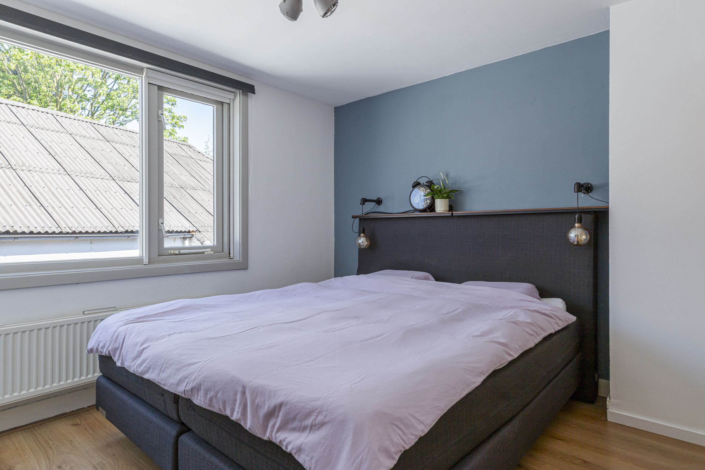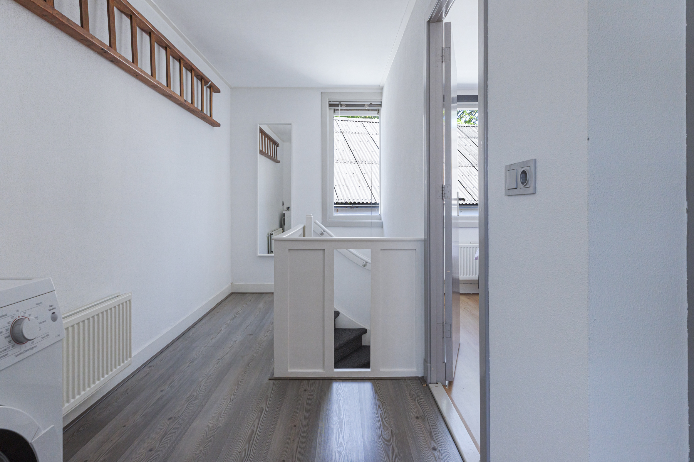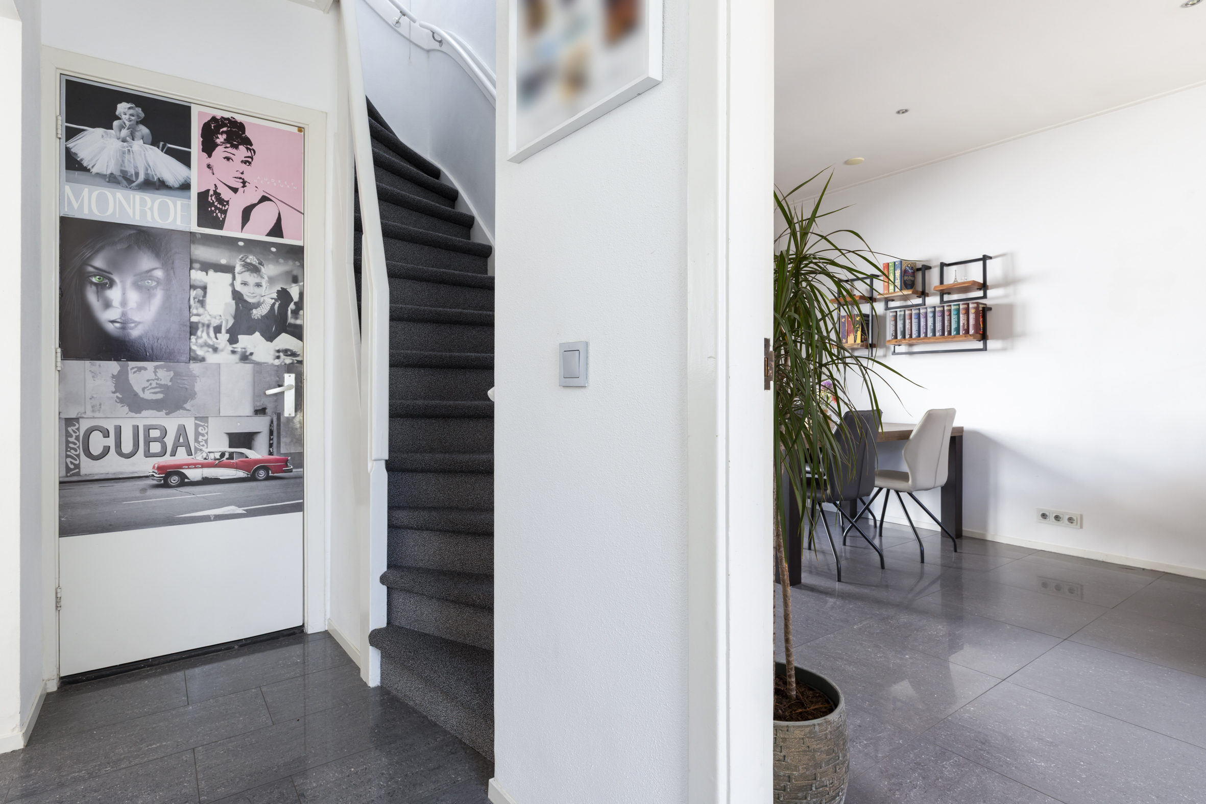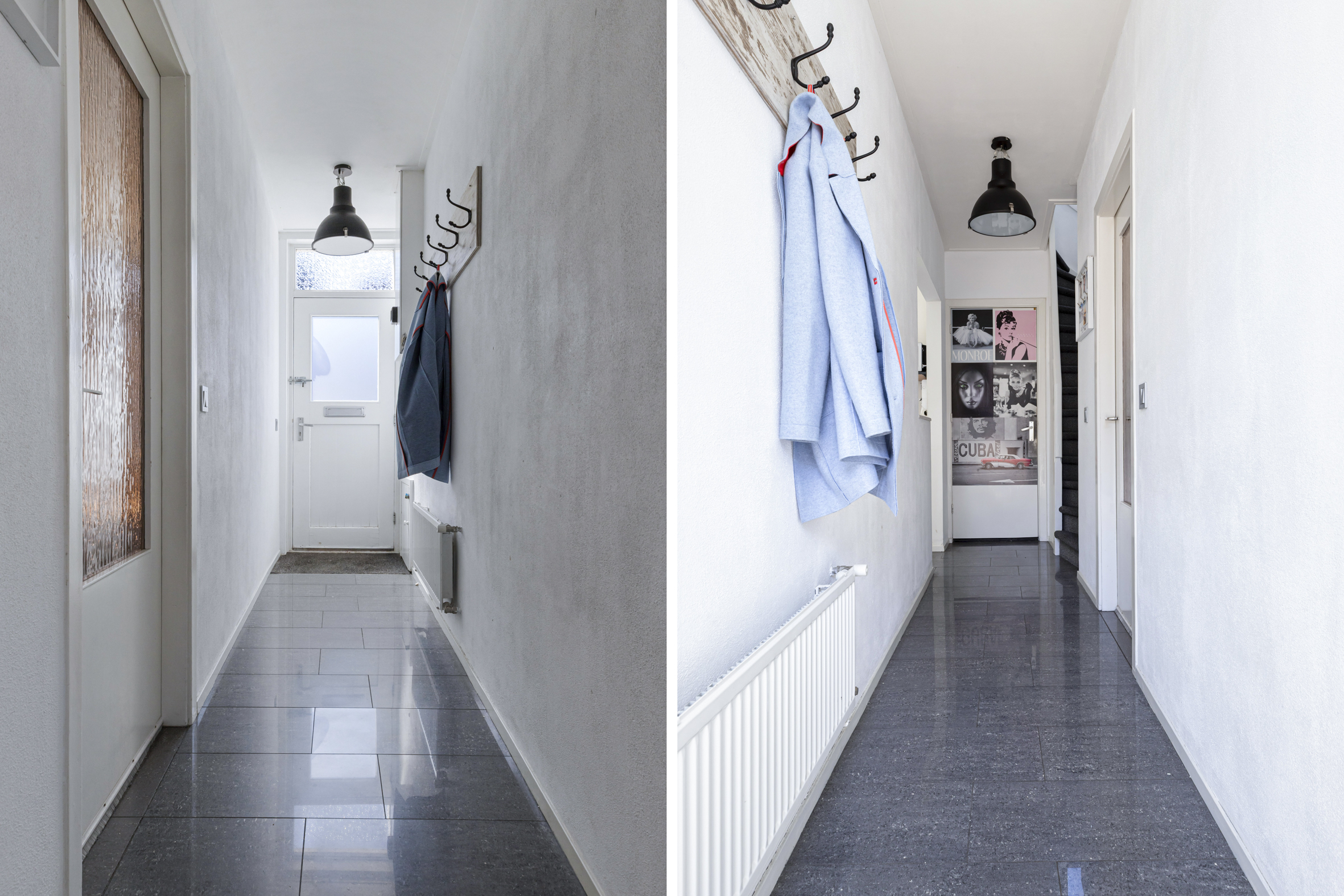 De voortuin is ingericht als parkeerplaats en er is een houten fietsenberging met elektra geplaatst. De lange hal is licht door het raam boven de voordeur en is voorzien van de garderobe en de meterkast. Aan het einde vind je de trapopgang en de toiletruimte. De woonkamer is apart van de keuken en heeft met 26 m² een ruim formaat. Er zijn grote raampartijen en openslaande deuren naar de knusse patiotuin.