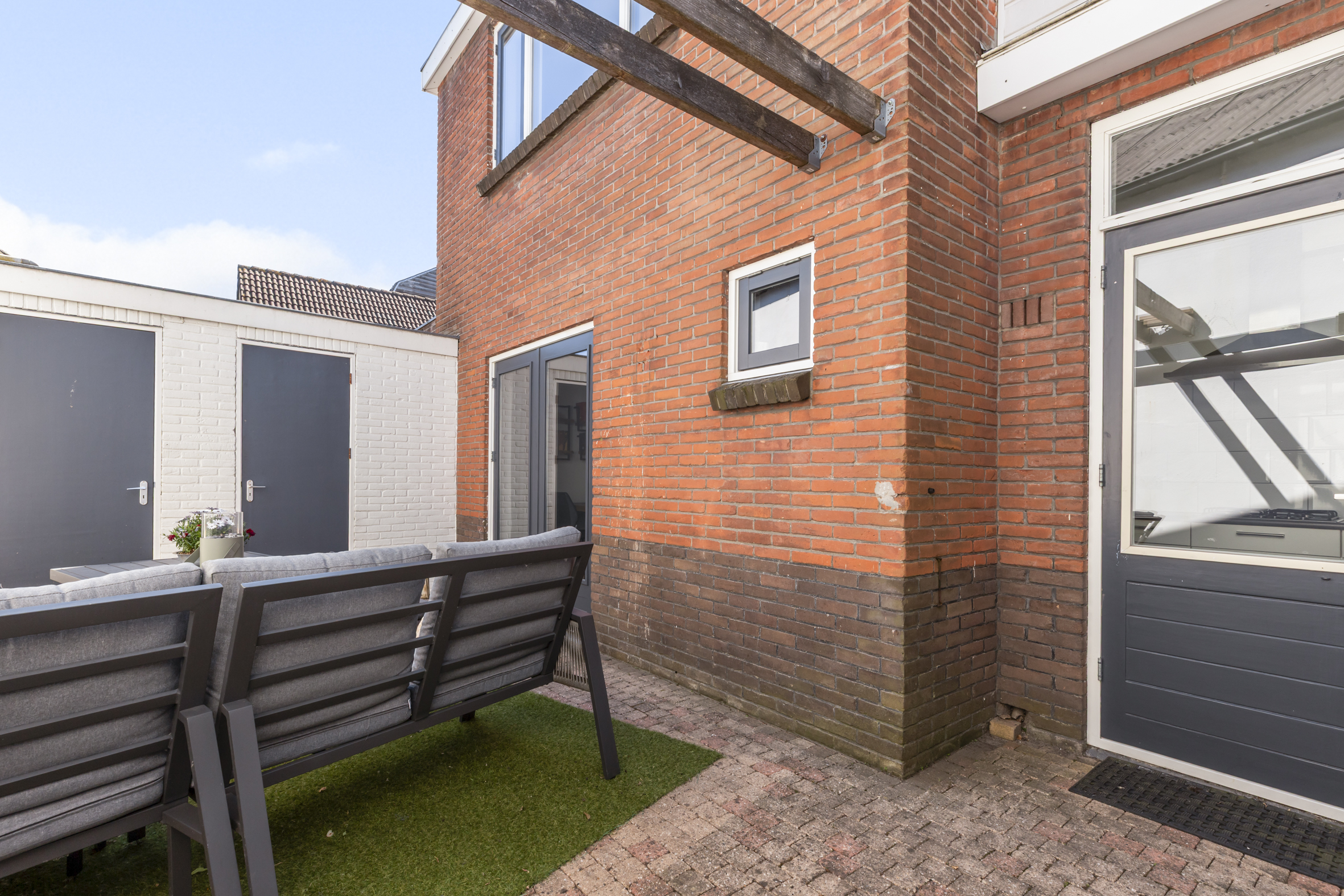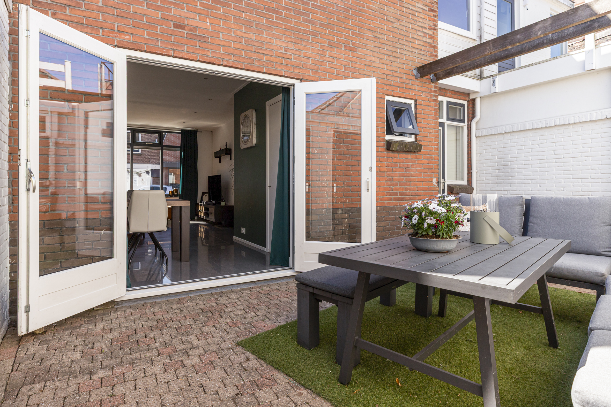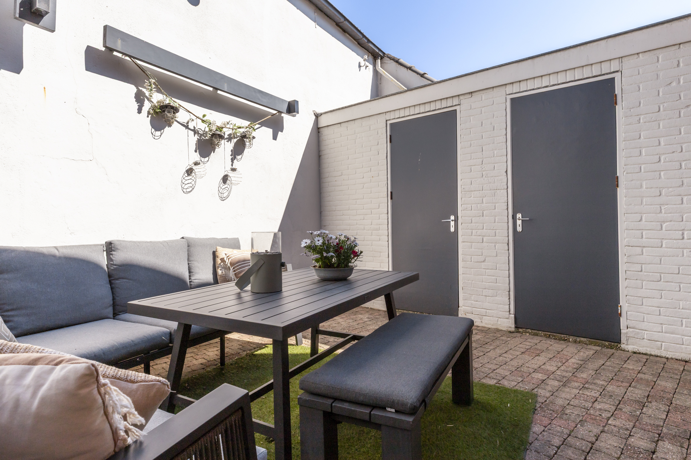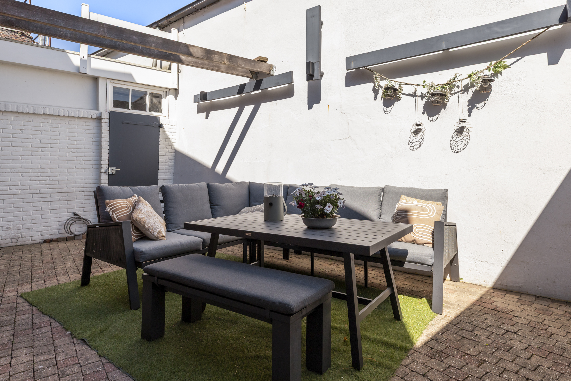 De omsloten achtertuin is knus en onderhoudsvriendelijk aangelegd. Er is een achterom en een eigen fietsenberging met elektra.