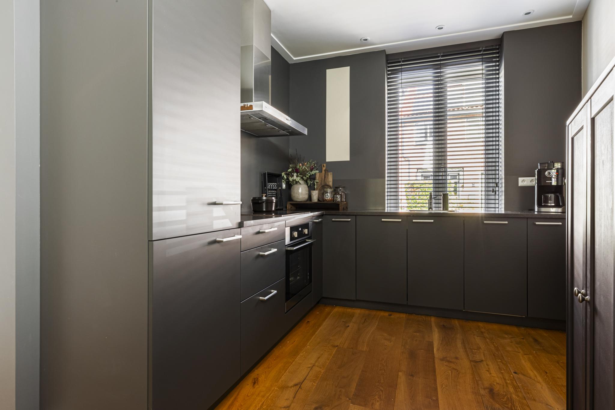 Aan de voorzijde is de open keuken gelegen met een moderne keuken in hoekopstelling en voorzien van de volgende inbouwapparatuur: