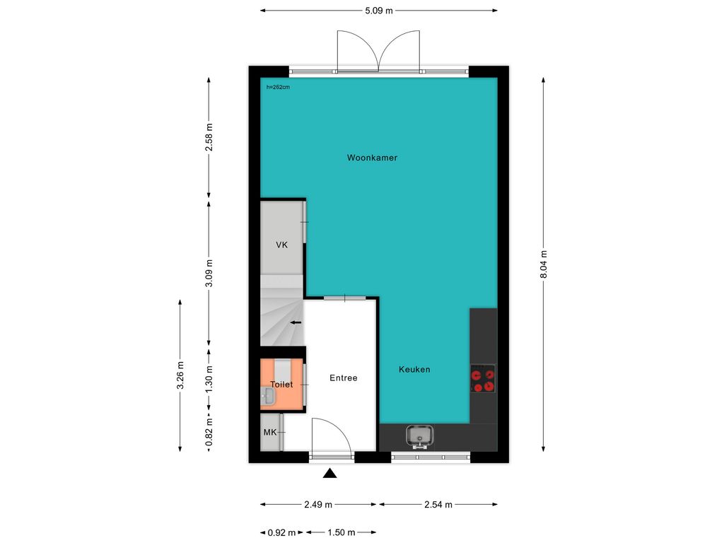 Vanuit de voortuin kom je via de overdekte voordeur in de hal. Hier vind je de meterkast, de toiletruimte, de trapopgang en de deur naar de woonkamer. De openslaande deuren naar de achtertuin zorgen voor een fijne lichtinval. Aan de voorzijde vind je de L-vormige keuken, voorzien van de volgende inbouwapparatuur: