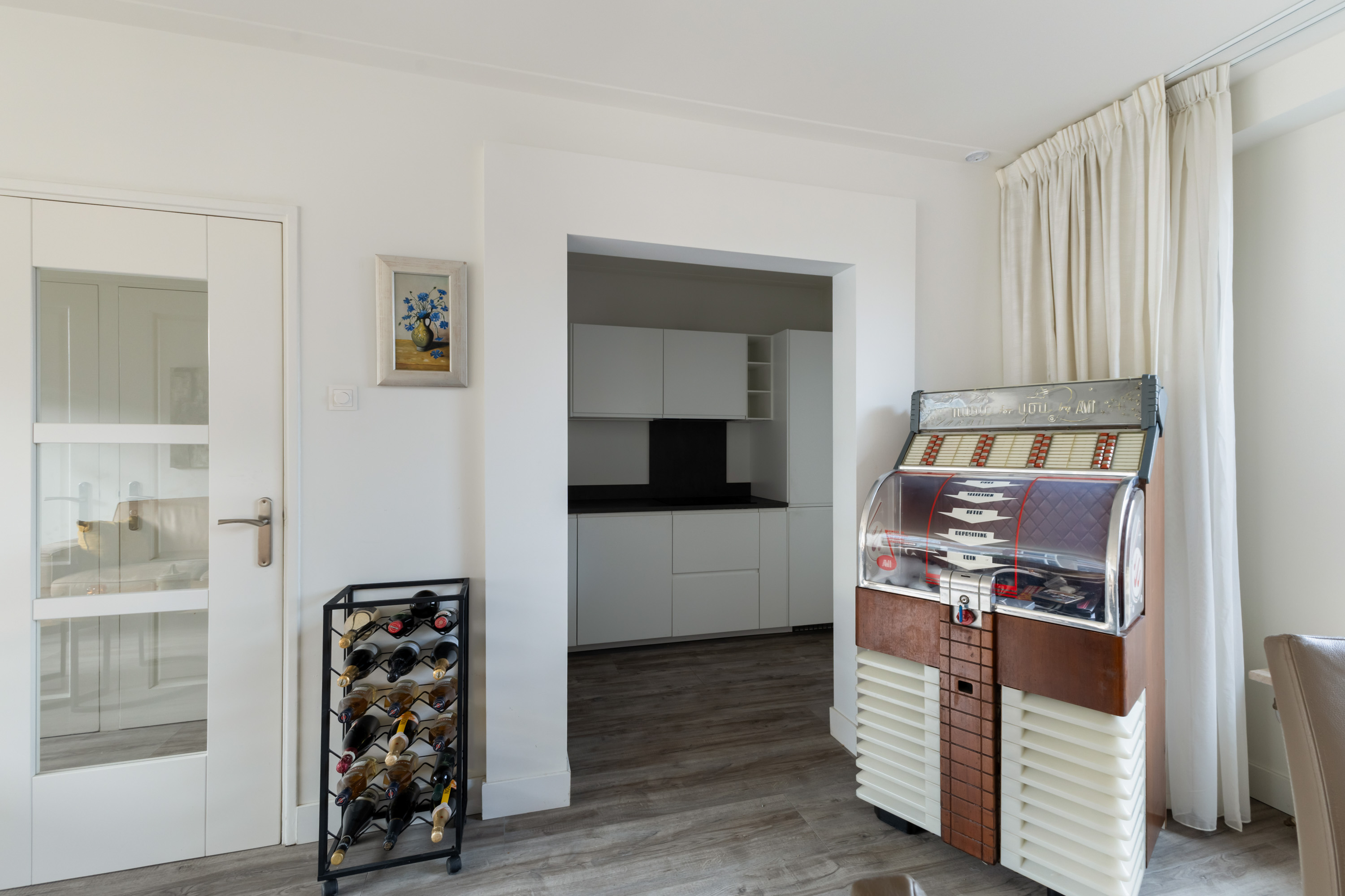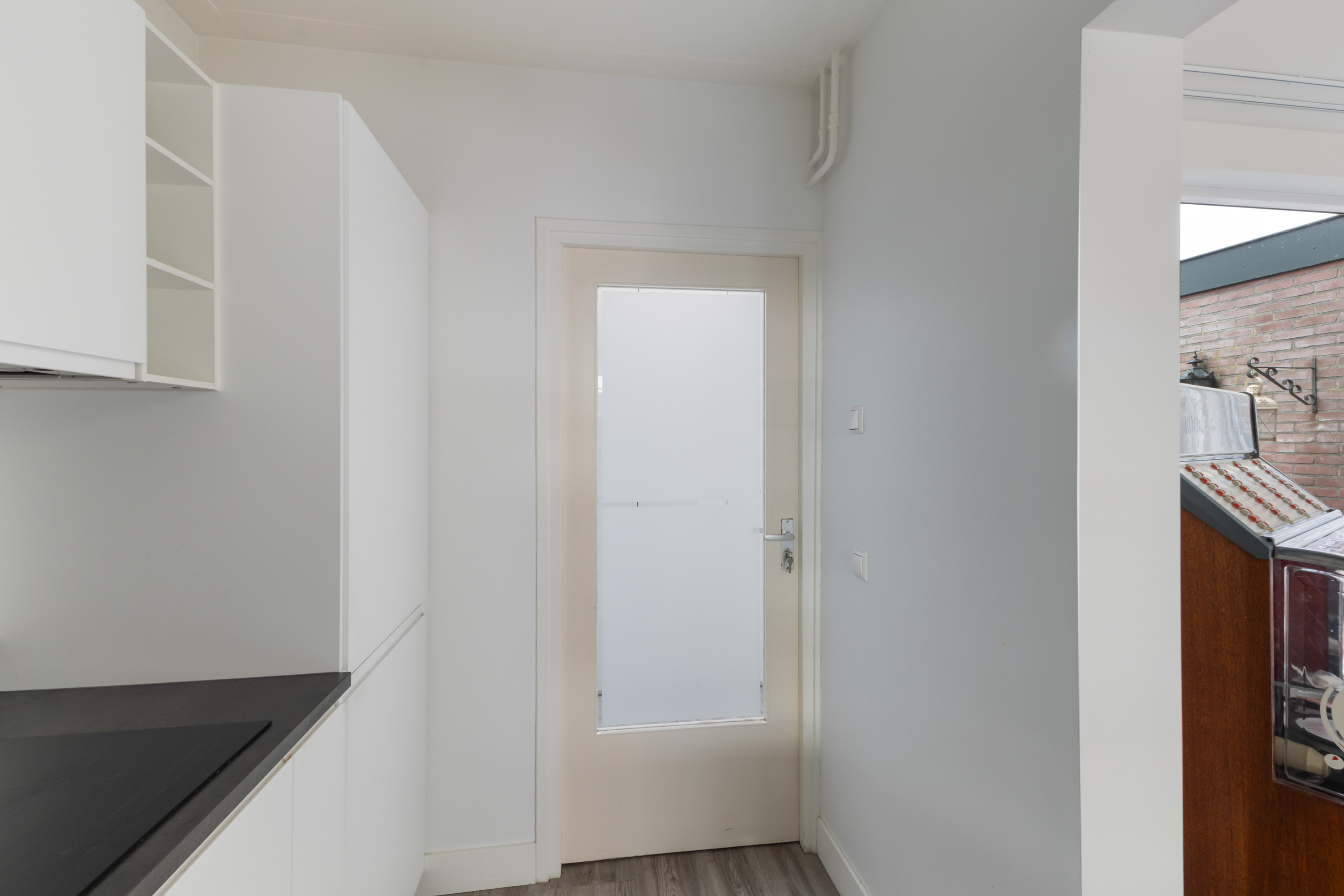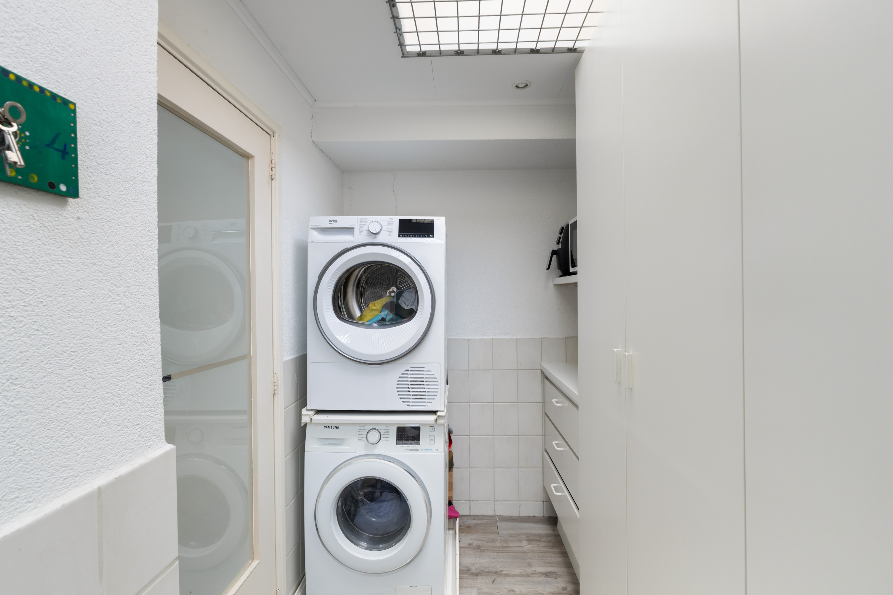 Vanuit de keuken kan je naar de bijkeuken in de aanbouw waar de wasmachine en droger zijn opgesteld en vanwaar je de achtertuin bereikt. Verder heeft de bijkeuken een dakkoepel voor extra licht en een vaste kastenwand met volop bergruimte.