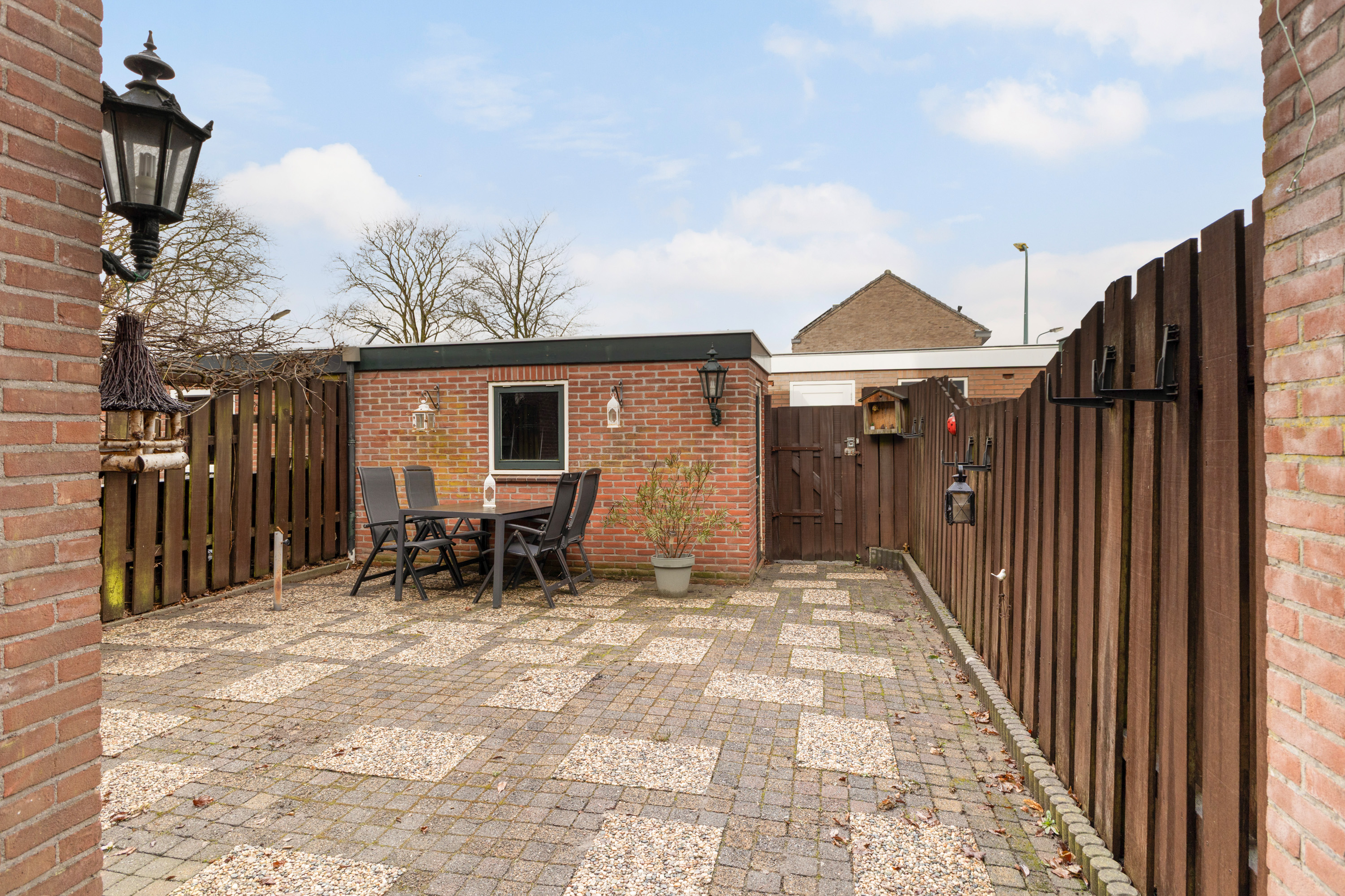 Achterin de tuin staat de stenen fietsenberging, voorzien van elektra. Daarnaast vind je de poortdeur naar de achtergelegen steeg met toegang tot de straat.