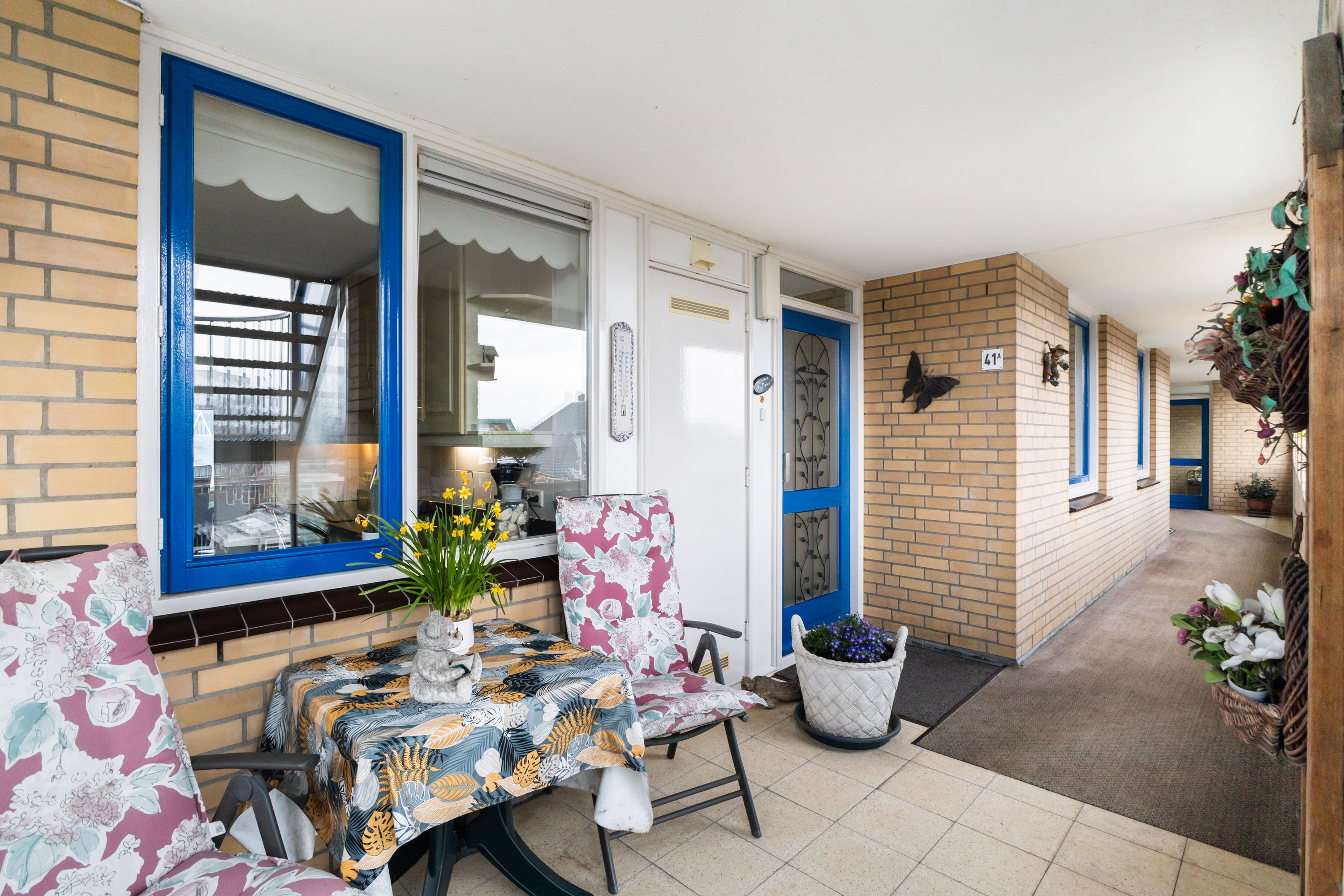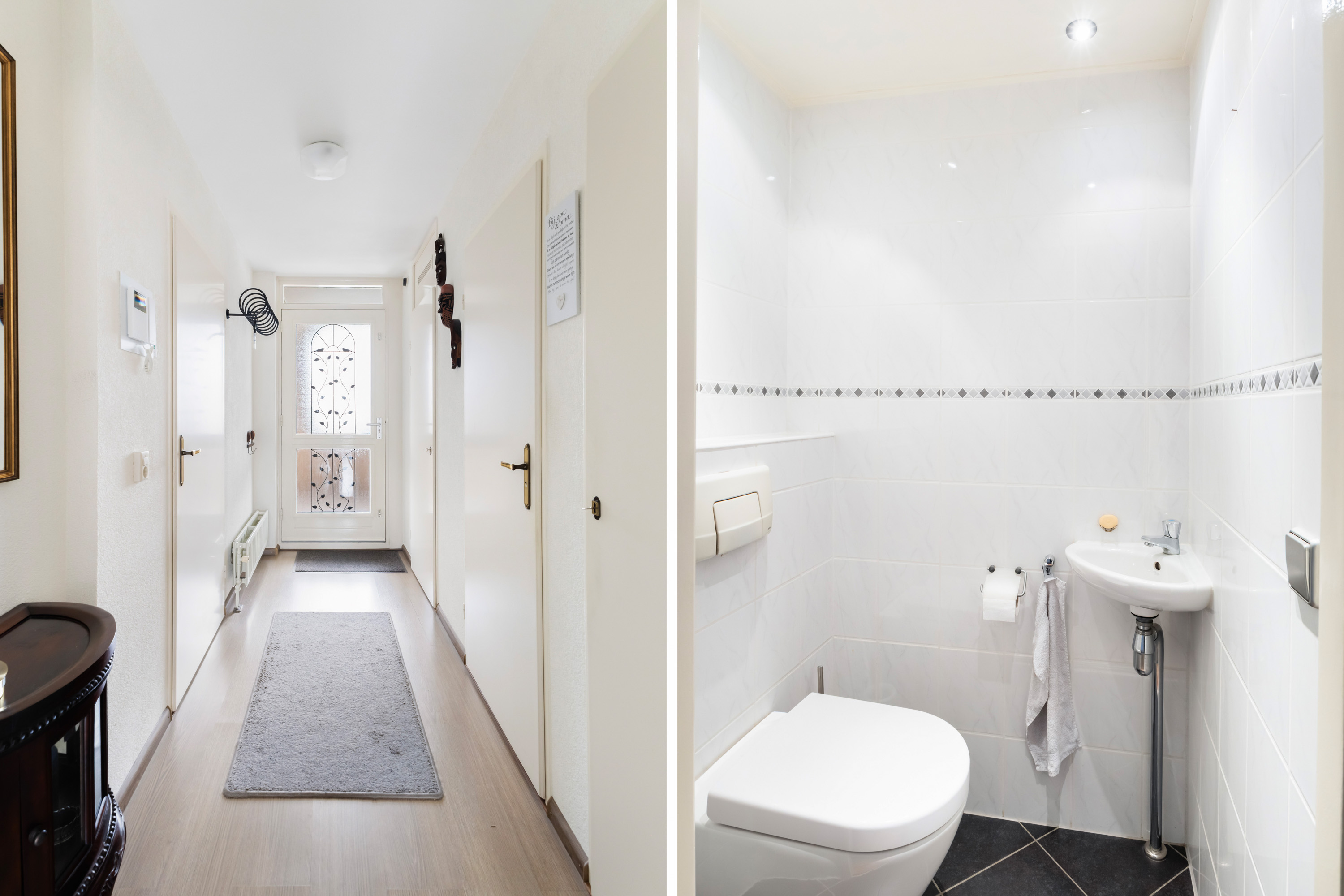De voordeur van het appartement is bereikbaar via de eigen galerij. De meterkast bevindt zich aan de buitenzijde, naast de voordeur. Bij binnenkomst in de hal is er een bergkast met de opstelplaats van de CV-ketel, de toiletruimte, een extra vaste kast en toegang tot de woonkamer en de slaapkamer aan de voorzijde.
