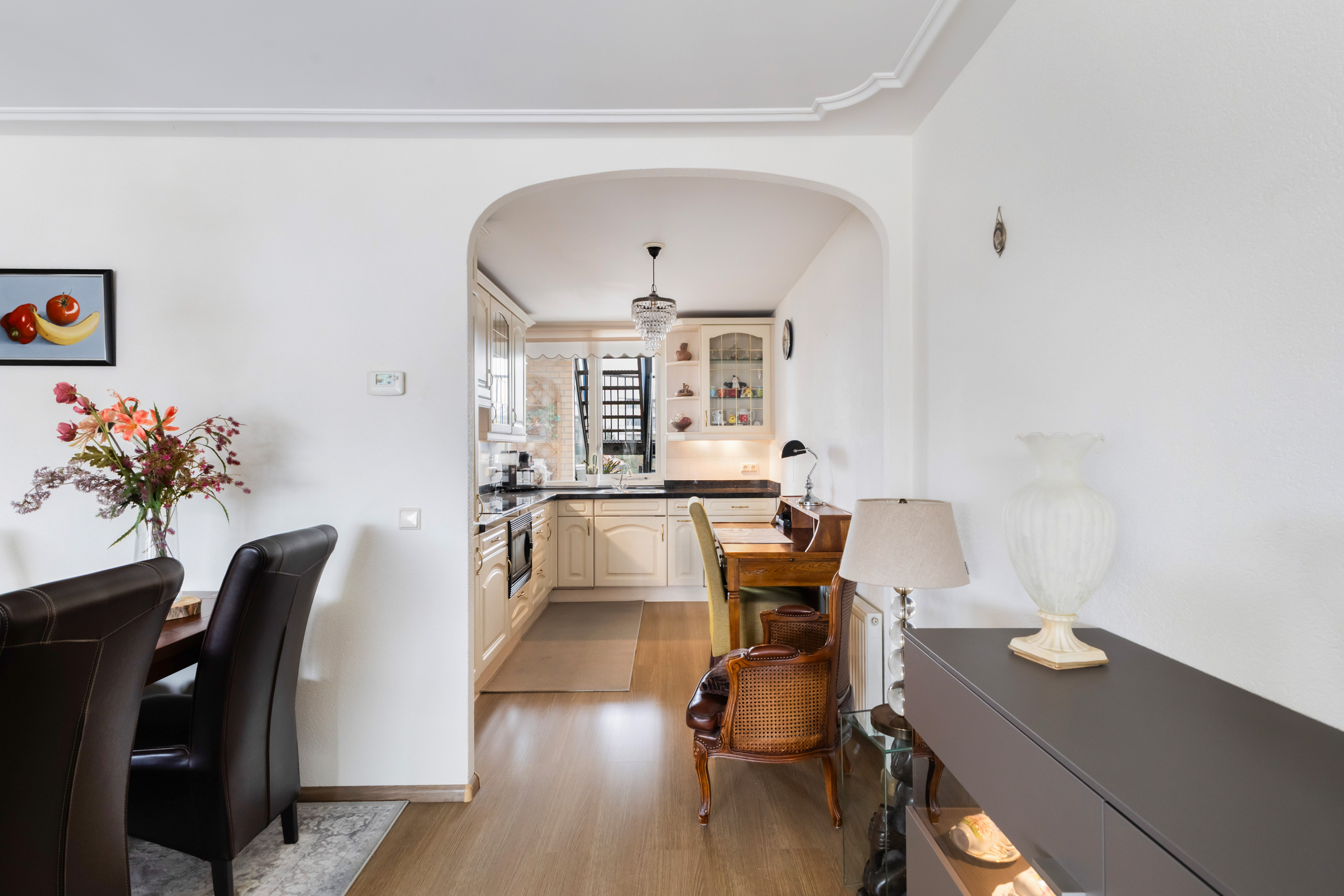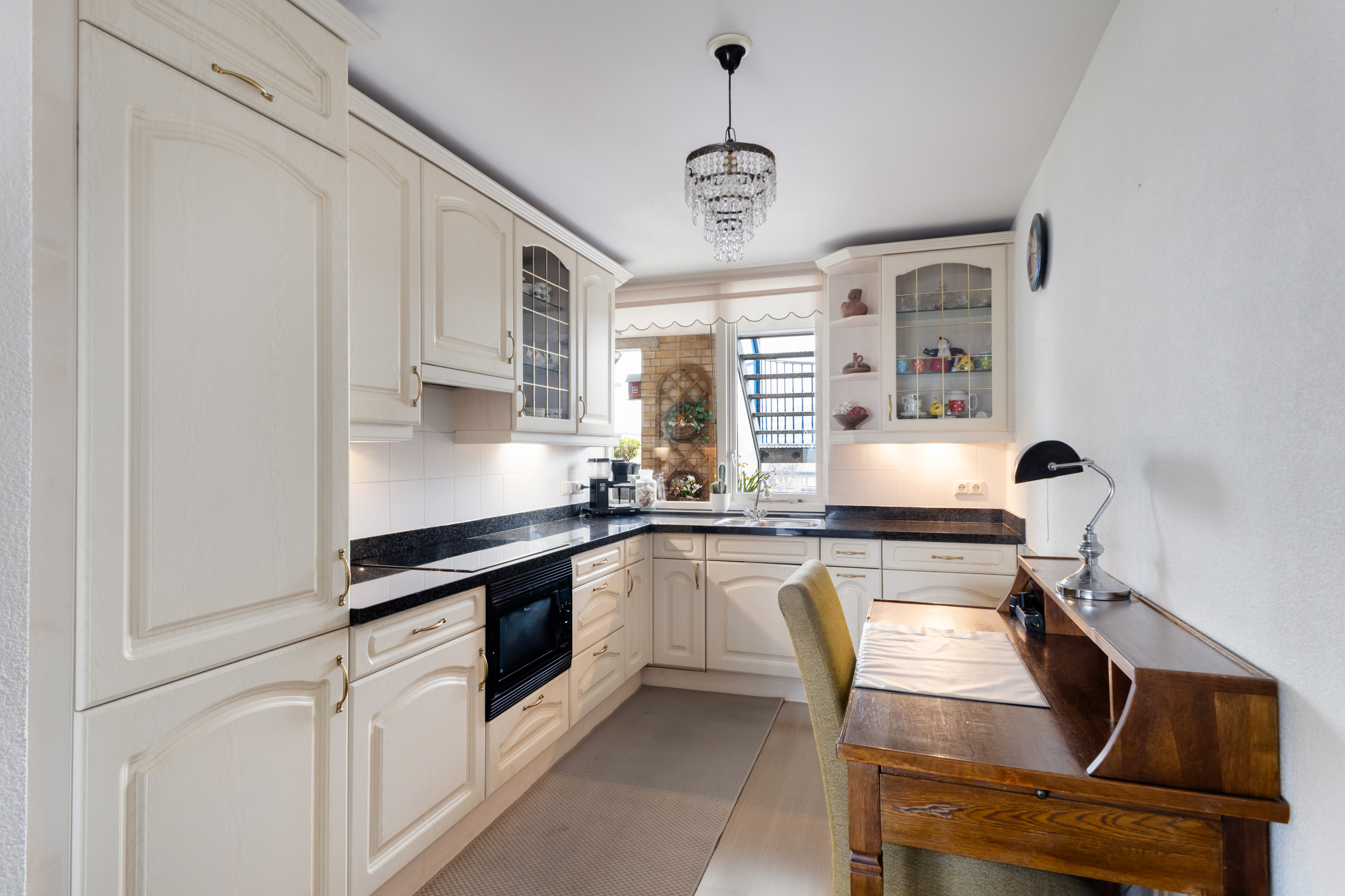 Aansluitend aan de woonkamer ligt de open keuken aan de galerijzijde. De L-vormige keuken beschikt over veel werk- en opbergruimte. De keuken beschikt verder over een inductiekookplaat, afzuigkap, combi-oven en koel-vriescombinatie.