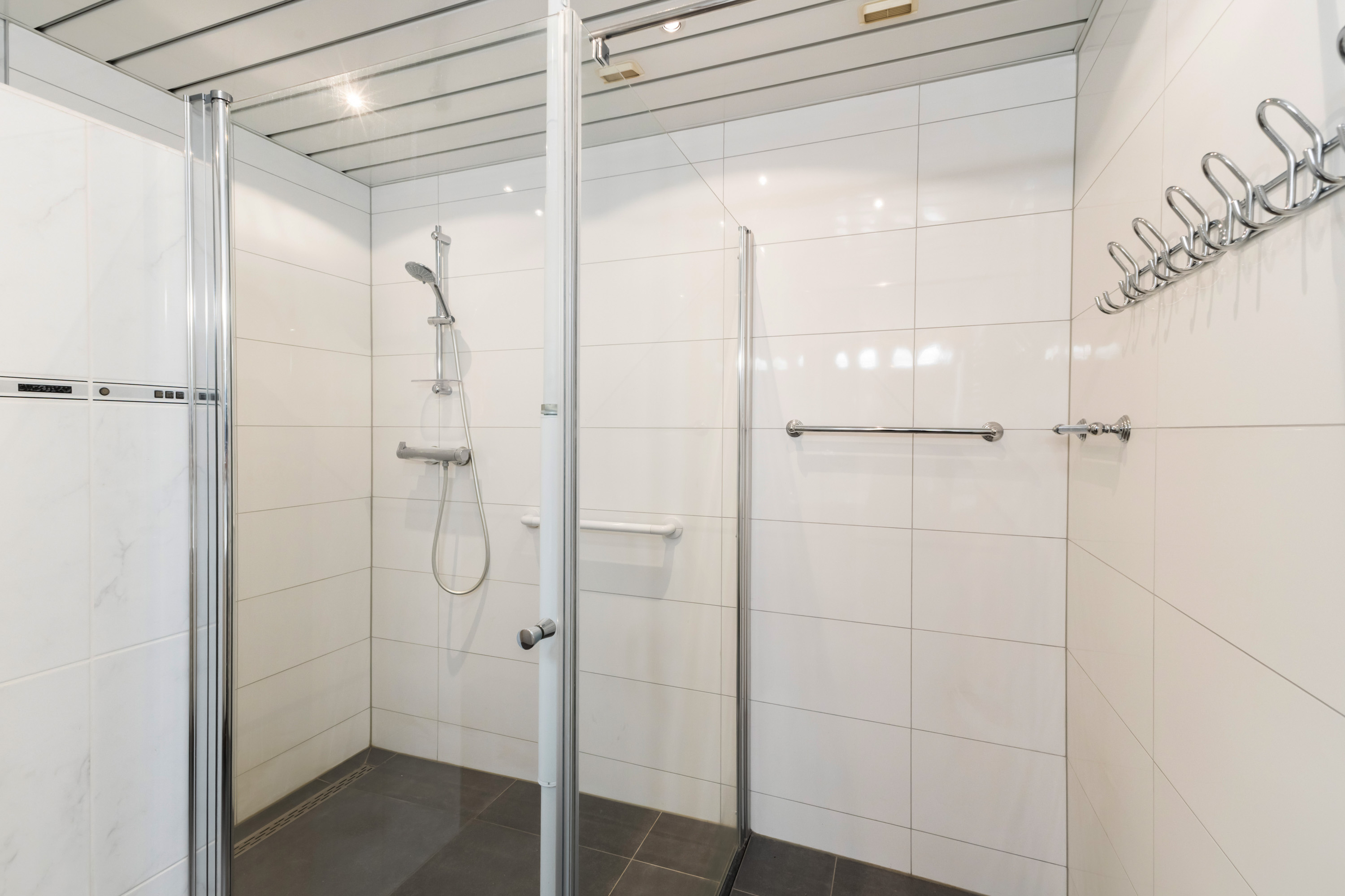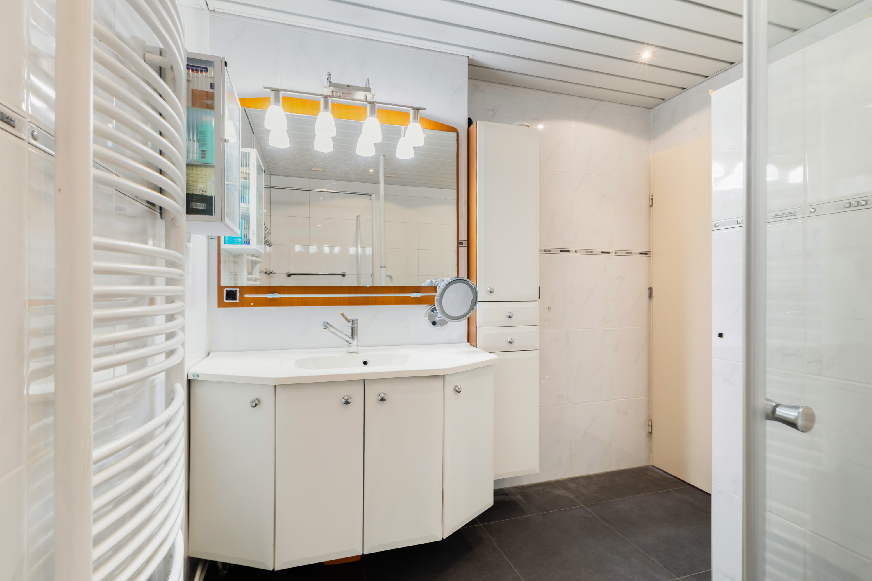 Vanuit de woonkamer is de grote slaapkamer bereikbaar met een deur naar het balkon en een deur naar de badkamer. De badkamer is gedeeltelijk opnieuw betegeld en voorzien van een inloopdouche, wastafelmeubel, handdoekenradiator en de aansluitingen voor de wasapparatuur.