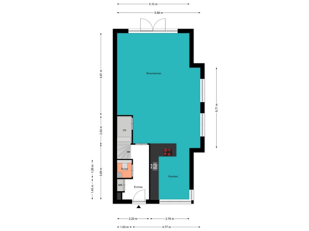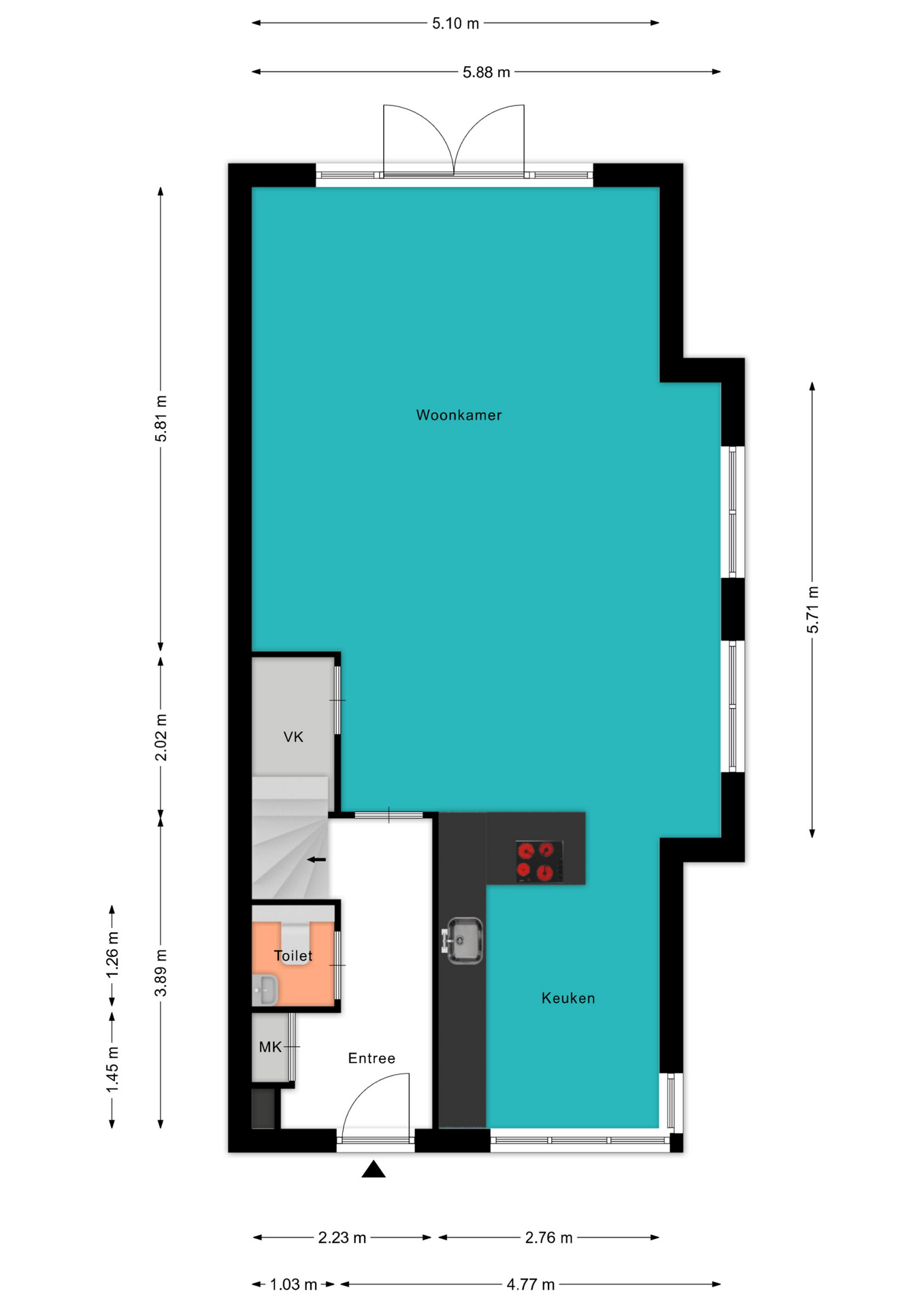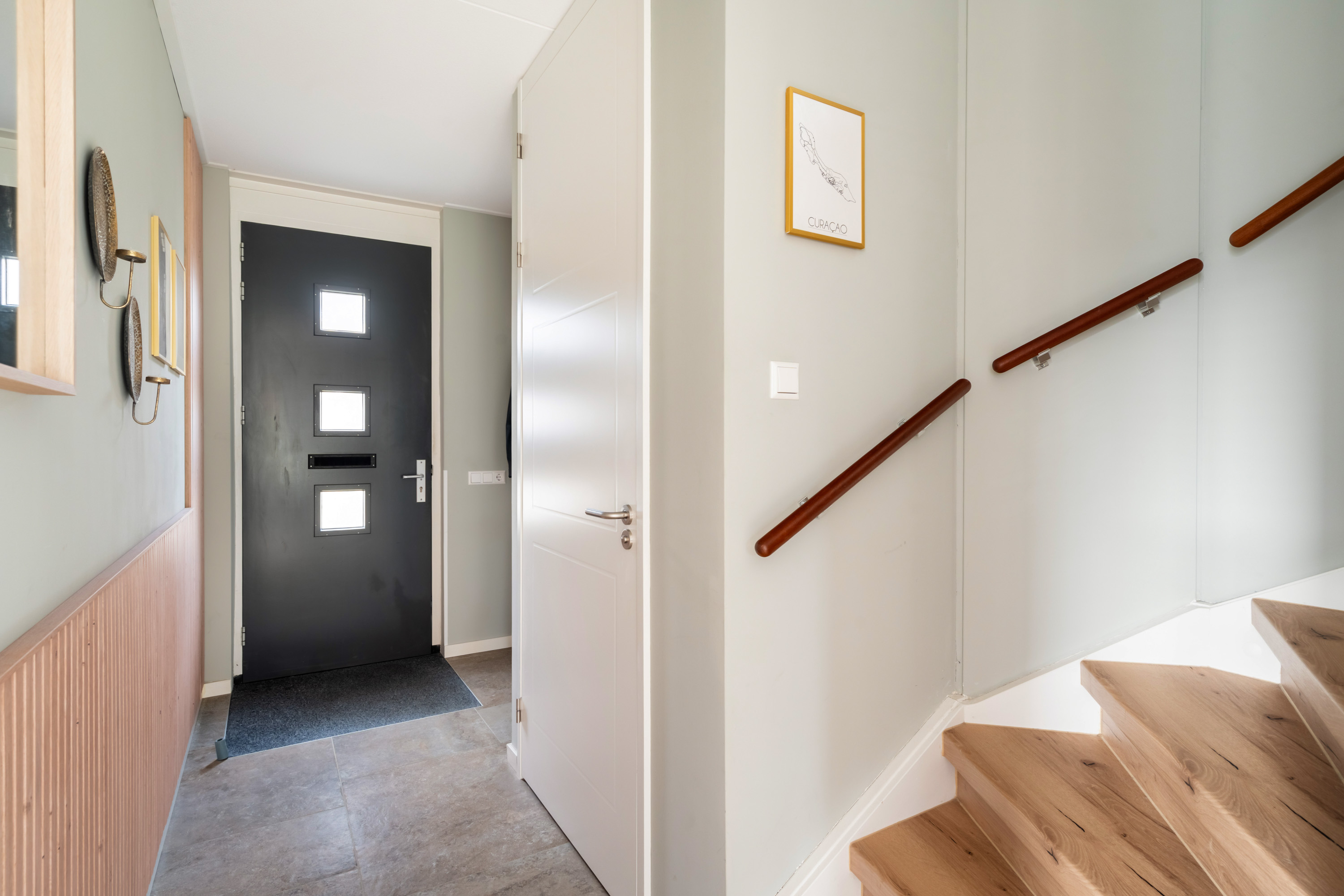 De auto kun je eenvoudig op de eigen parkeerplaats of aan de zijkant van de woning parkeren. Via de voortuin bereik je de voordeur. Bij binnenkomst in de hal vind je de meterkast, de toiletruimte, de trapopgang en de deur naar de woonkamer.