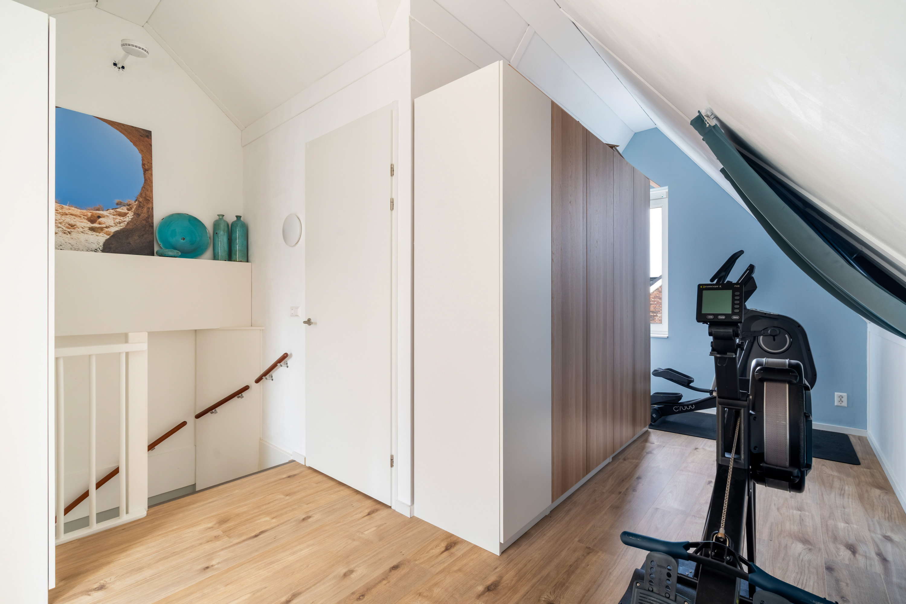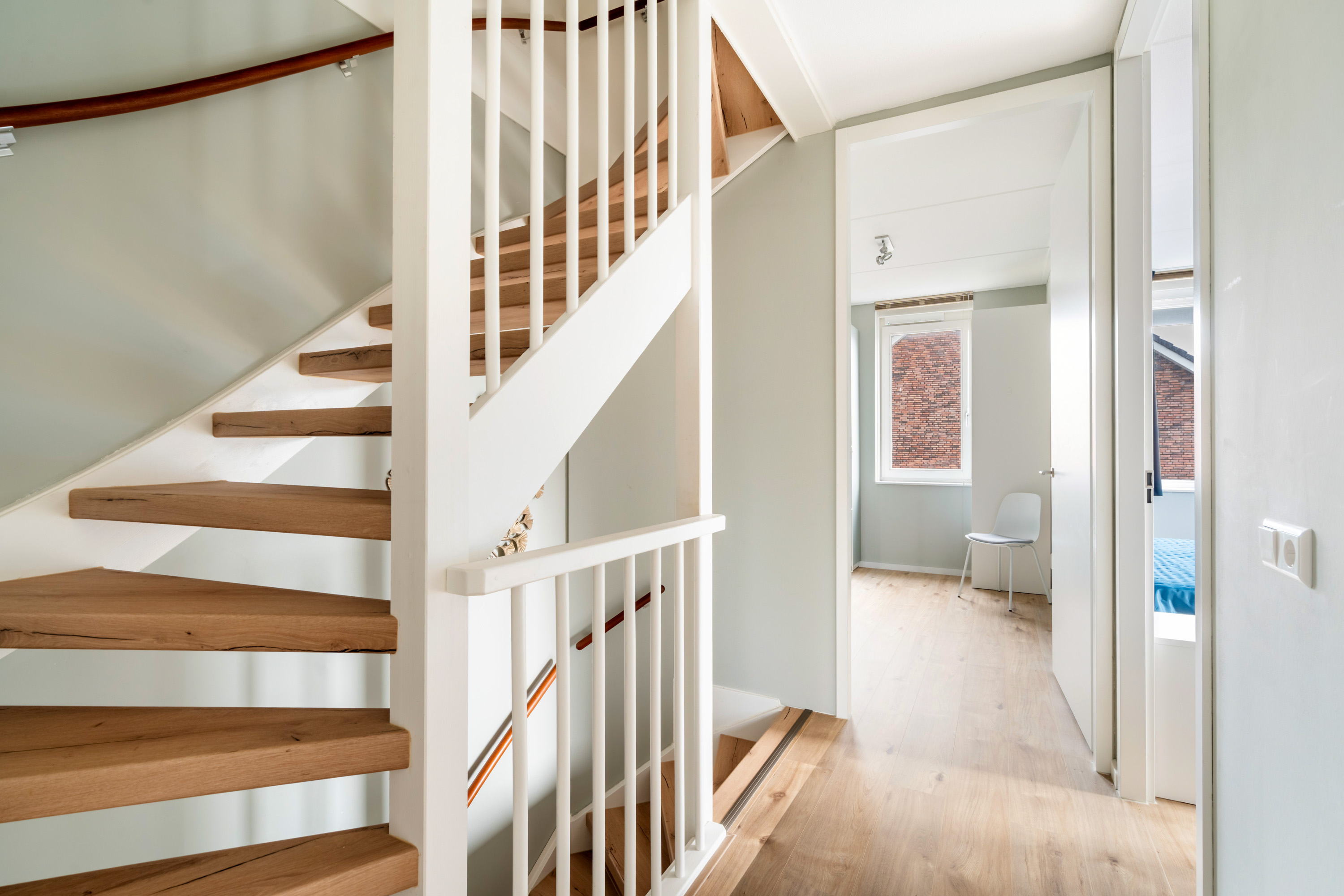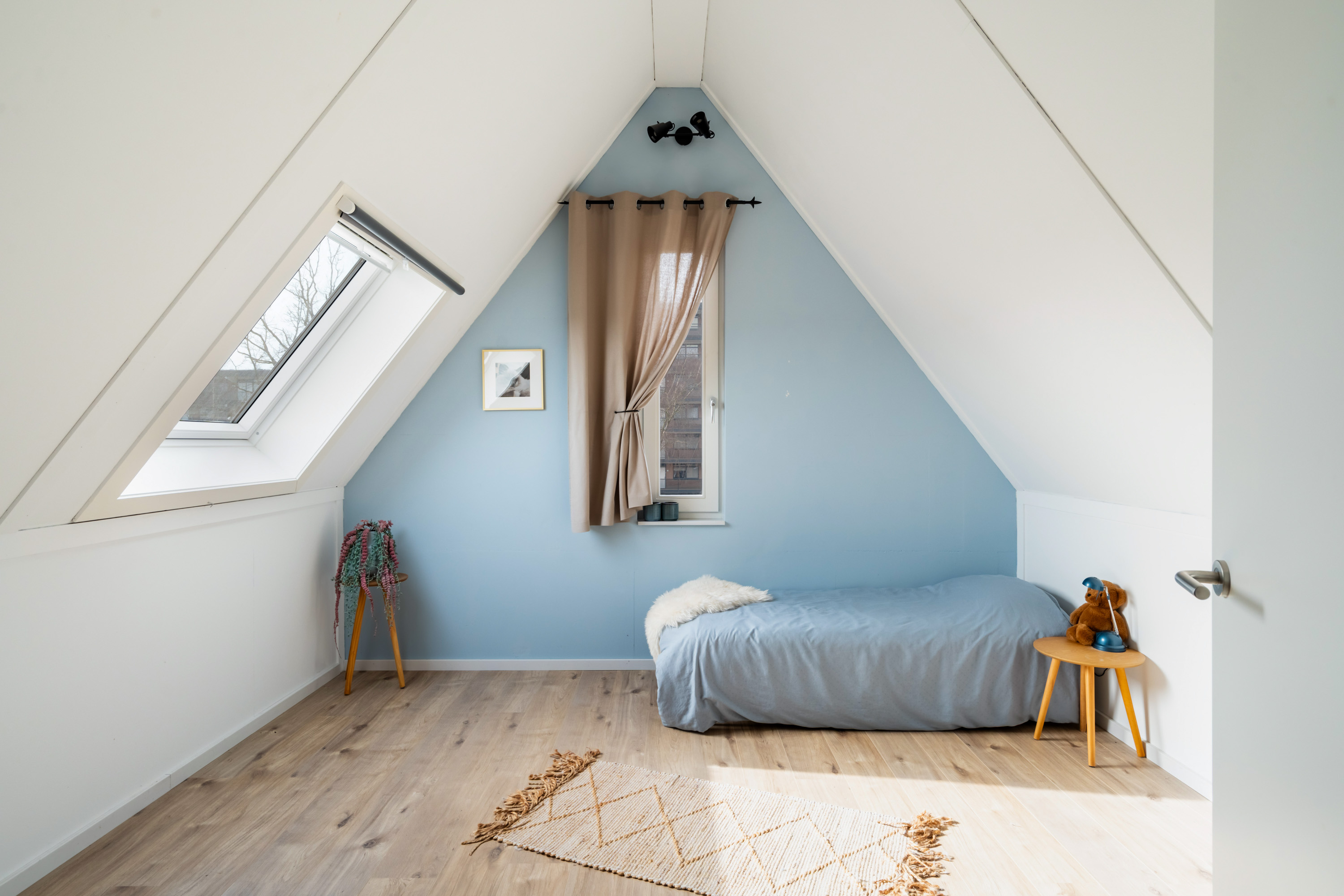 Vanaf de ruime overloop bereik je de vierde slaapkamer en de was/techniekruimte. De slaapkamer ligt aan de voorzijde en is extra sfeervol door de hoge nok. De was/techniekruimte herbergt de binnen-unit van de warmtepomp, de mechanische ventilatiebox, de aansluitingen van de wasapparatuur en de omvormer van de zonnepanelen.