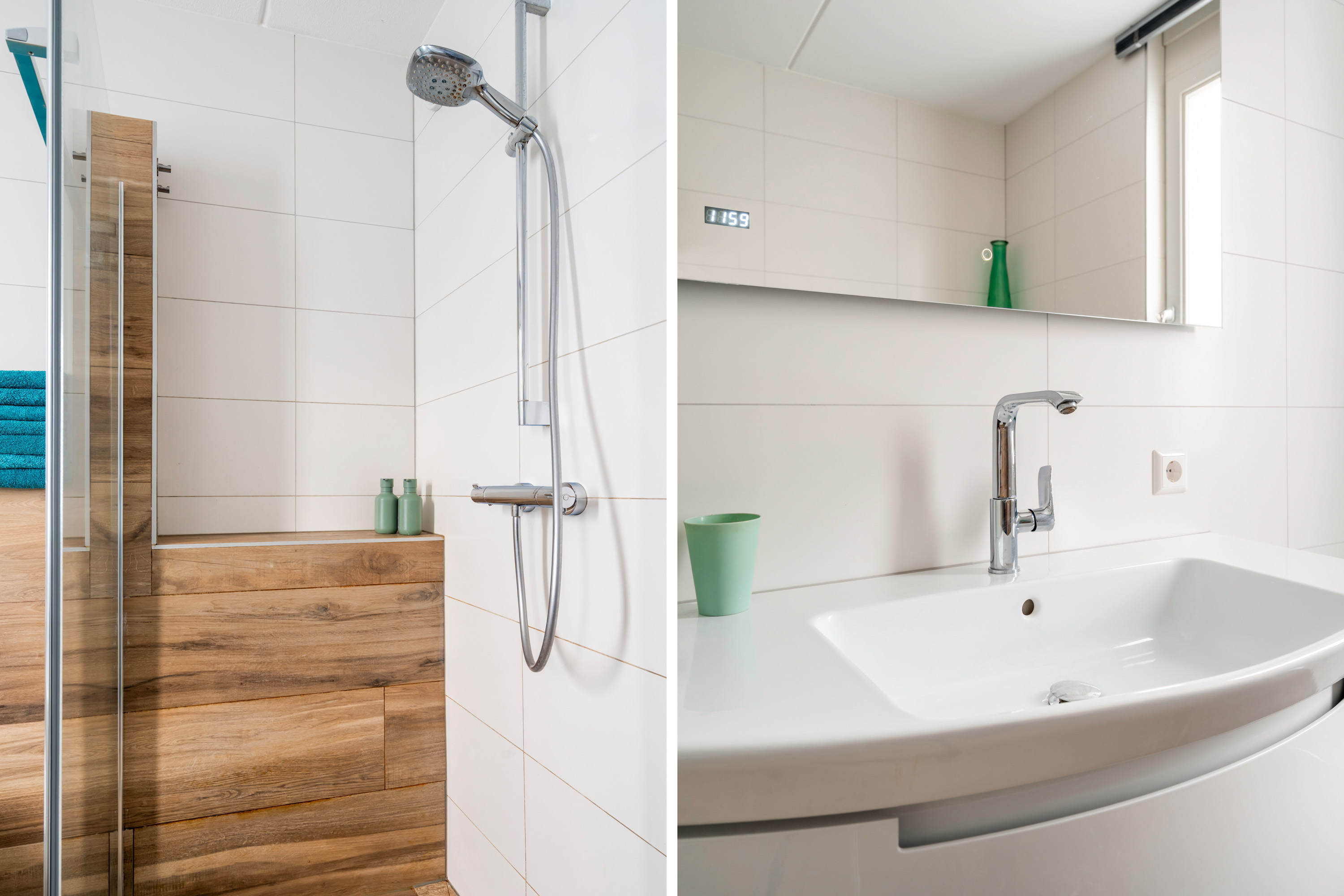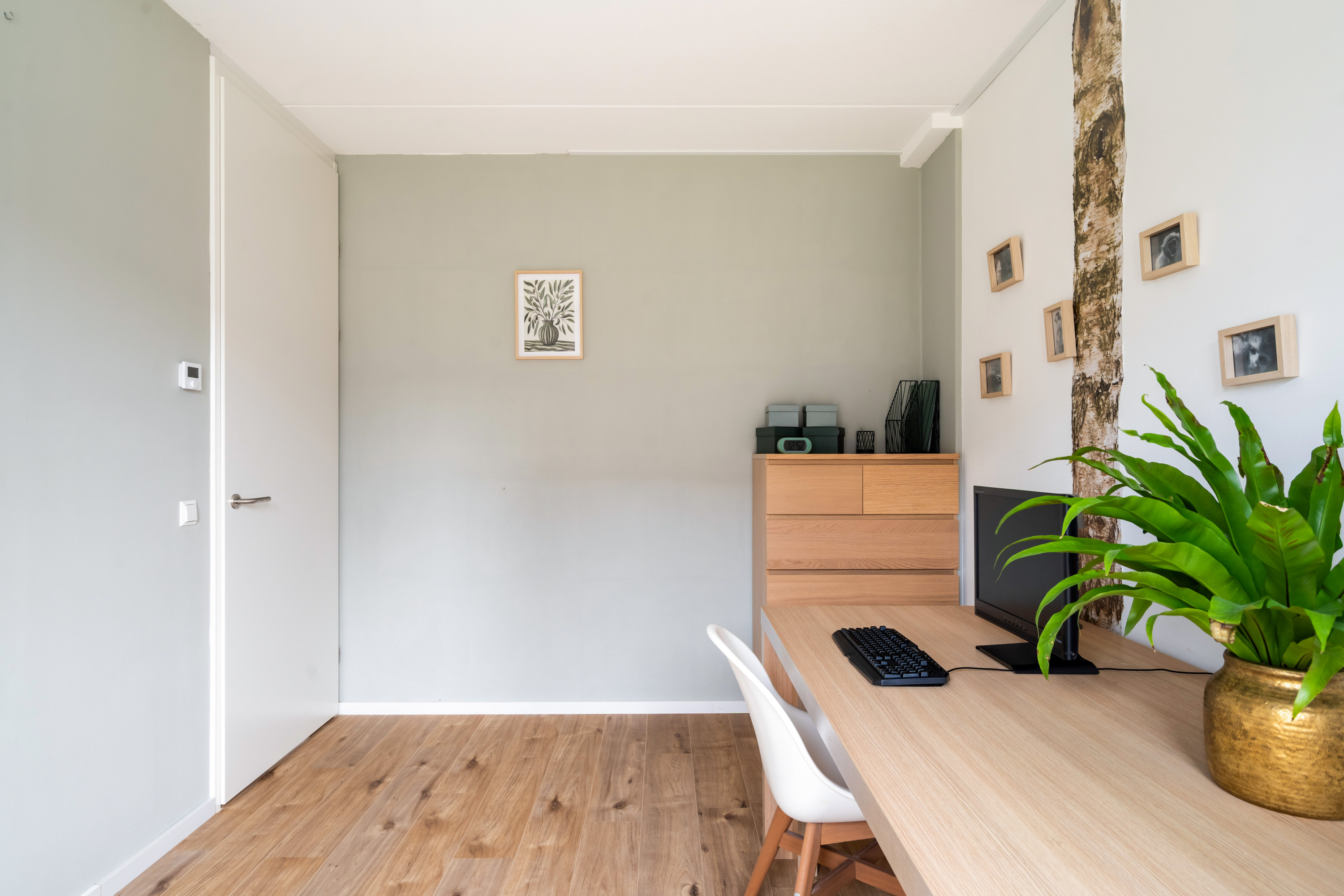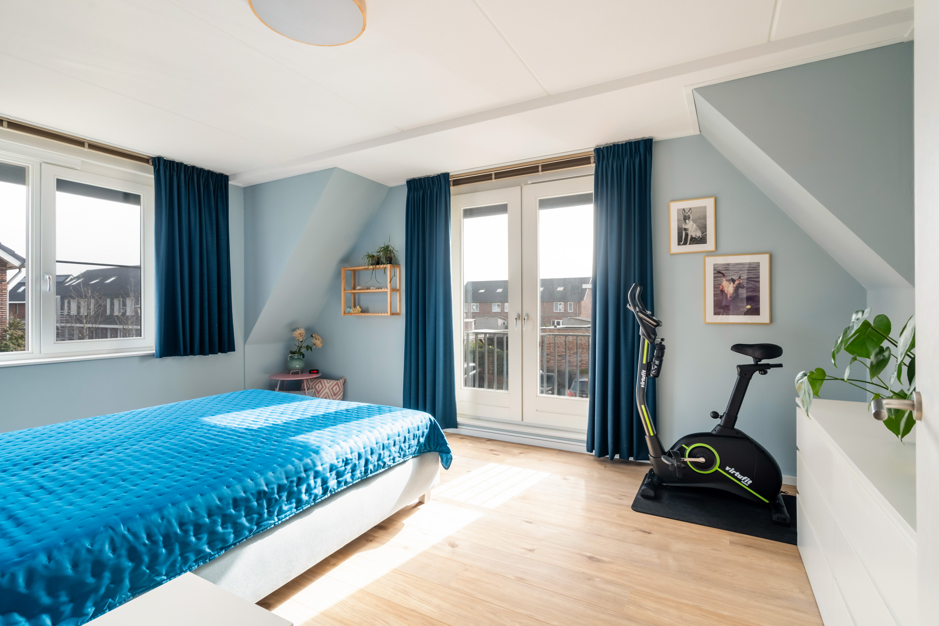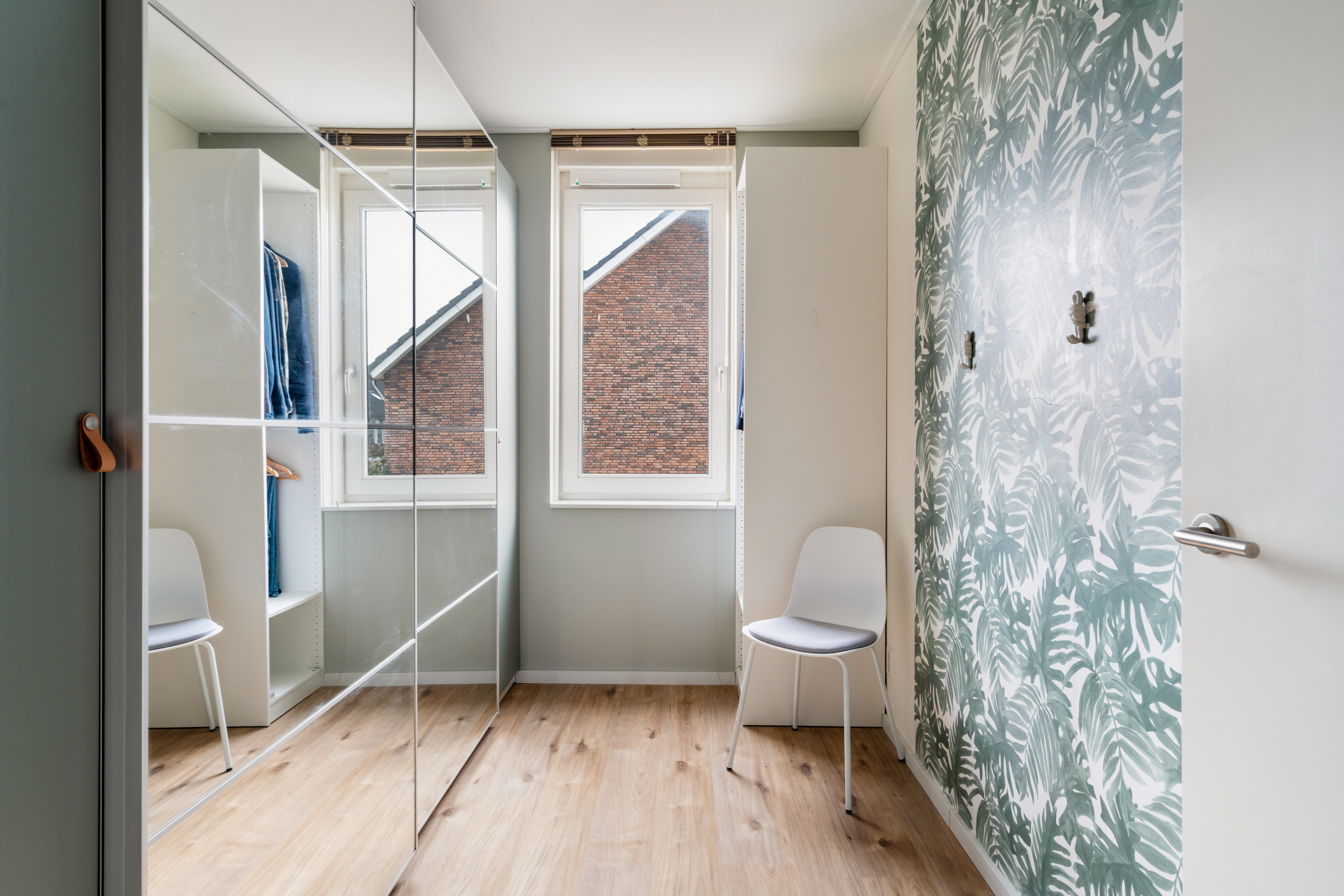Vanaf de ruime overloop bereik je de vierde slaapkamer en de was/techniekruimte. De slaapkamer ligt aan de voorzijde en is extra sfeervol door de hoge nok. De was/techniekruimte herbergt de binnen-unit van de warmtepomp, de mechanische ventilatiebox, de aansluitingen van de wasapparatuur en de omvormer van de zonnepanelen.