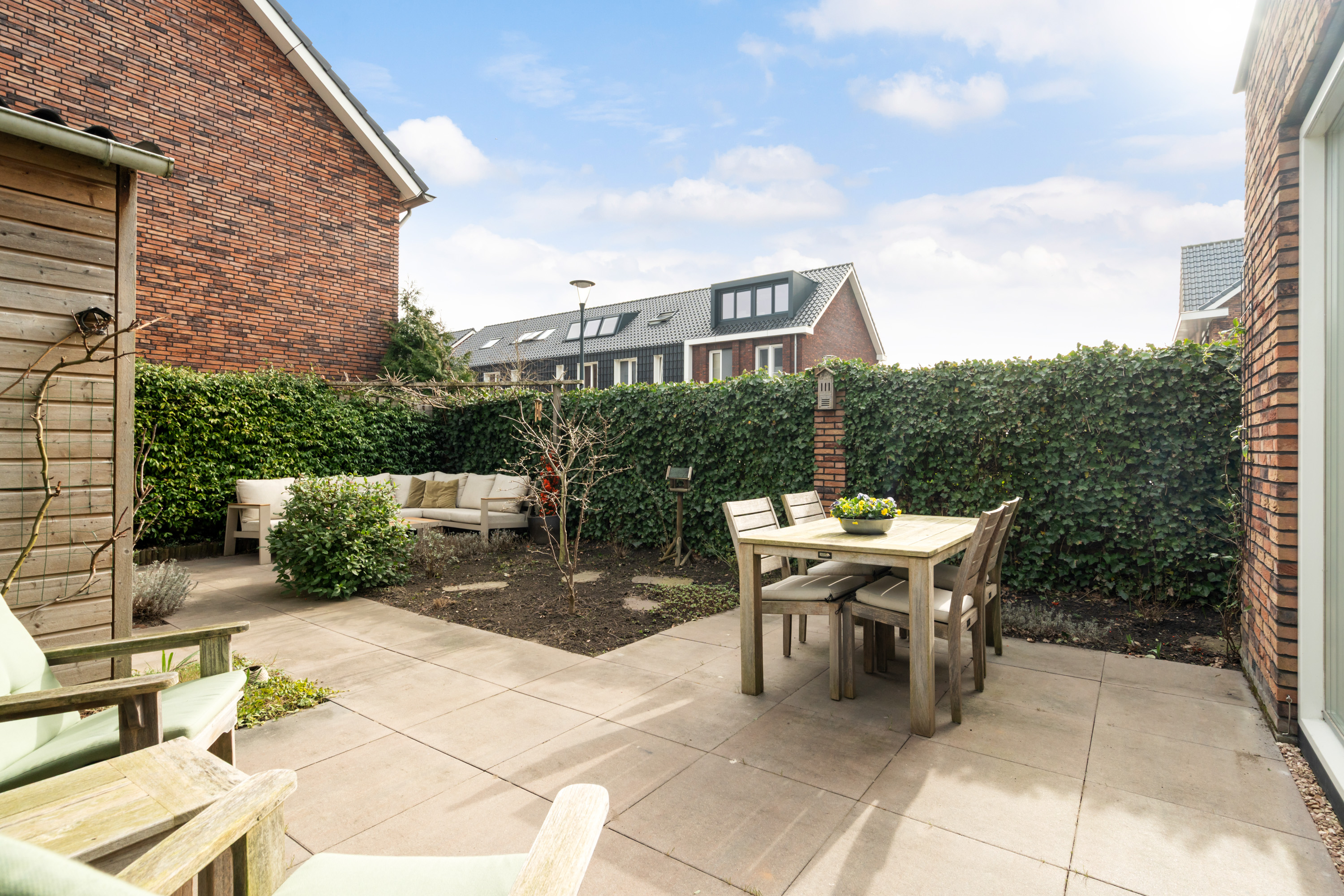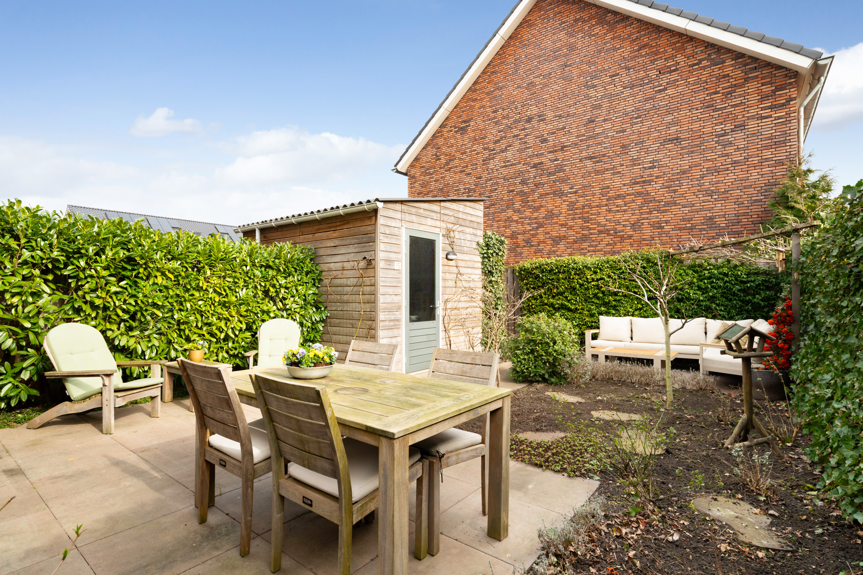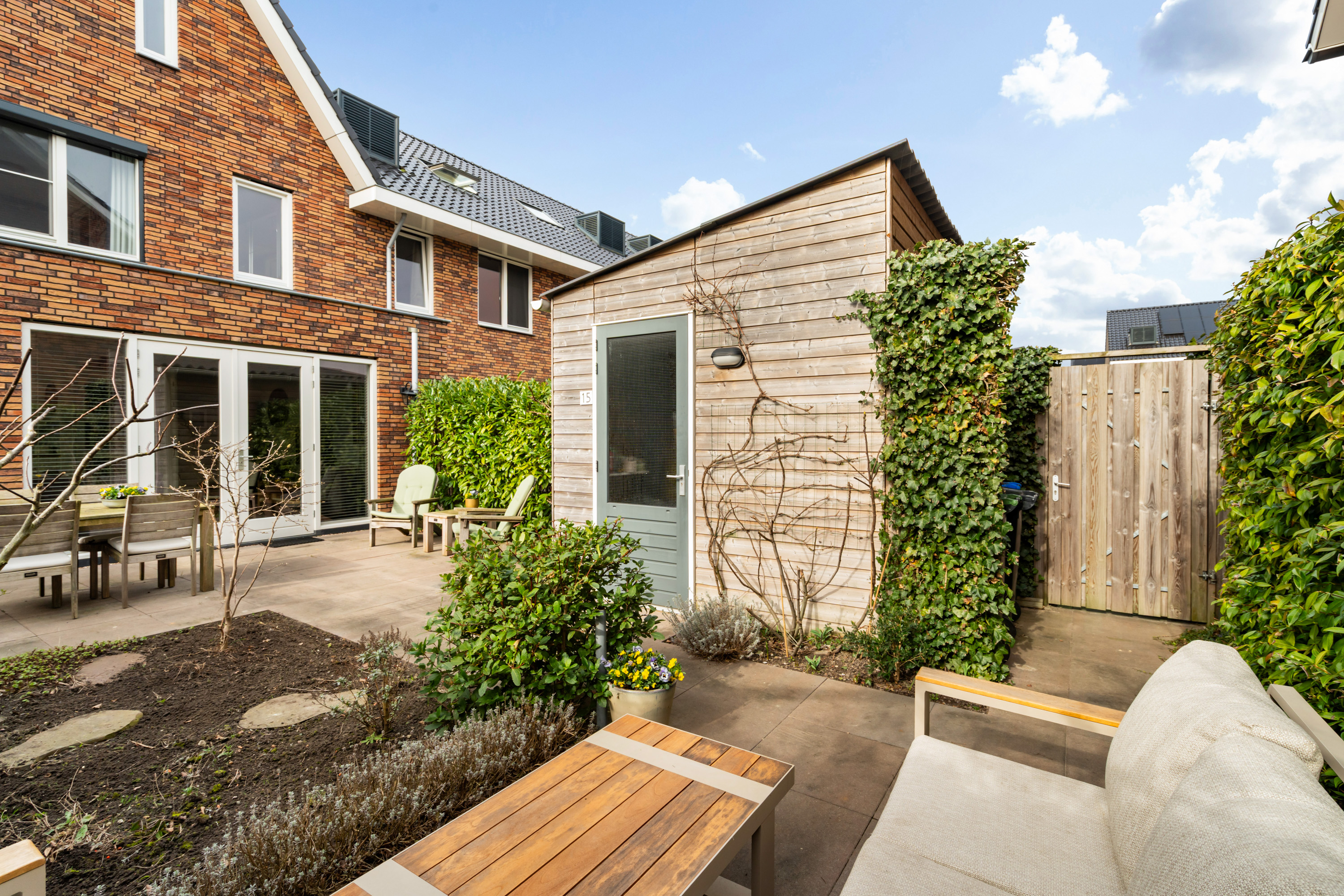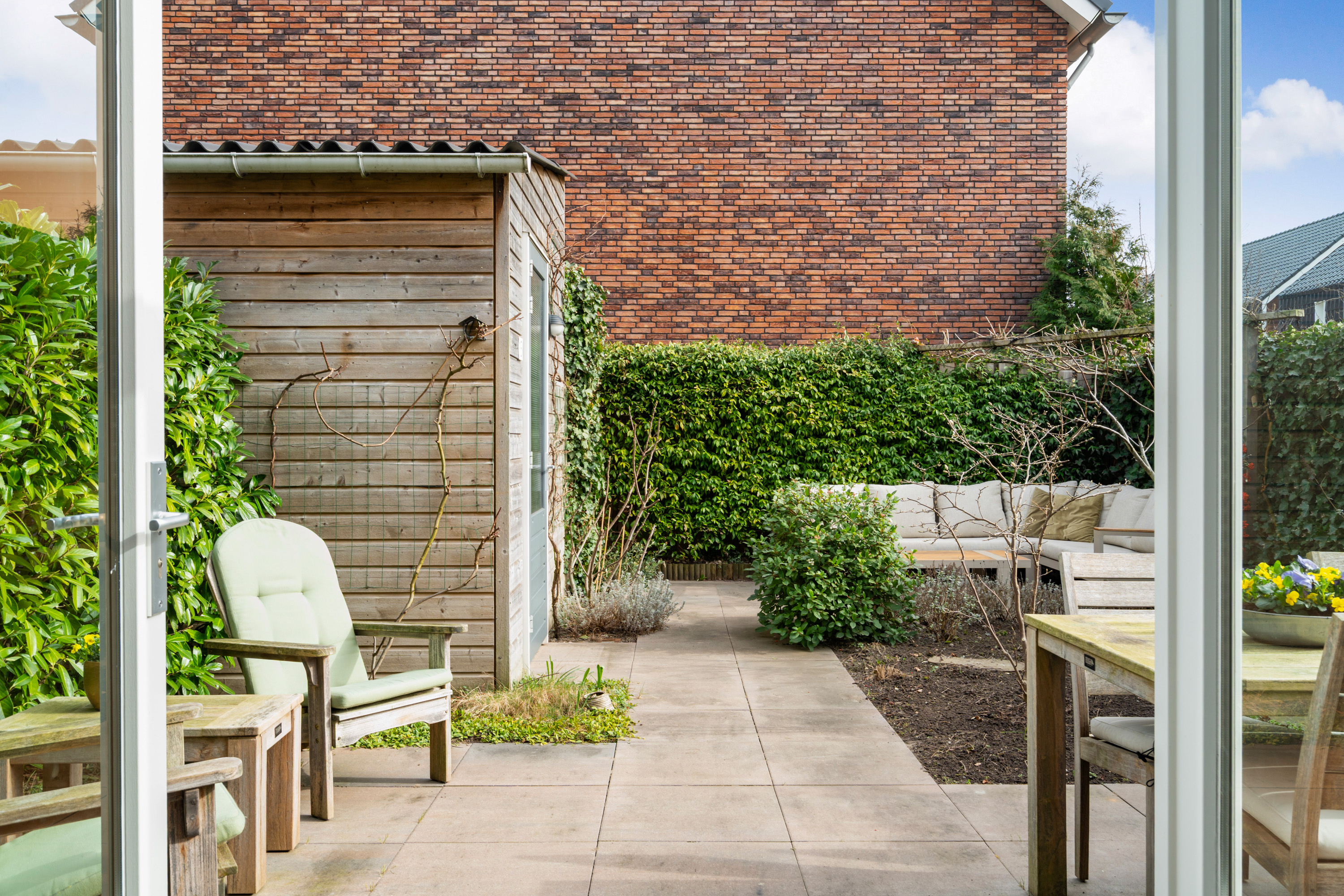 De achtertuin is sfeervol ingericht met strakke terrastegels en plantenborders. De praktische berging is voorzien van elektra en is ideaal voor het opbergen van spullen. Er is een achterom aanwezig naar het mandelige parkeerterrein.