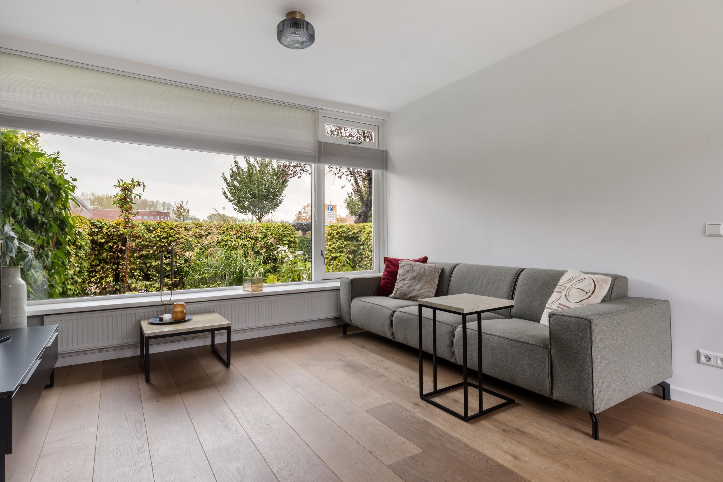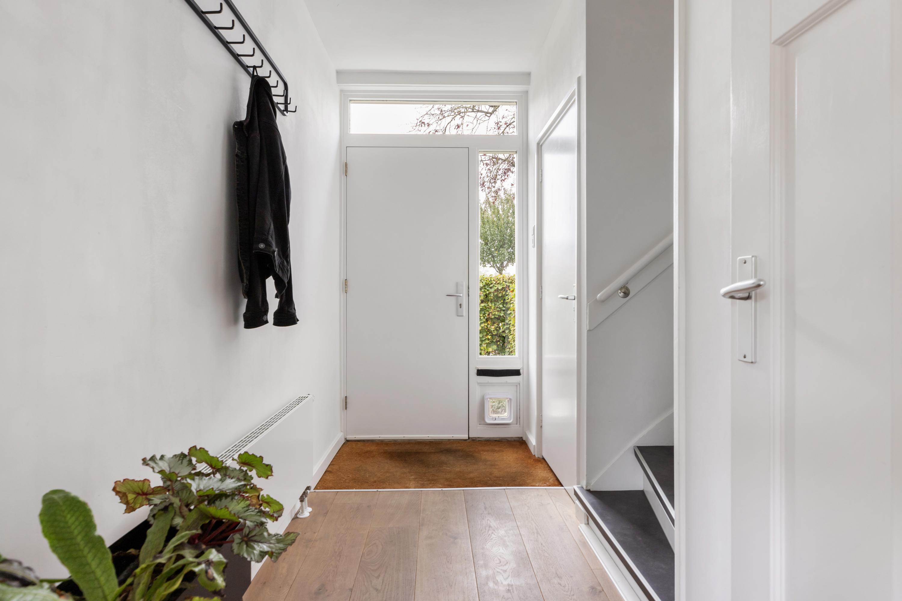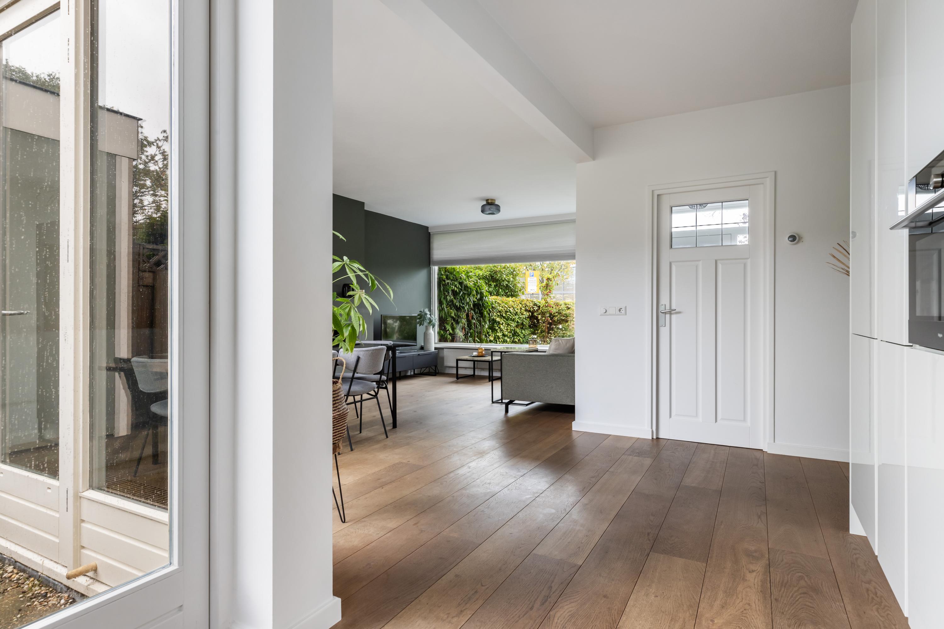 Je parkeert de auto gemakkelijk aan de brede straat aan de voorzijde van het huis. Via de voordeur kom je in de lichte hal met de toiletruimte, de trap naar boven, een trapkast met de meterkast en de deur naar de woonkamer. Het brede zitgedeelte ligt aan de voorzijde en hier heb je vanuit de grote raampartij een vrij uitzicht over de straat. In de achtergevel zijn openslaande deuren naar de achtertuin met veel glas voor een goede lichtinval.
