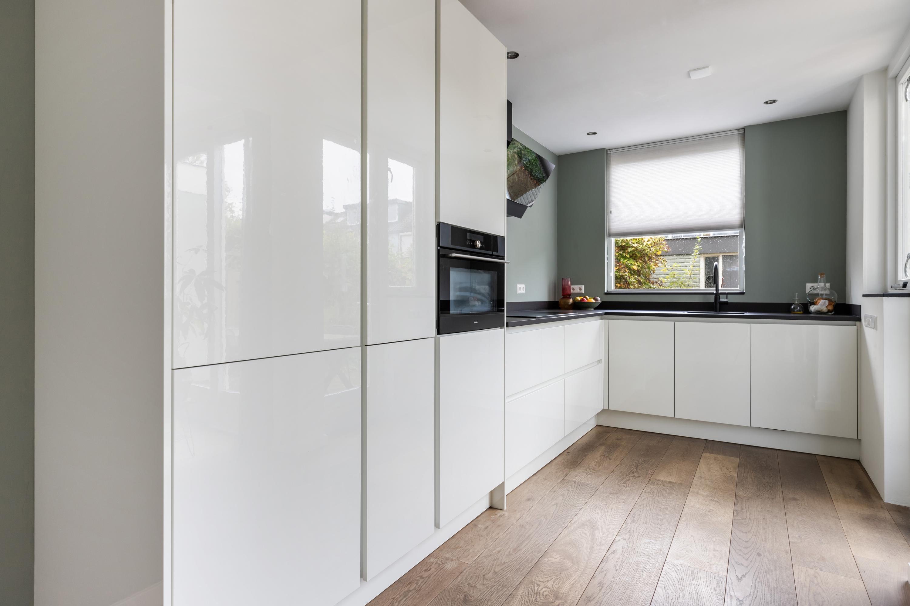 In de uitbouw is de moderne open keuken te vinden en deze is in een hoek opgesteld. De keuken is in 2020 gerenoveerd en de volgende voorzieningen zijn inbegrepen: