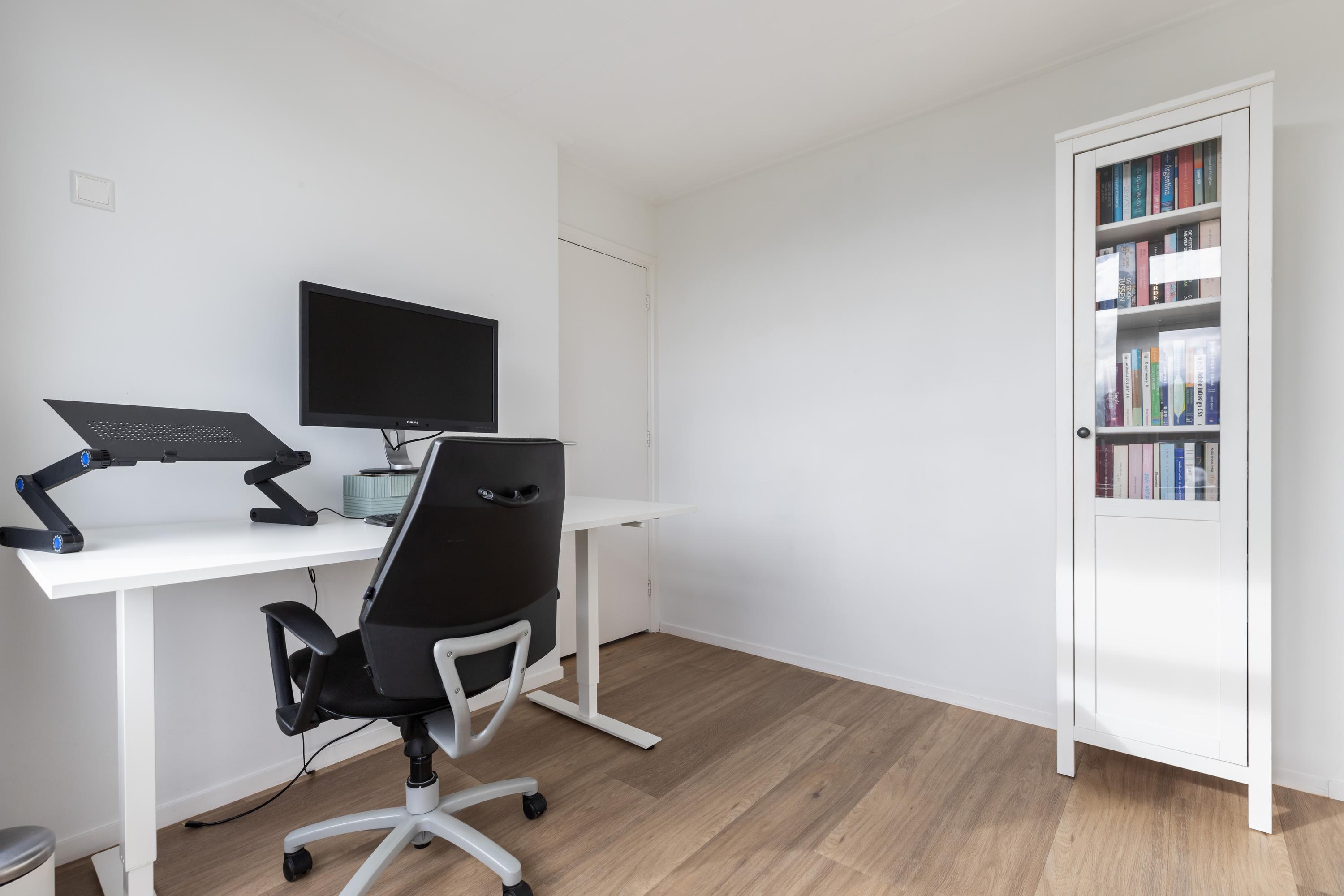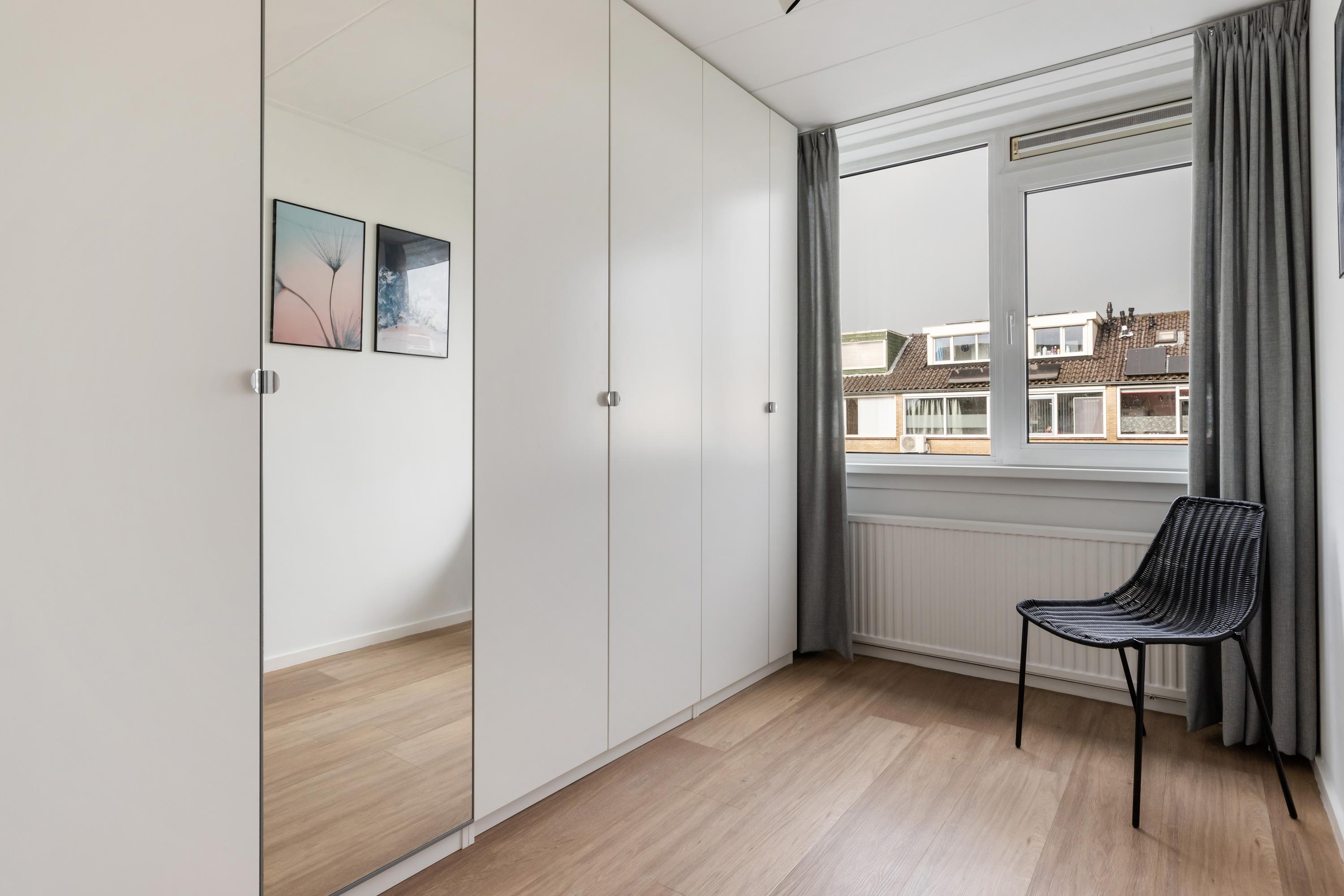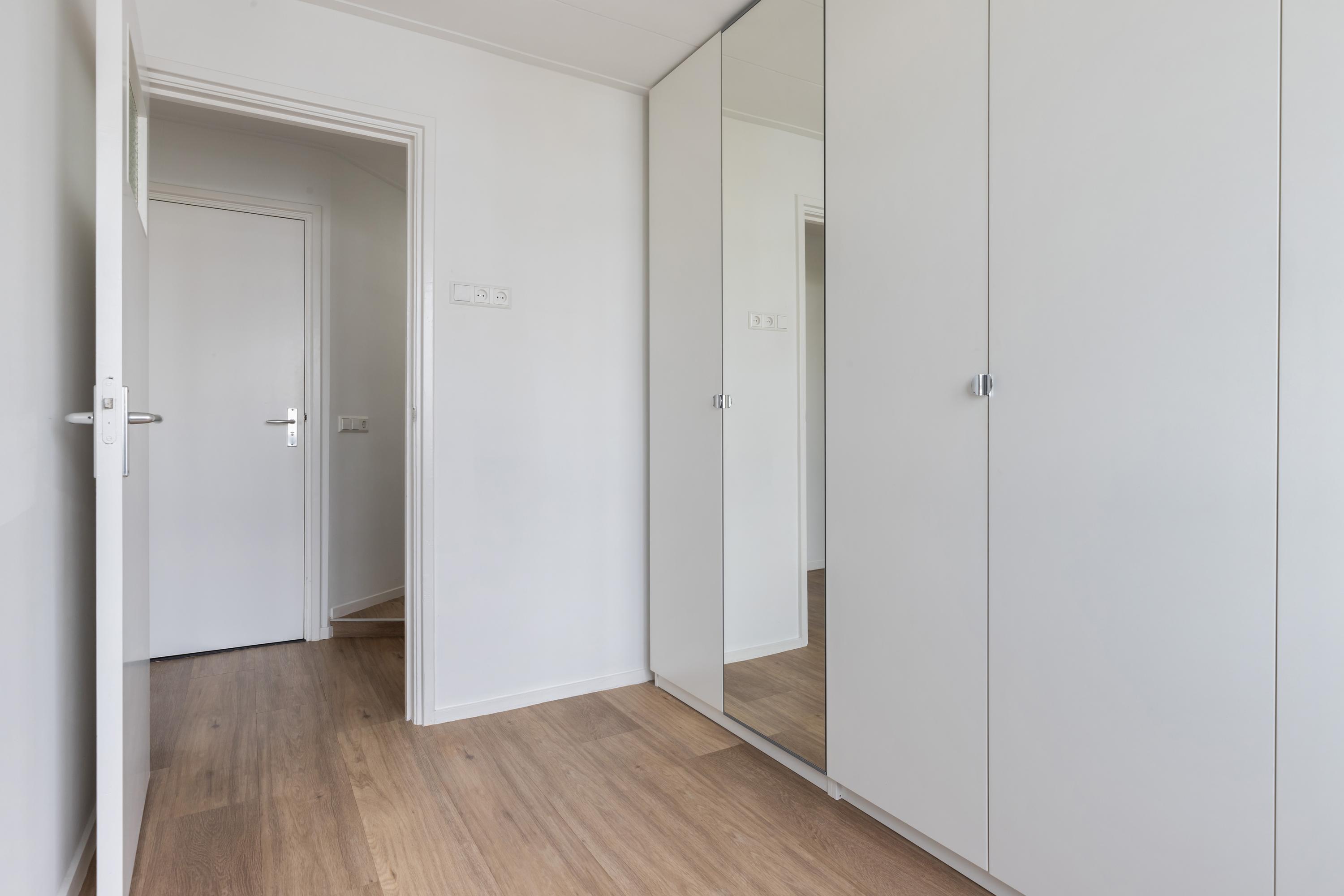 Via de overloop bereik je de slaapkamers op deze verdieping en de badkamer. Ook is er een vaste trap naar de tweede verdieping. Aan de voorzijde ligt een slaapkamer met een deur naar het balkon. Aan de achterkant van het huis zijn nog twee slaapkamers te vinden, waarvan er één is voorzien van een vaste schuifkastenwand. De badkamer is strak en modern afgewerkt en voorzien van een: