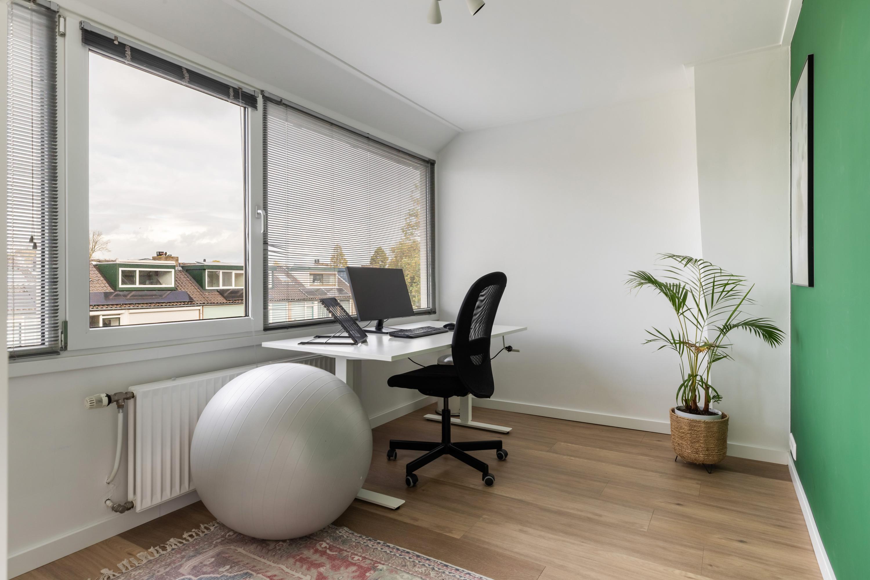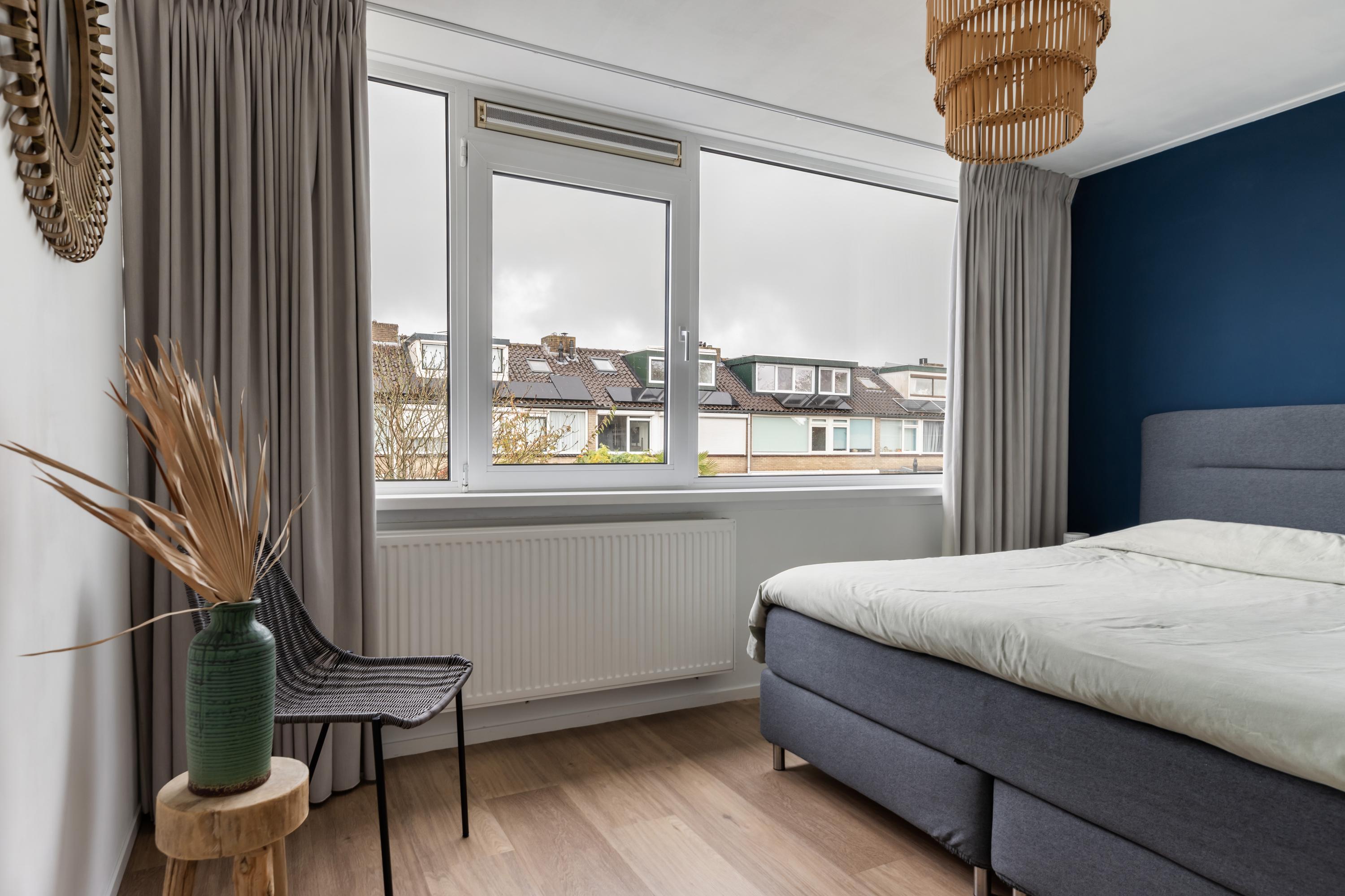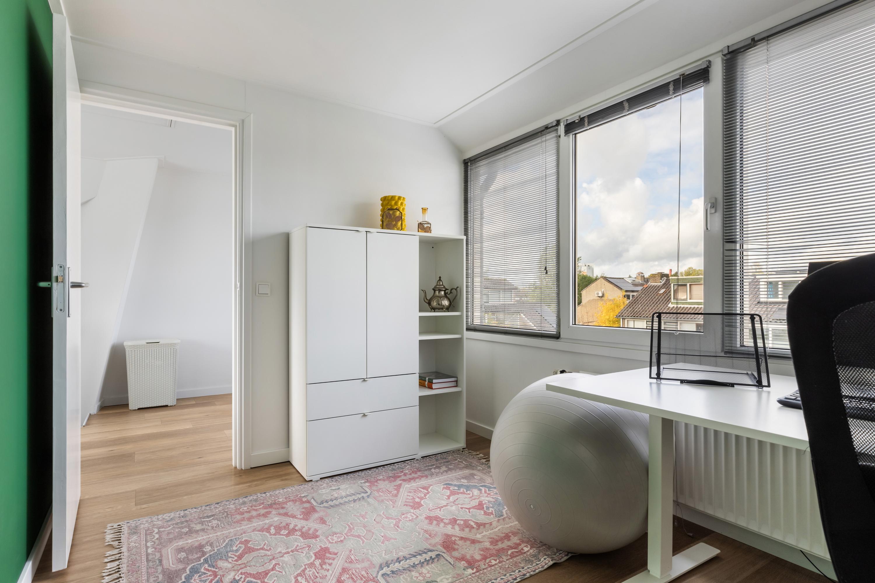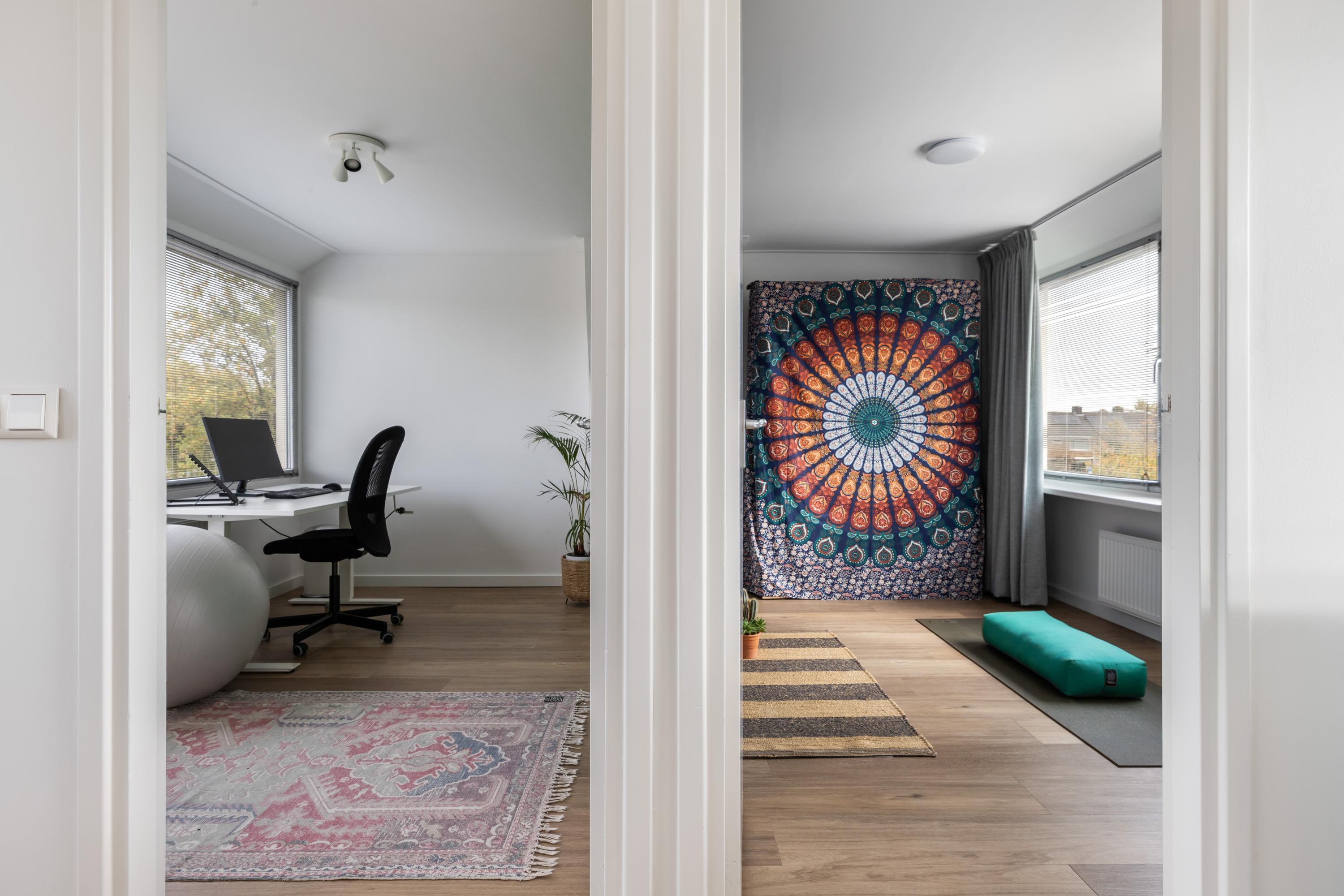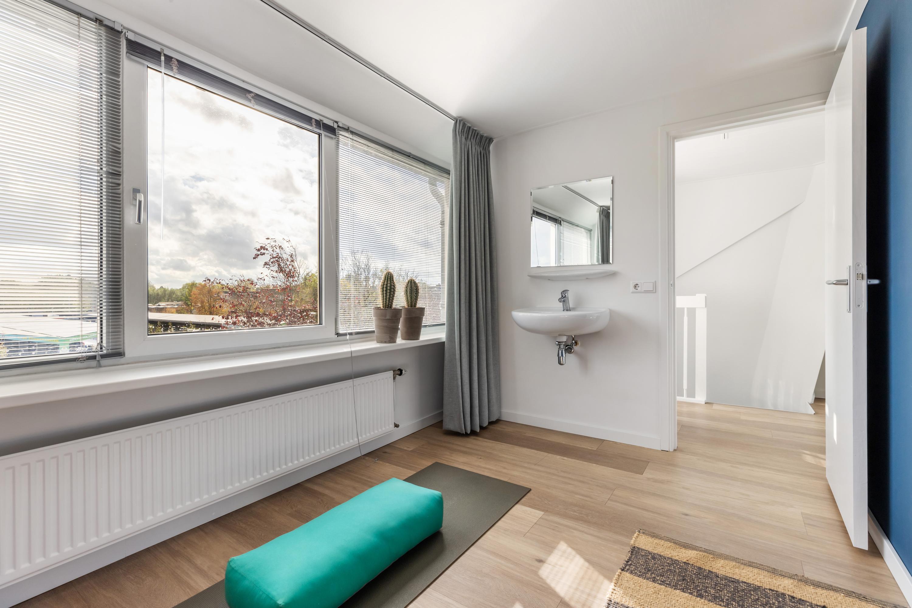 De ruime overloop is heerlijk licht dankzij de grote raampartijen aan zowel de voor- als achterzijde. Hier vind je de aansluitingen voor de wasapparatuur en de opstelplaats van de HR CV-ketel. Via een luik met vlizotrap is de bovengelegen bergvliering bereikbaar, ideaal voor extra opbergruimte. Deze verdieping biedt daarnaast nog twee goede slaapkamers, waarvan er één is voorzien van een eigen wastafel.