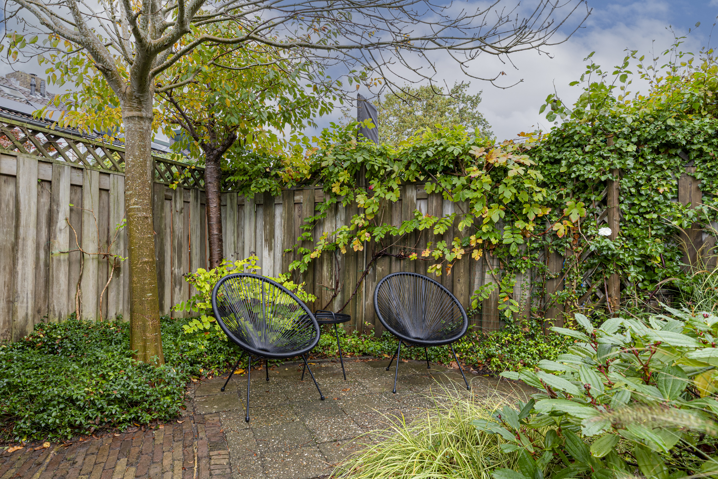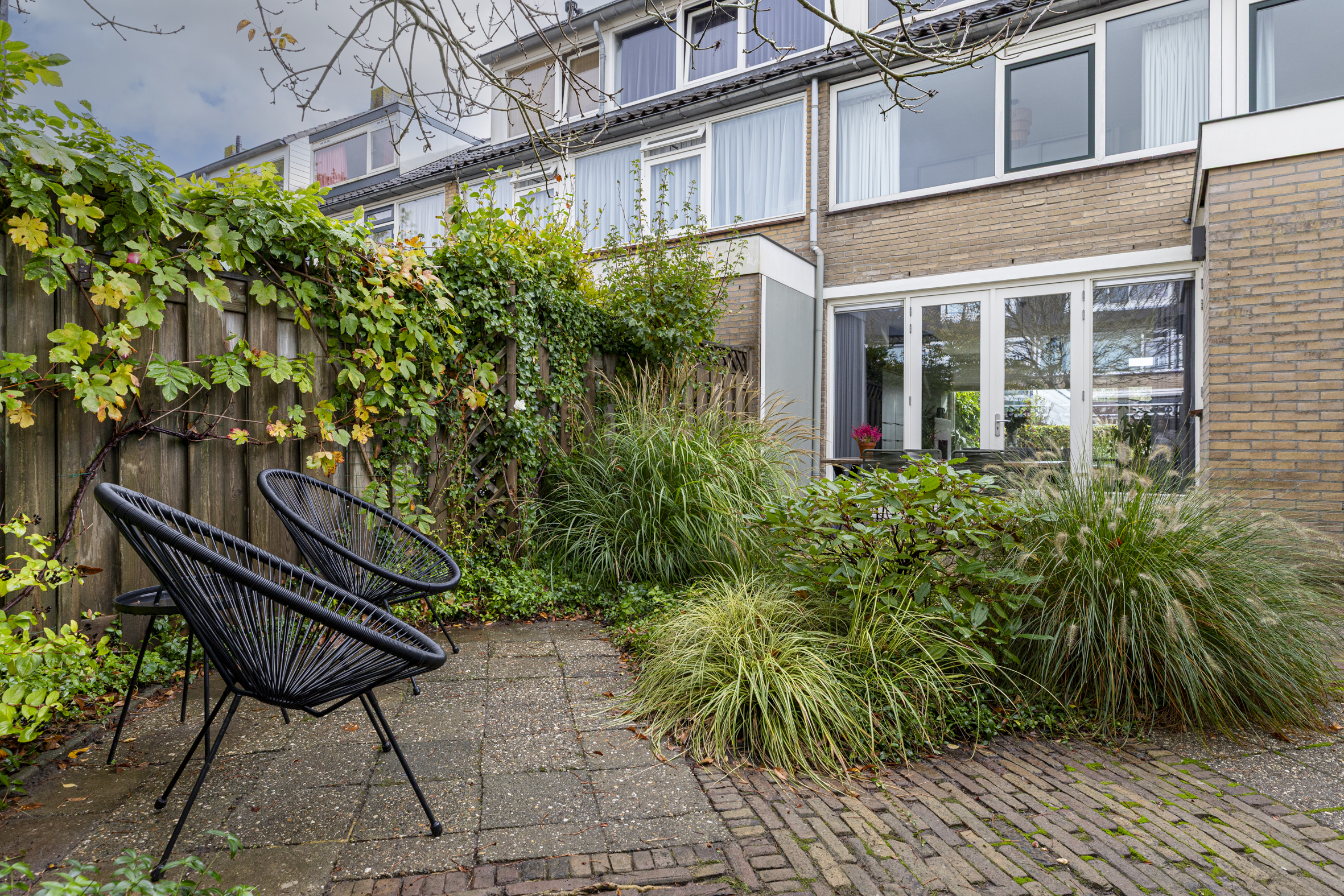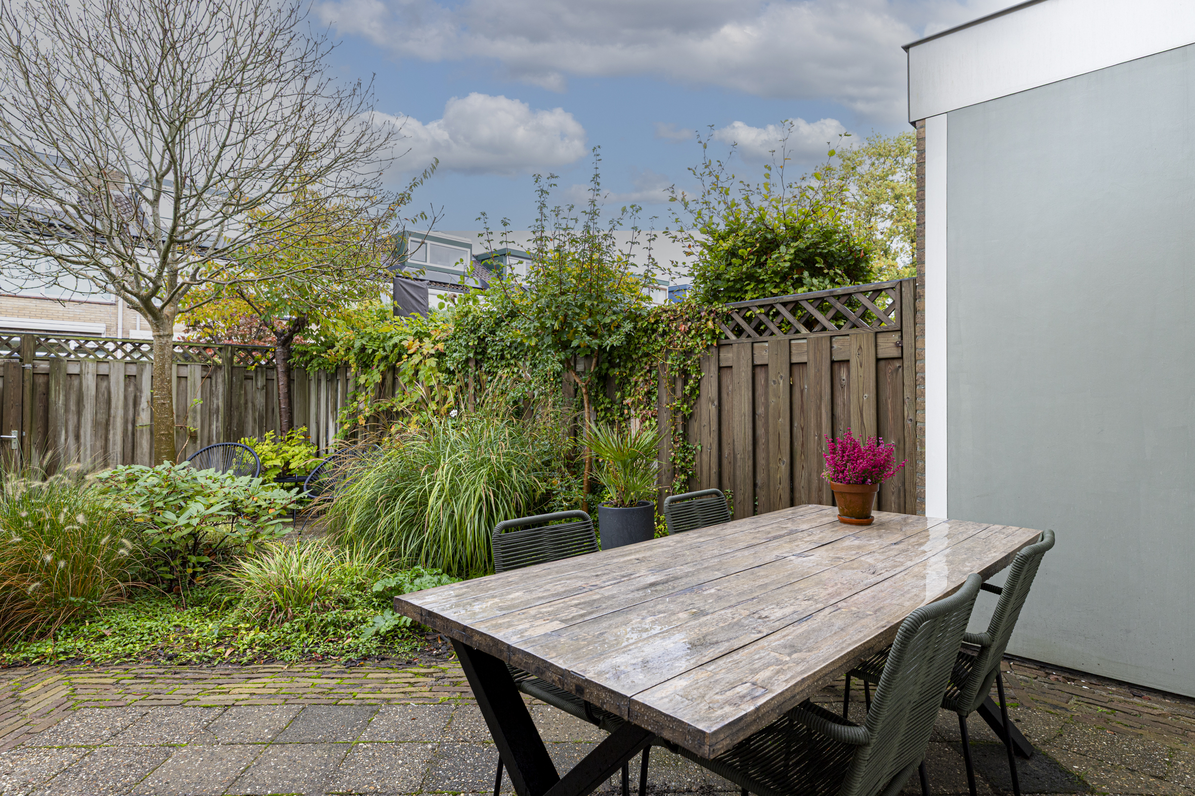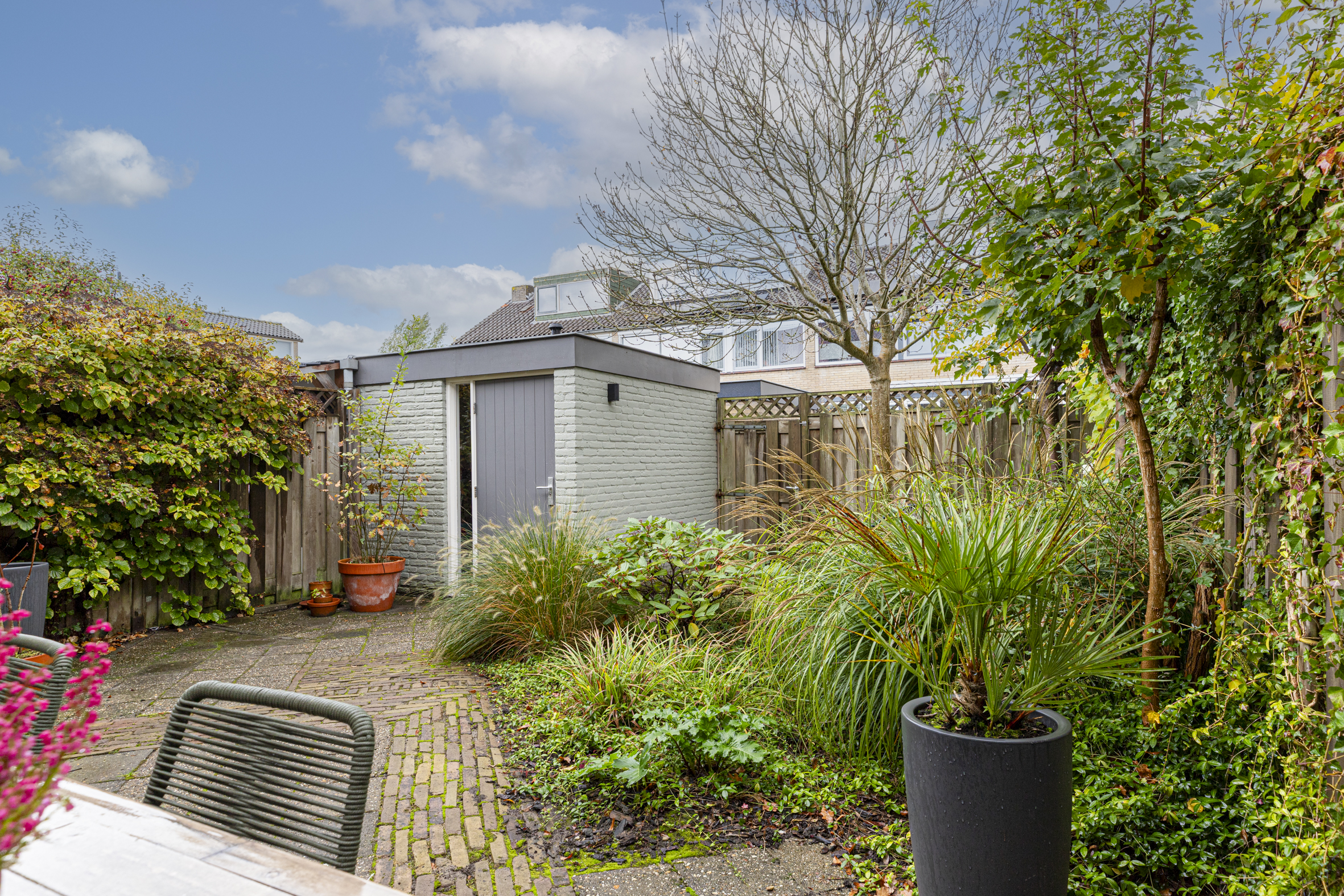 De tuin is afgewerkt met bestrating en veel groen. Achterin de tuin vind je de praktische stenen berging, voorzien van elektra. Dankzij de achterom naar de steeg, stal je hier eenvoudig de fietsen.