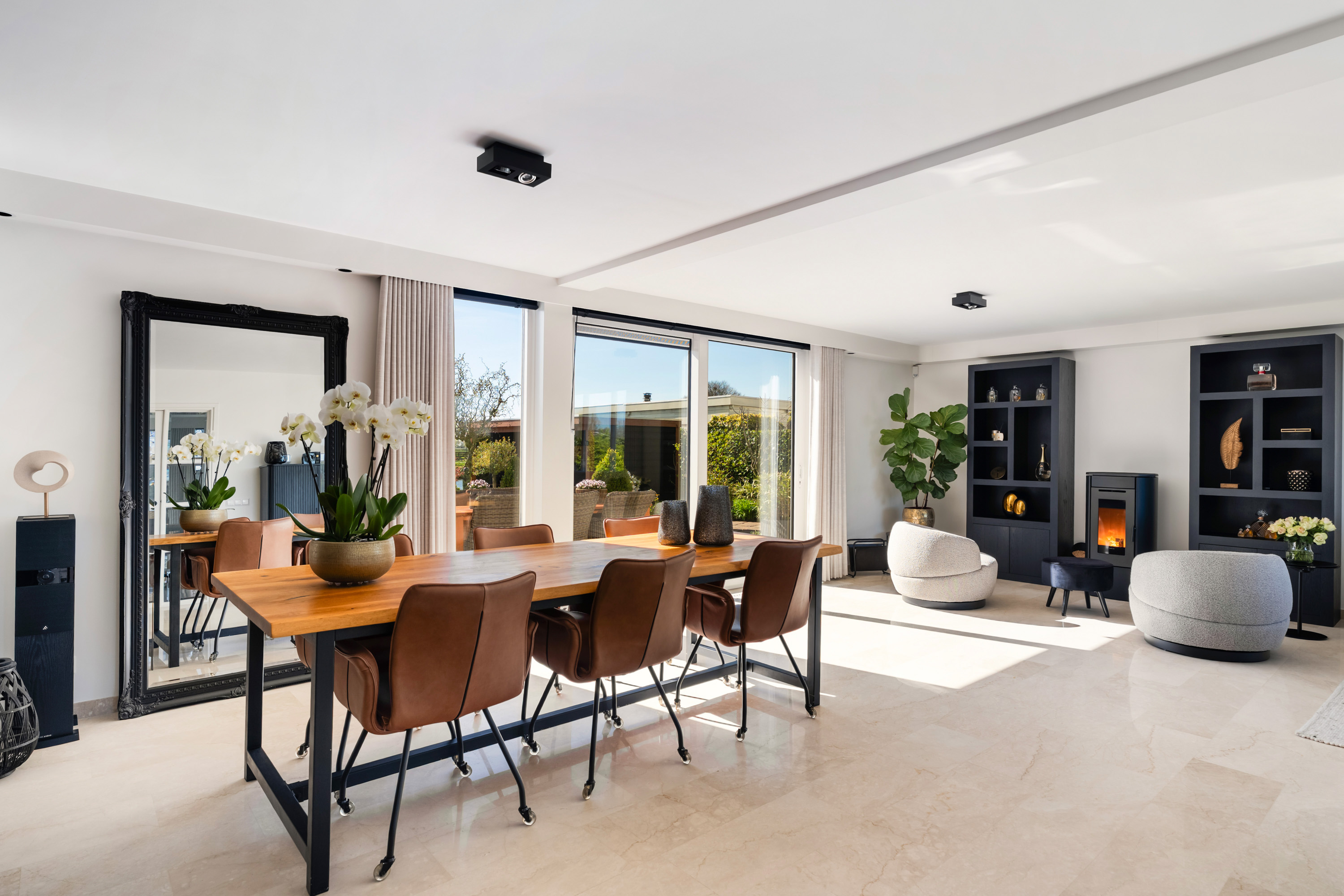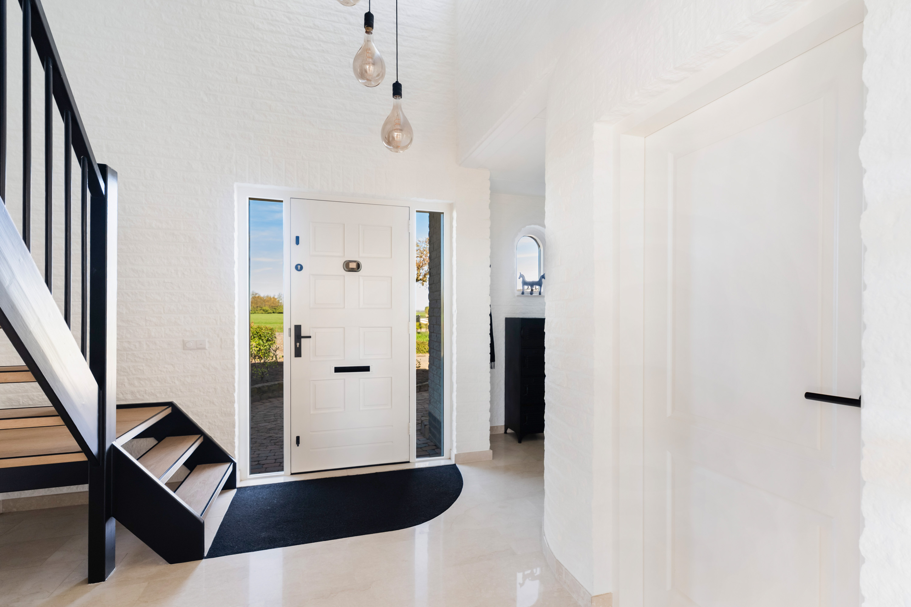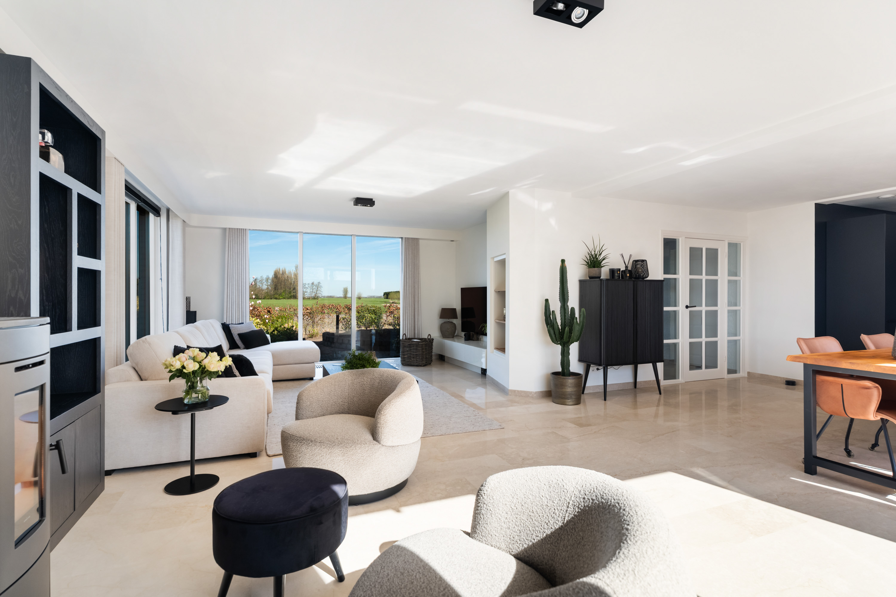 De oprit biedt ruimte om meerdere auto’s te parkeren en is bovendien voorzien van een laadpaal. Via de verzorgde voortuin bereik je de voordeur en de royale entree. In de hal bevinden zich de trapopgang, de toiletruimte, de meterkast en toegang tot de werkkamer. Via de glazen deur stap je de living binnen van maar liefst ca. 55 m2. Hier vind je een sfeervolle pelletkachel en grote raampartijen die niet alleen zorgen voor een prachtige lichtinval, maar ook een weids uitzicht bieden over de landelijke en groene omgeving. De schuifpui in de achtergevel geeft toegang tot de tuin.