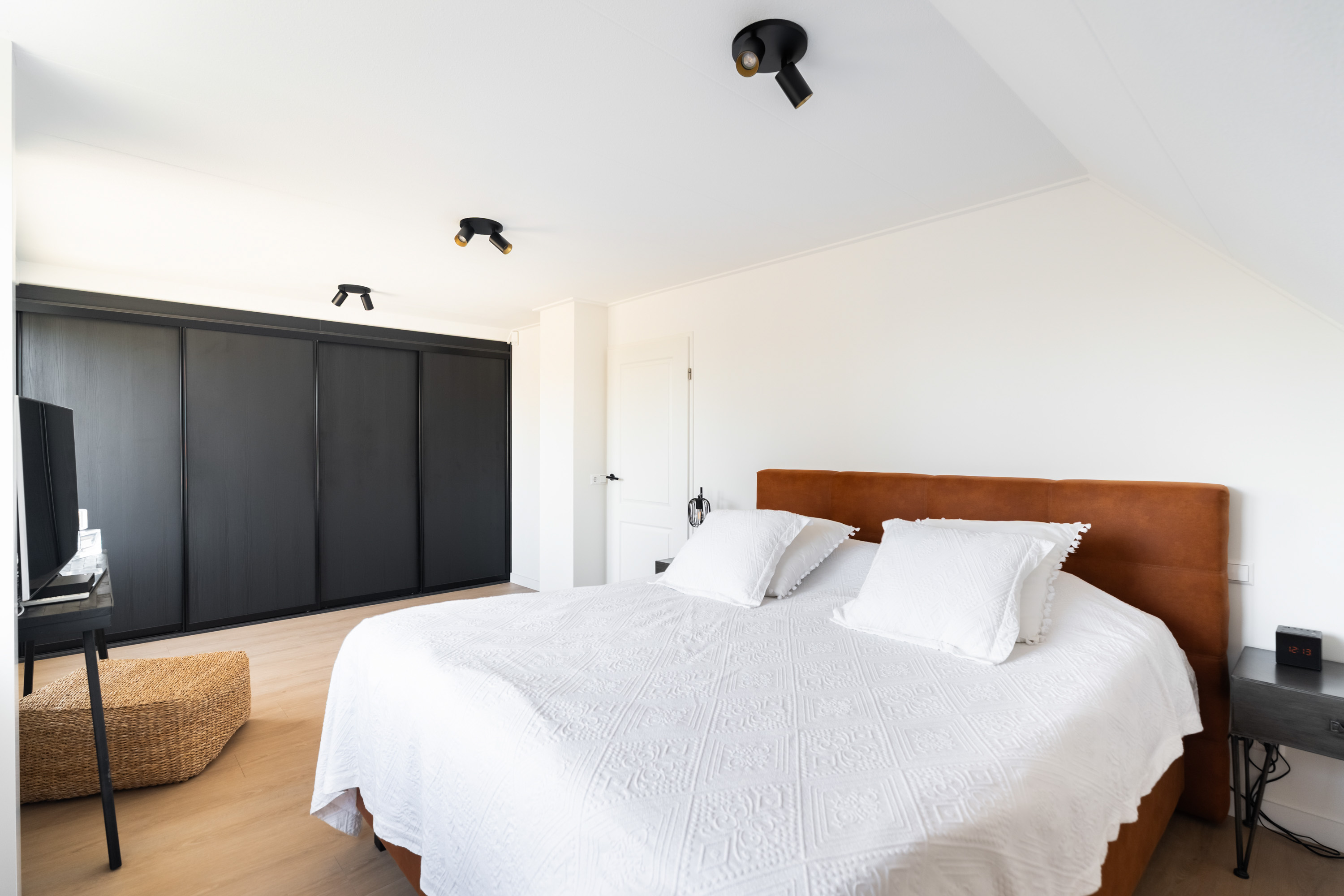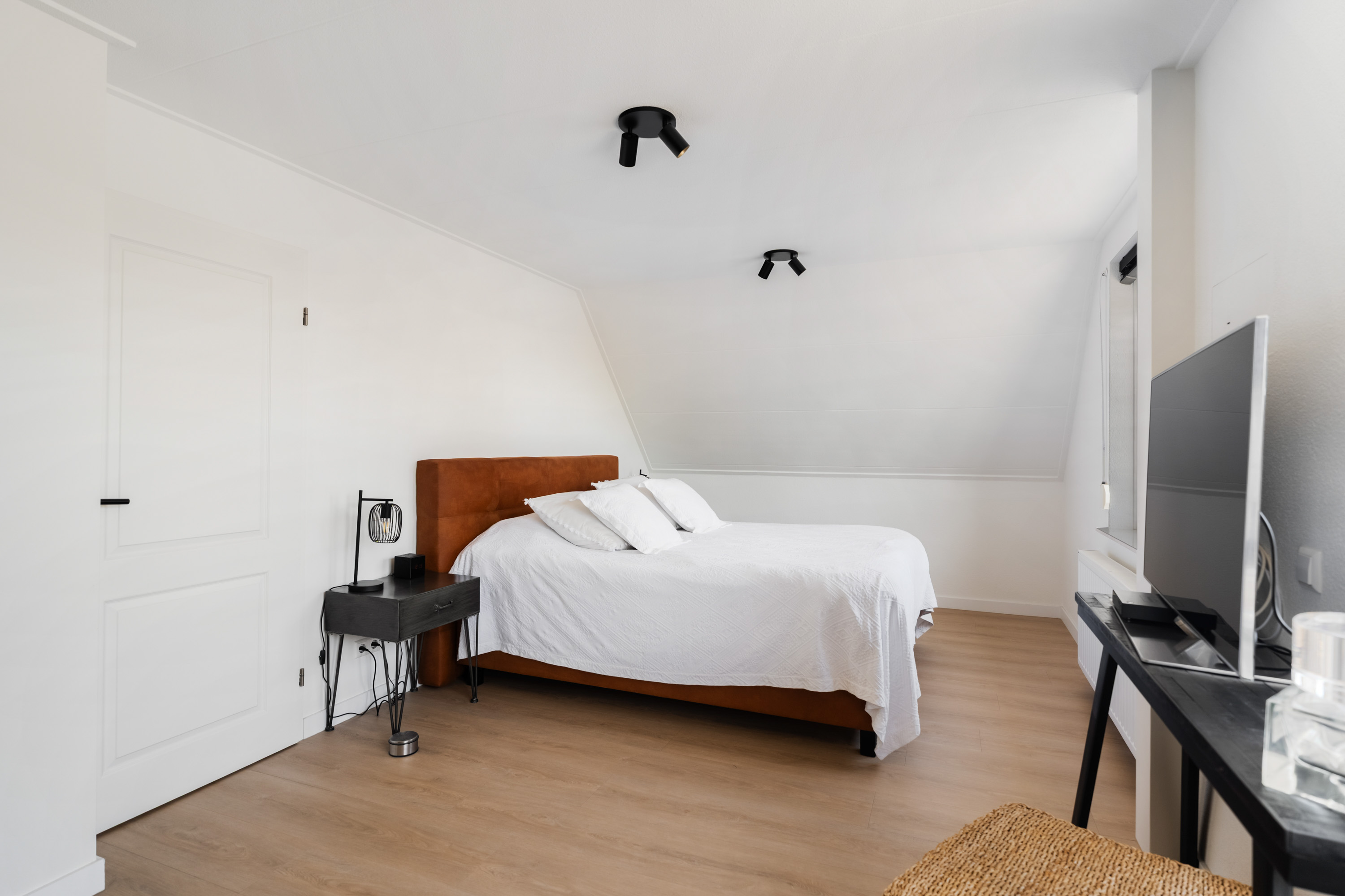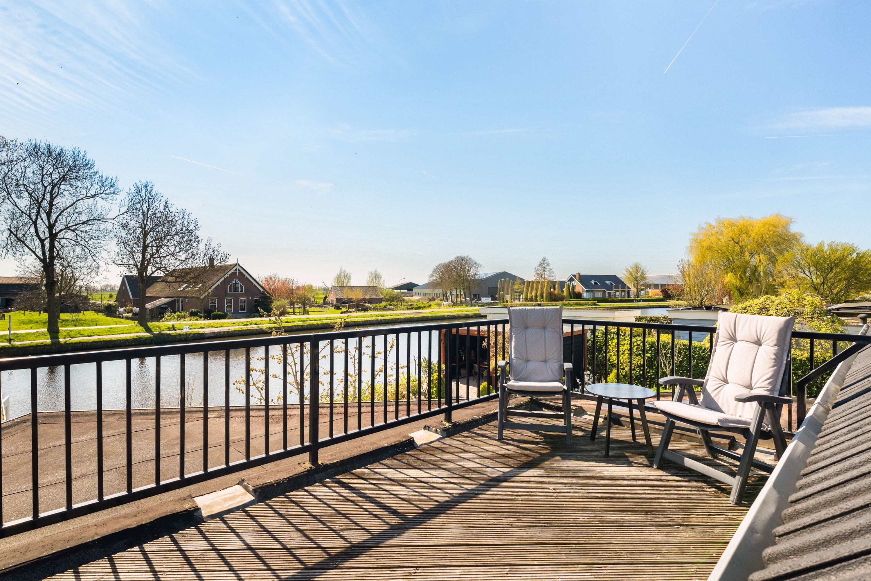 De lichte en ruime overloop geeft toegang tot drie slaapkamers en de badkamer. De hoofdslaapkamer is aan de linkerzijde gelegen en voorzien van een vaste schuifkastenwand. Vanuit deze kamer is het royale dakterras bereikbaar, waar je prachtig uitkijkt over de weilanden en het water. Aan de rechterzijde van het huis liggen de overige twee slaapkamers, beide beschikken over vaste kasten en bergruimte onder de schuine kap.