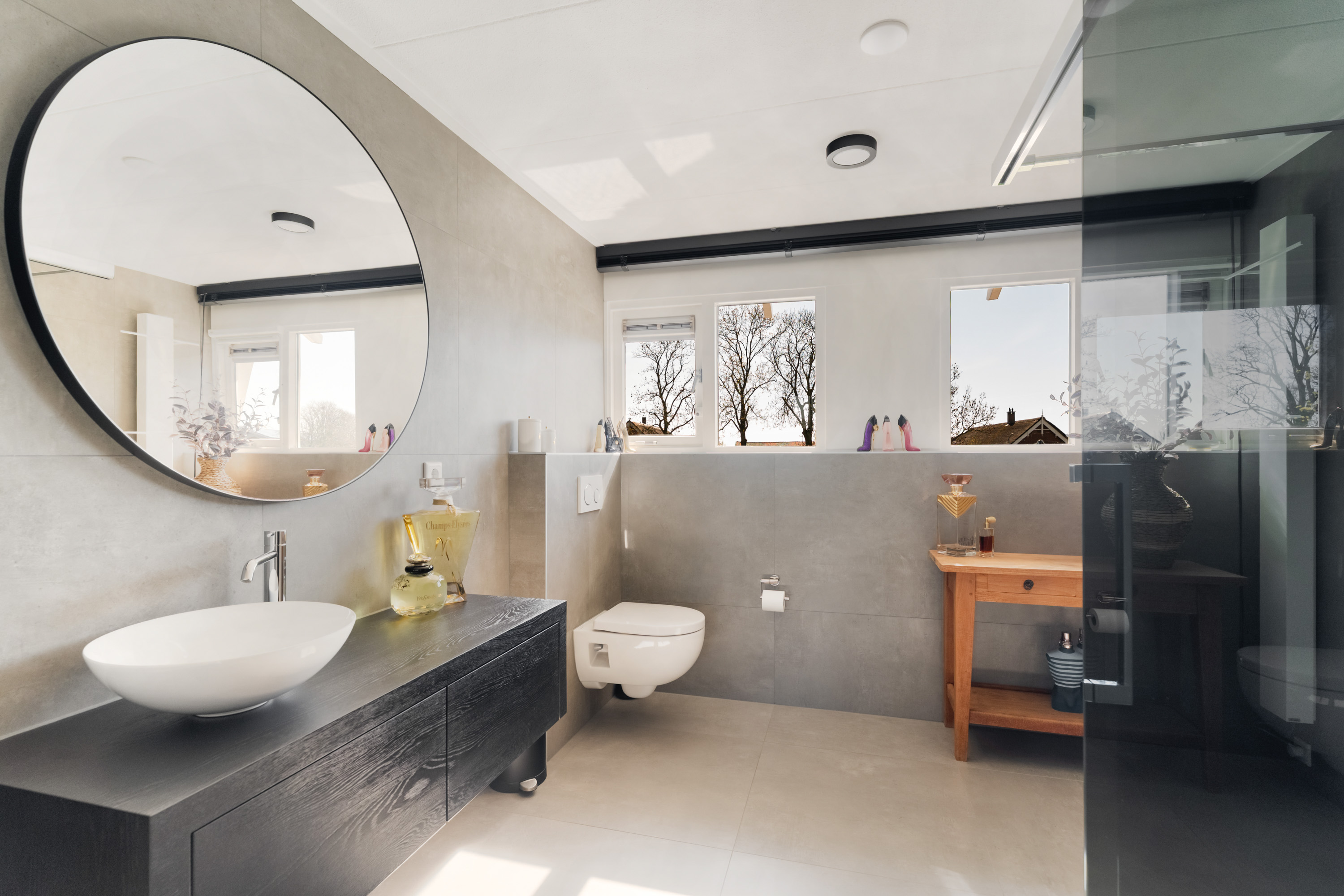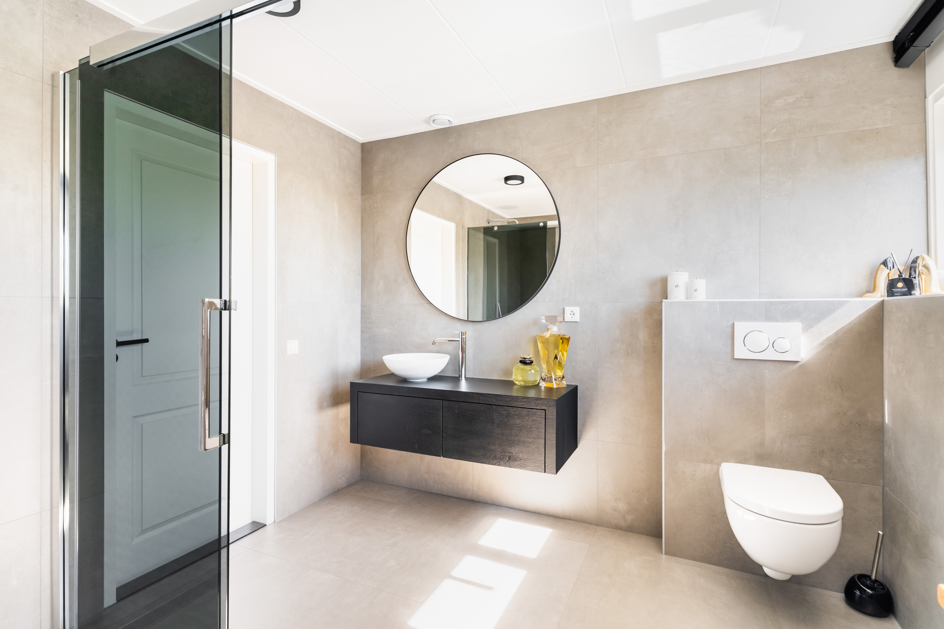 De tussengelegen badkamer is stijlvol en strak afgewerkt. Hier geniet je van een: