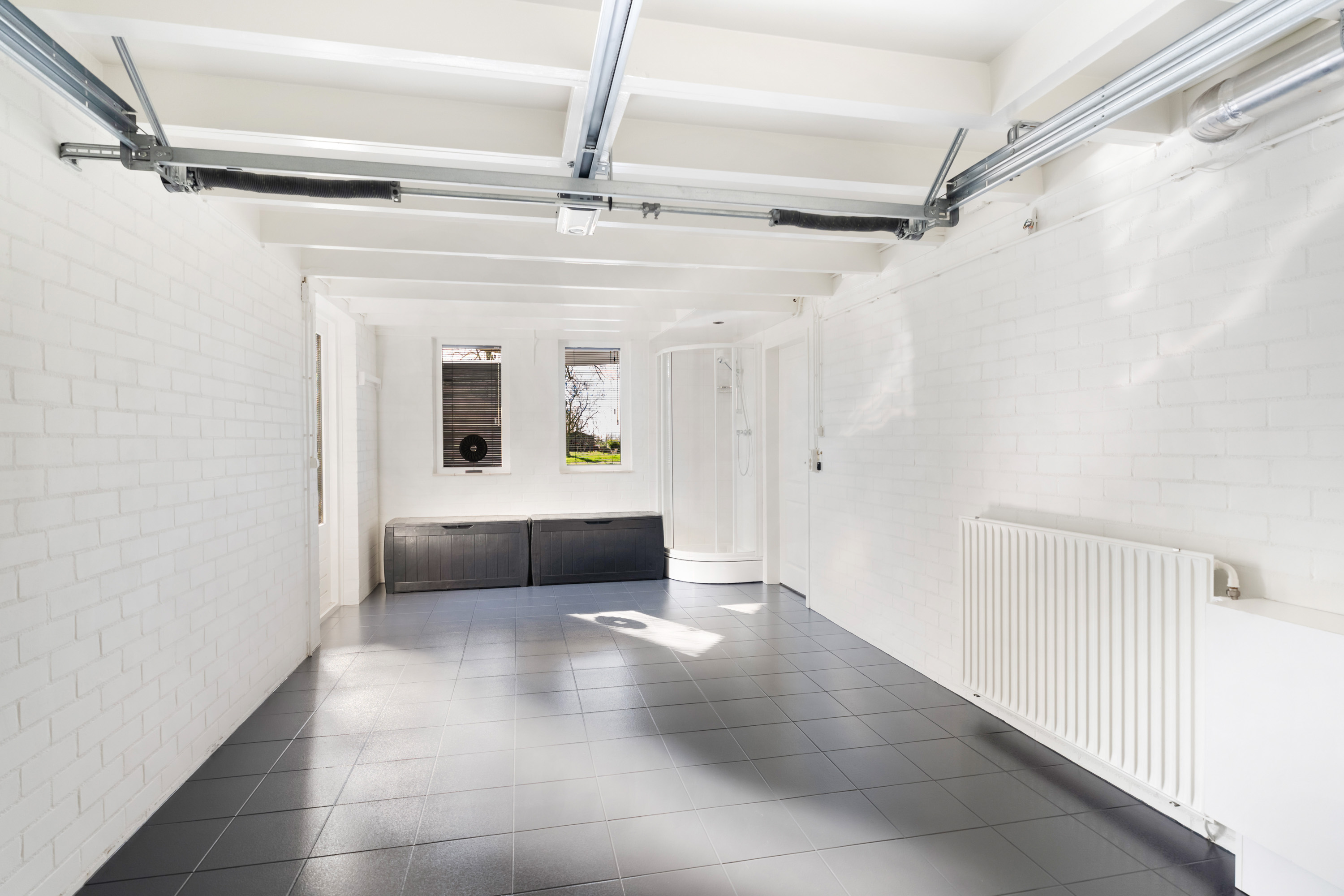 Vanuit de keuken is de praktische bijkeuken bereikbaar, waar ruimte is voor de wasapparatuur en extra opbergmogelijkheden. Via een loopdeur heb je bovendien toegang tot de achtertuin. De aangebouwde garage is te bereiken vanuit de bijkeuken. Vanuit de bijkeuken is tevens de aangebouwde garage te bereiken. De garage is compleet met een douchecabine, een deur naar buiten en een elektrische roldeur aan de voorzijde.