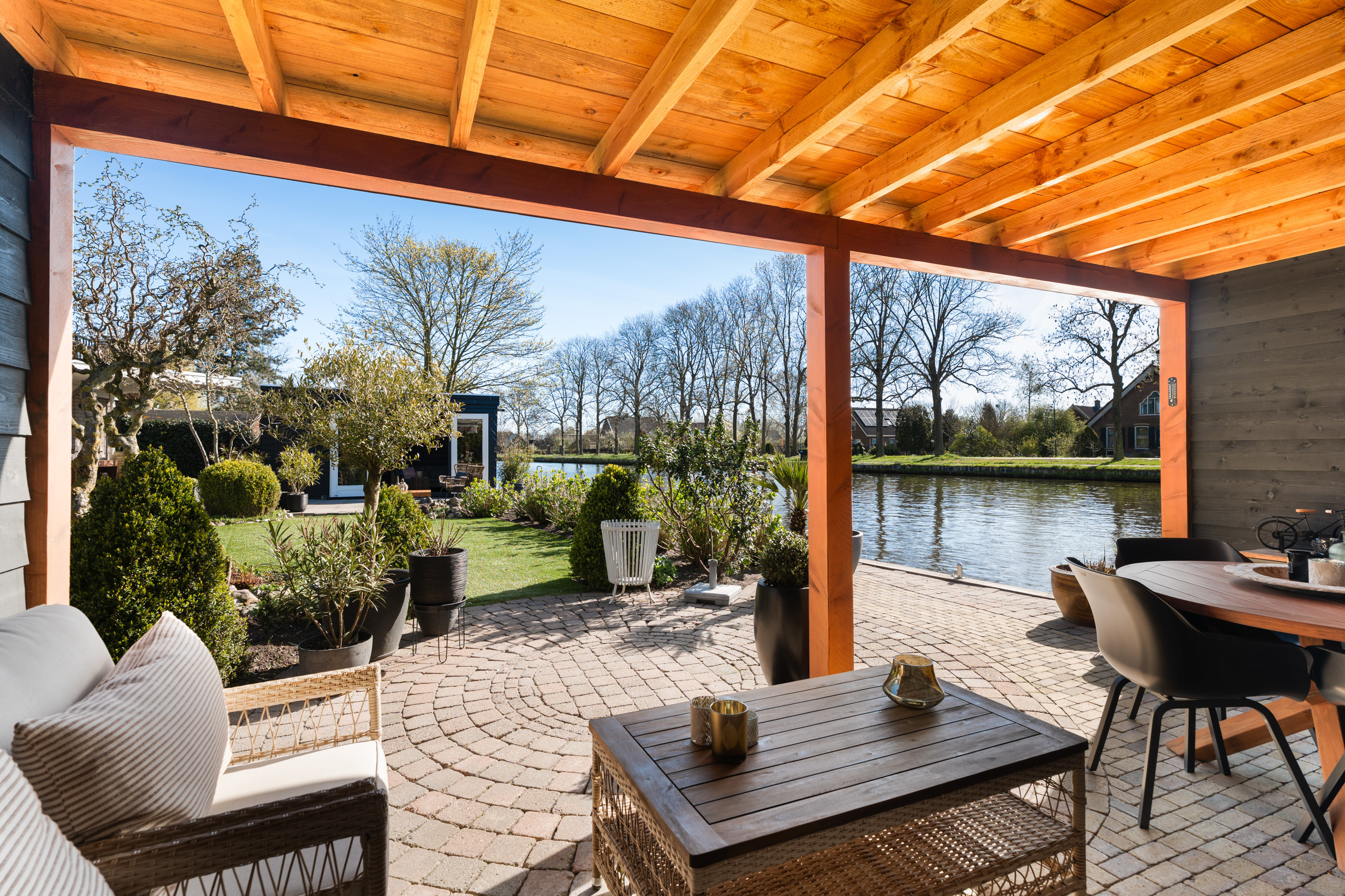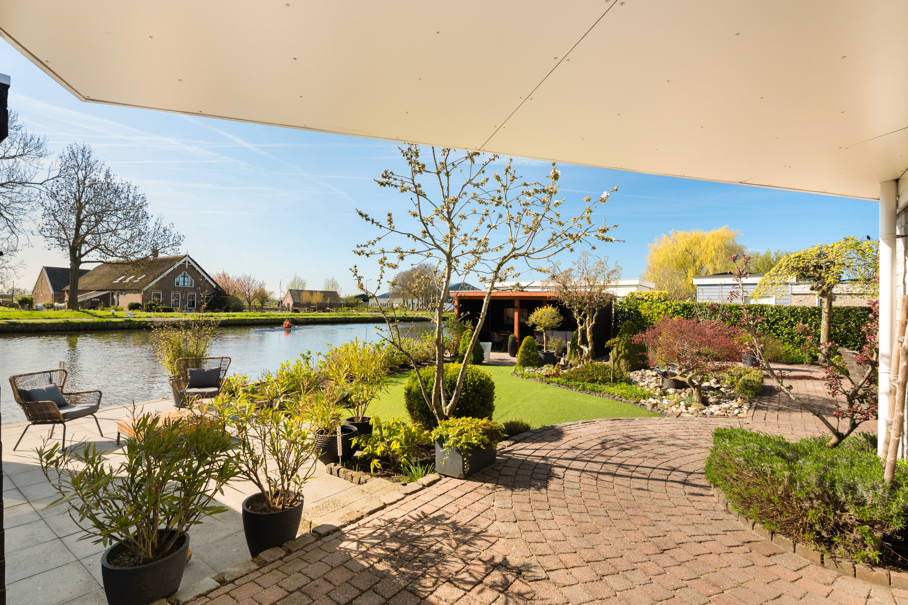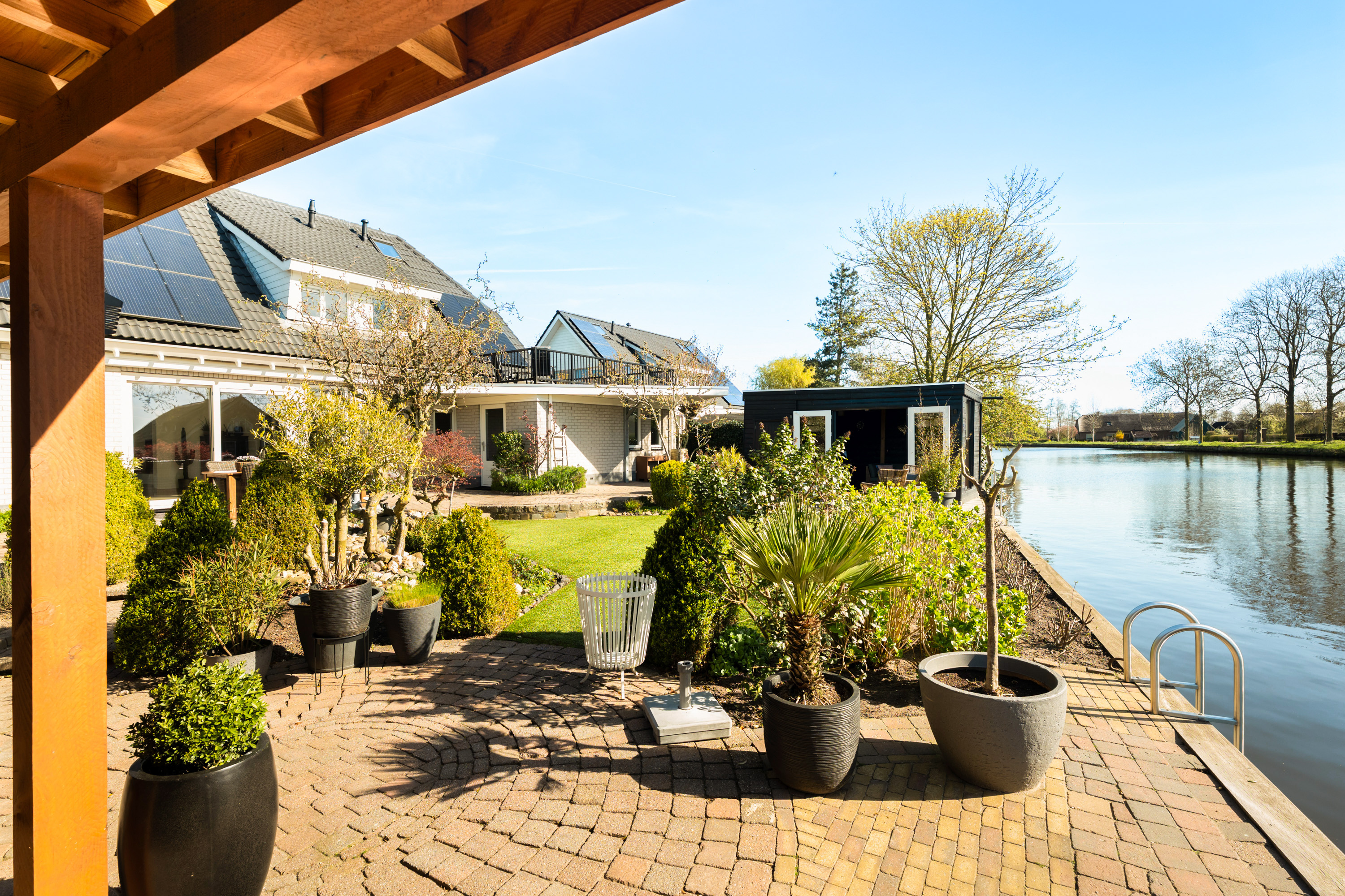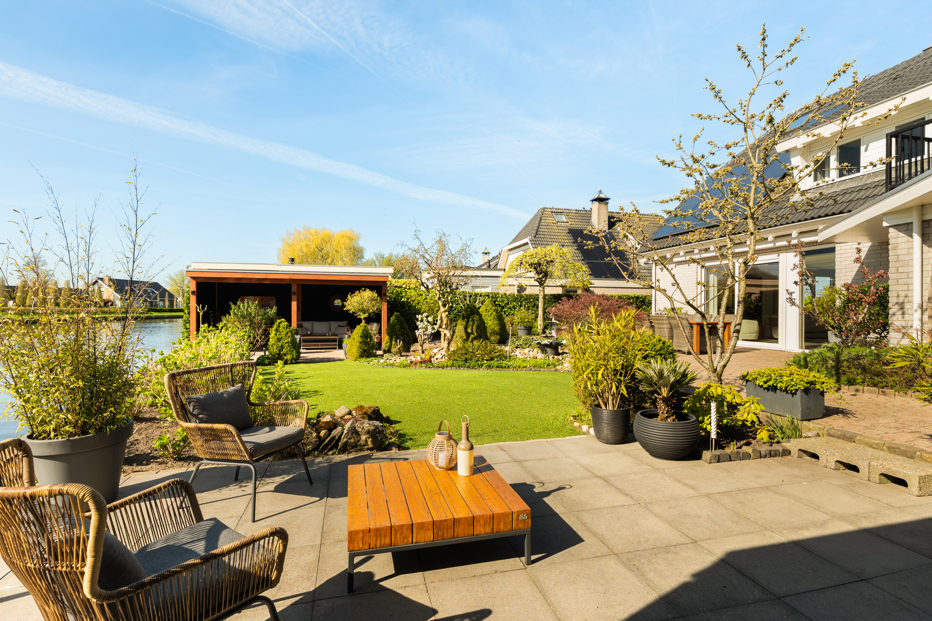 De tuin rondom de woning is met veel zorg aangelegd en vormt een heerlijke plek om optimaal van het buitenleven te genieten. Dankzij de royale afmetingen en de gunstige ligging van het perceel is er op elk moment van de dag altijd wel een plek in de zon of juist de schaduw te vinden. Een van deze heerlijke plekken is de sfeervolle loungeruimte, die uitnodigt tot lange zomeravonden en ontspannen momenten. Aansluitend bevindt zich een praktische aangebouwde berging voor de tuinspullen. Aan de andere zijde van de tijd is een fraaie overkapping geplaatst. Daarnaast biedt de ligging aan de Oude Rijn de mogelijkheid om twee bootjes aan te leggen, vanwaar je kunt genieten van prachtige vaarroutes naar onder meer Leiden, de Nieuwkoopse plassen en andere natuurgebieden.
