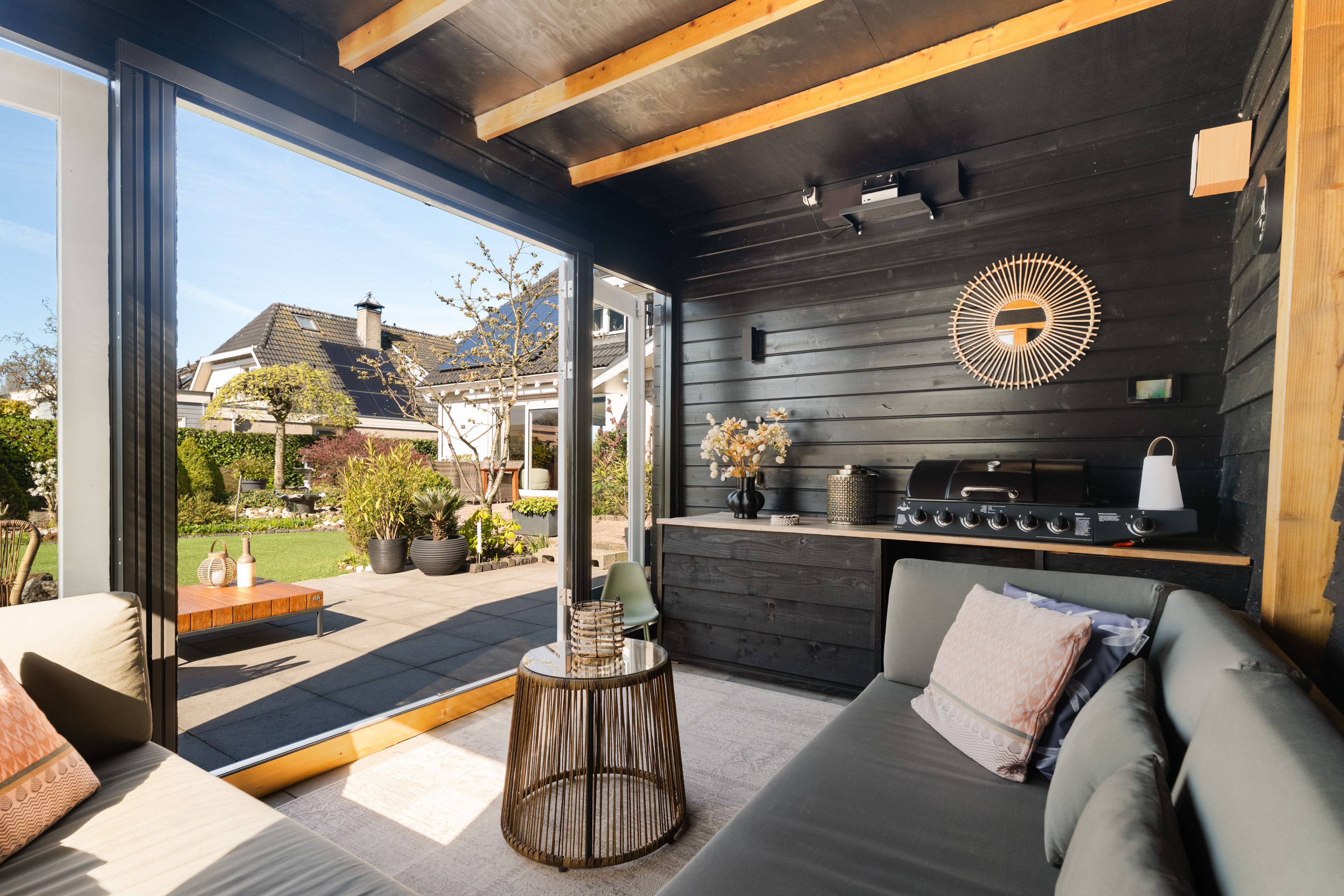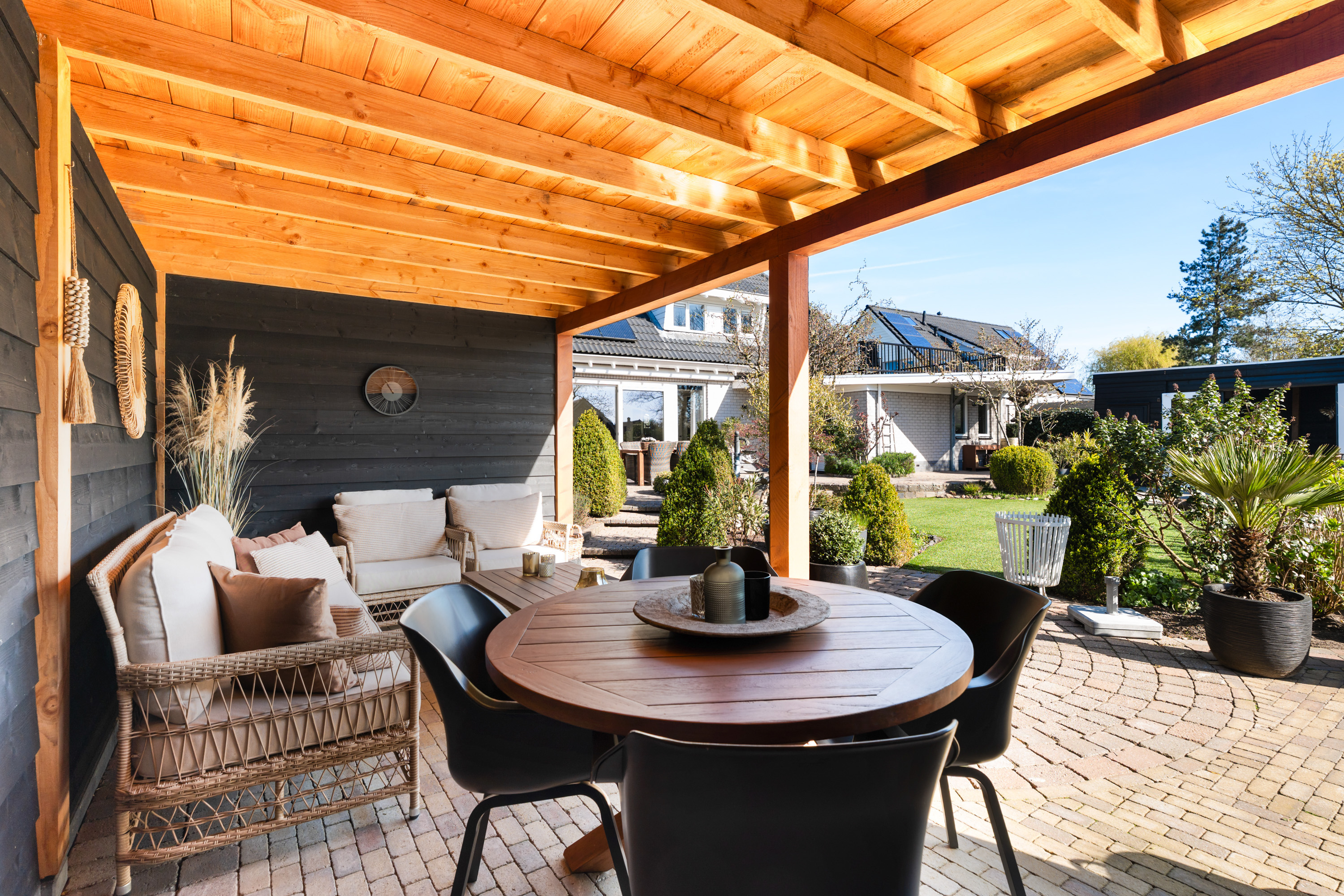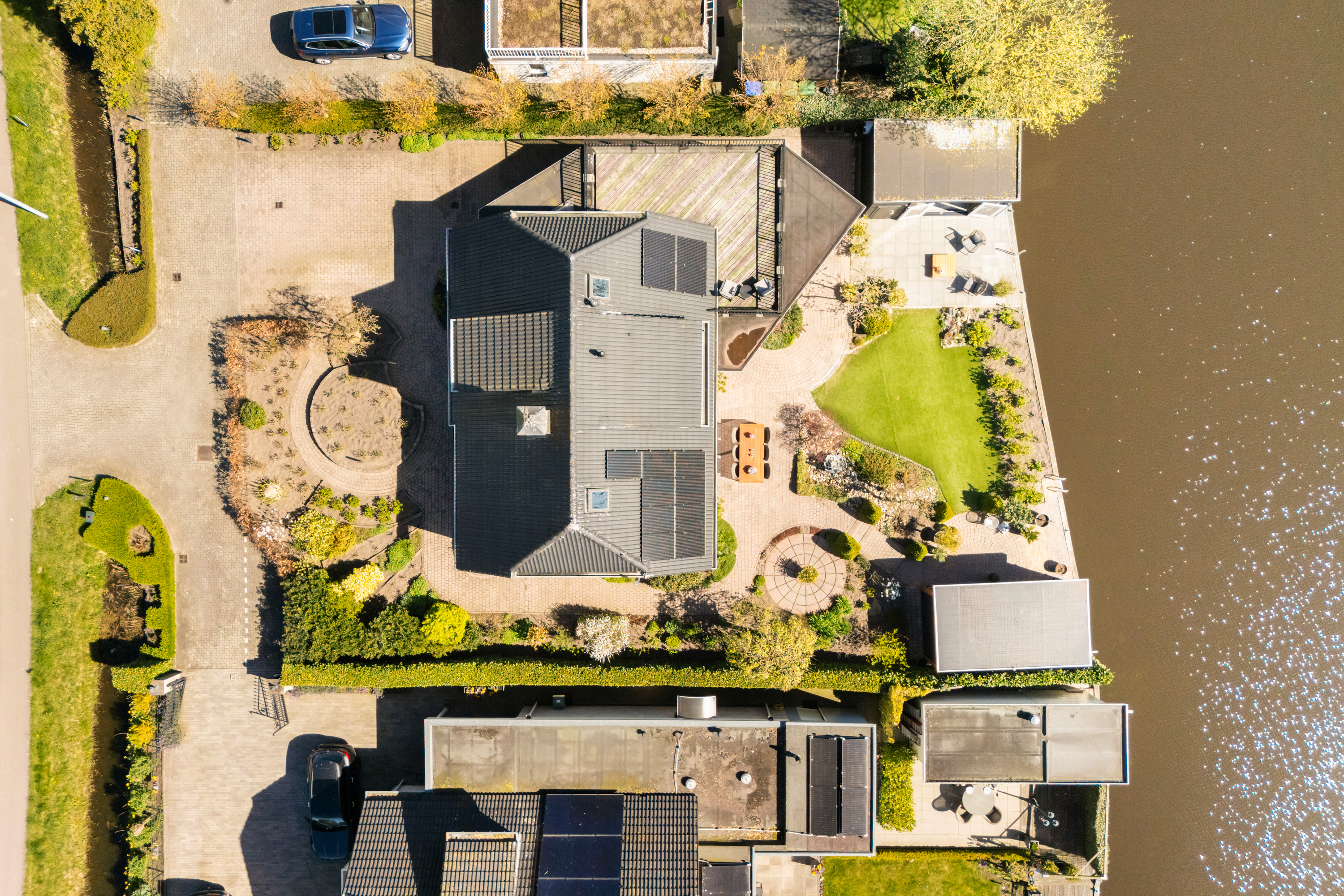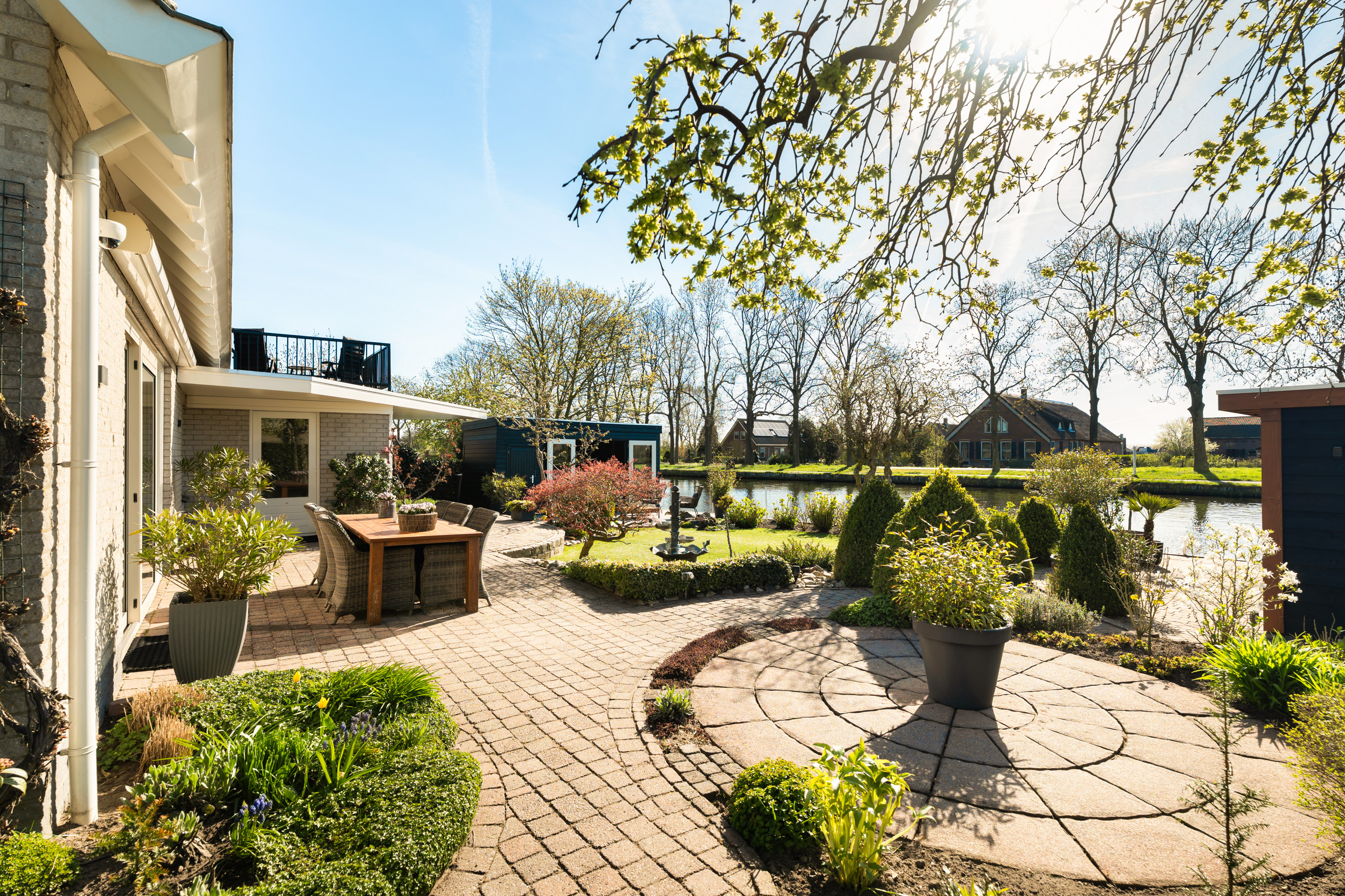De tuin rondom de woning is met veel zorg aangelegd en vormt een heerlijke plek om optimaal van het buitenleven te genieten. Dankzij de royale afmetingen en de gunstige ligging van het perceel is er op elk moment van de dag altijd wel een plek in de zon of juist de schaduw te vinden. Een van deze heerlijke plekken is de sfeervolle loungeruimte, die uitnodigt tot lange zomeravonden en ontspannen momenten. Aansluitend bevindt zich een praktische aangebouwde berging voor de tuinspullen. Aan de andere zijde van de tijd is een fraaie overkapping geplaatst. Daarnaast biedt de ligging aan de Oude Rijn de mogelijkheid om twee bootjes aan te leggen, vanwaar je kunt genieten van prachtige vaarroutes naar onder meer Leiden, de Nieuwkoopse plassen en andere natuurgebieden.