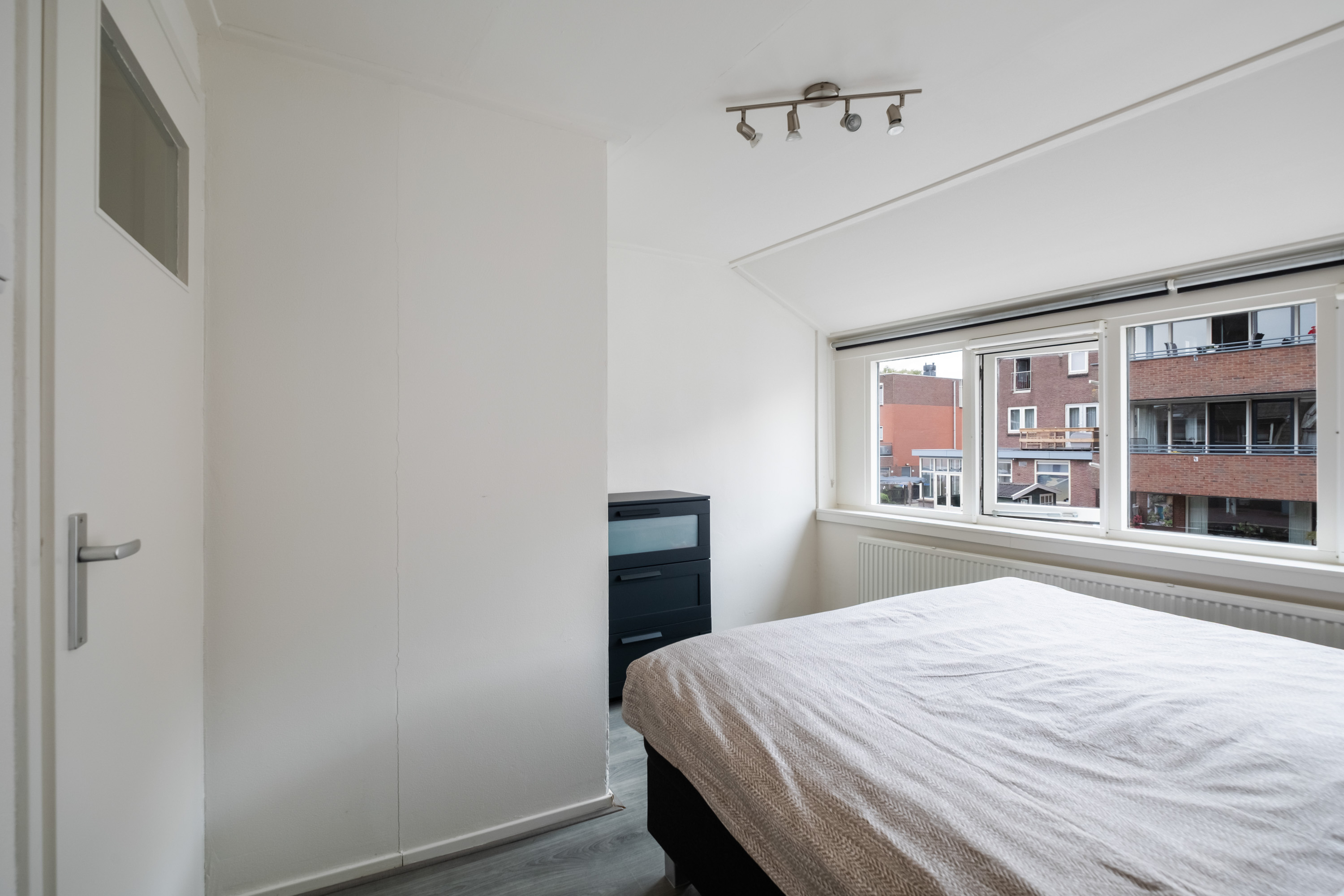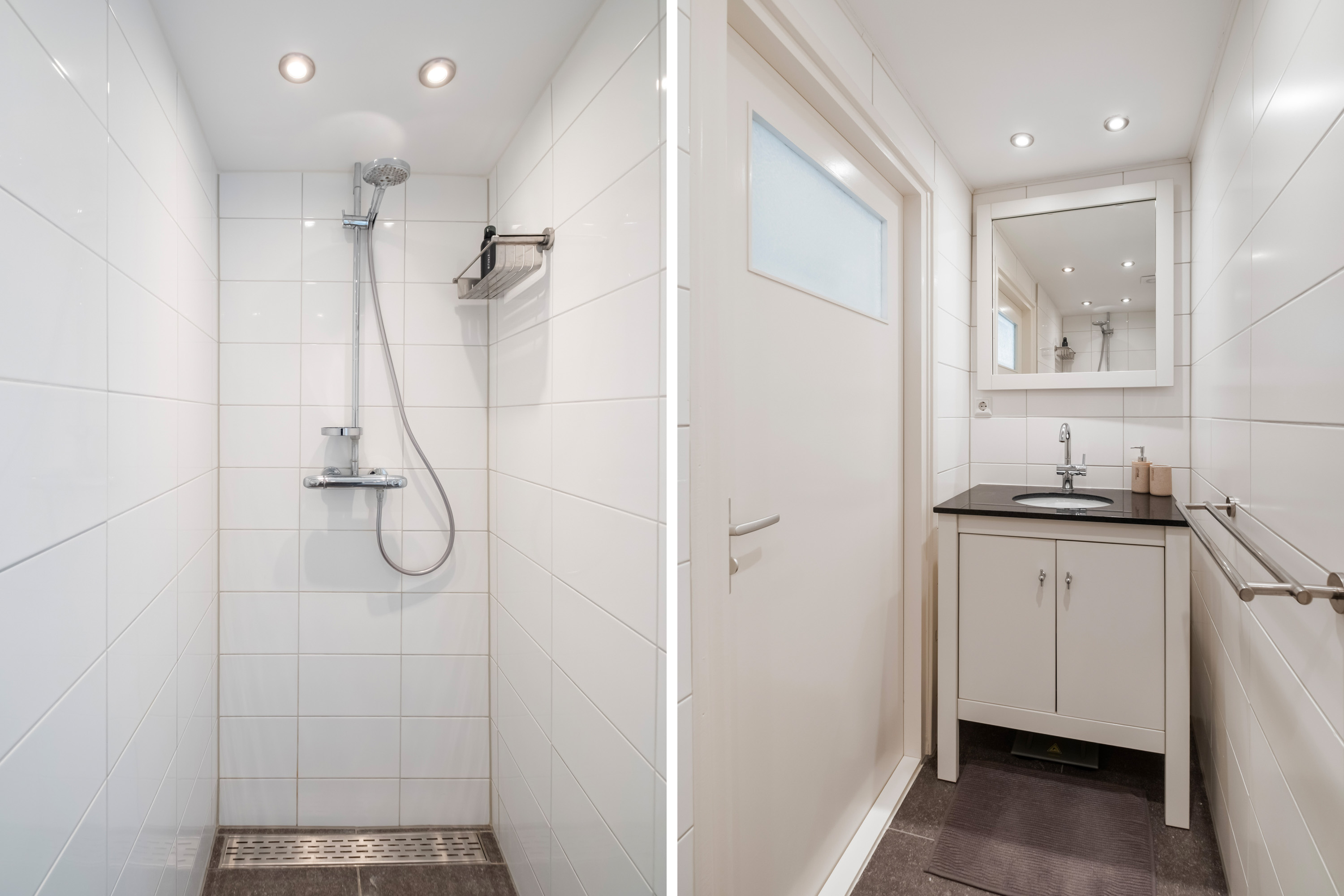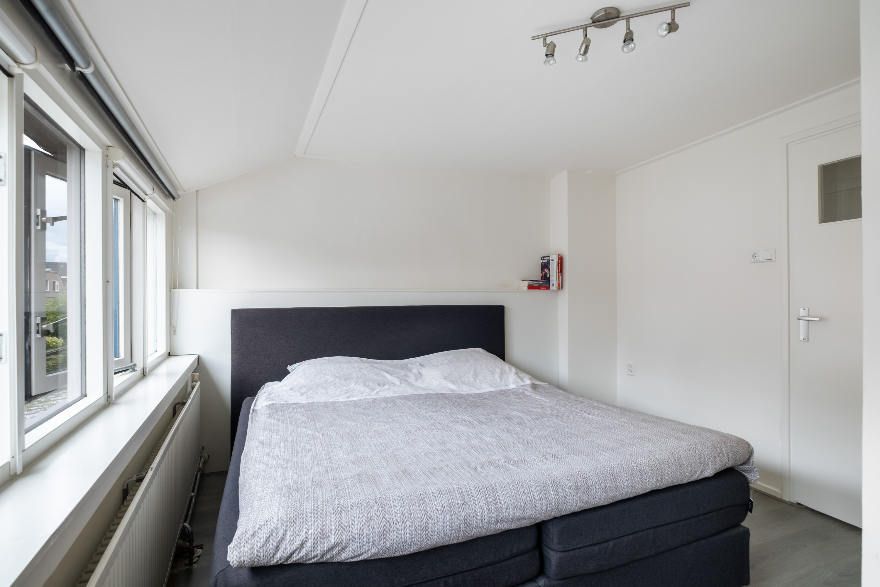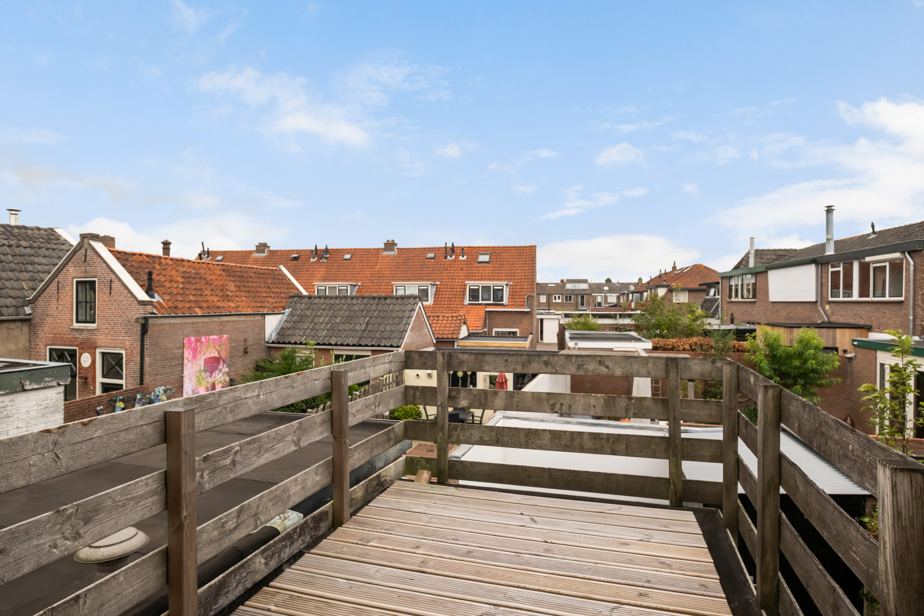 Vanaf de overloop kom je in de woningbrede slaapkamer met dakkapel aan de voorzijde. Dankzij de vele ramen geniet je hier van een heerlijk lichte en ruimtelijke sfeer. Aan de achterzijde bevinden zich de tweede en derde slaapkamer. In de linker kamer vind je de aansluitingen voor de wasapparatuur en via een loopdeur bereik je direct het zonnige dakterras. De tussengelegen badkamer is volledig betegeld en voorzien van een inloopdouche en een wastafelmeubel. Op de overloop kom je via een luik met vlizotrap op de royale bergvliering, waar de CV-ketel is opgesteld.