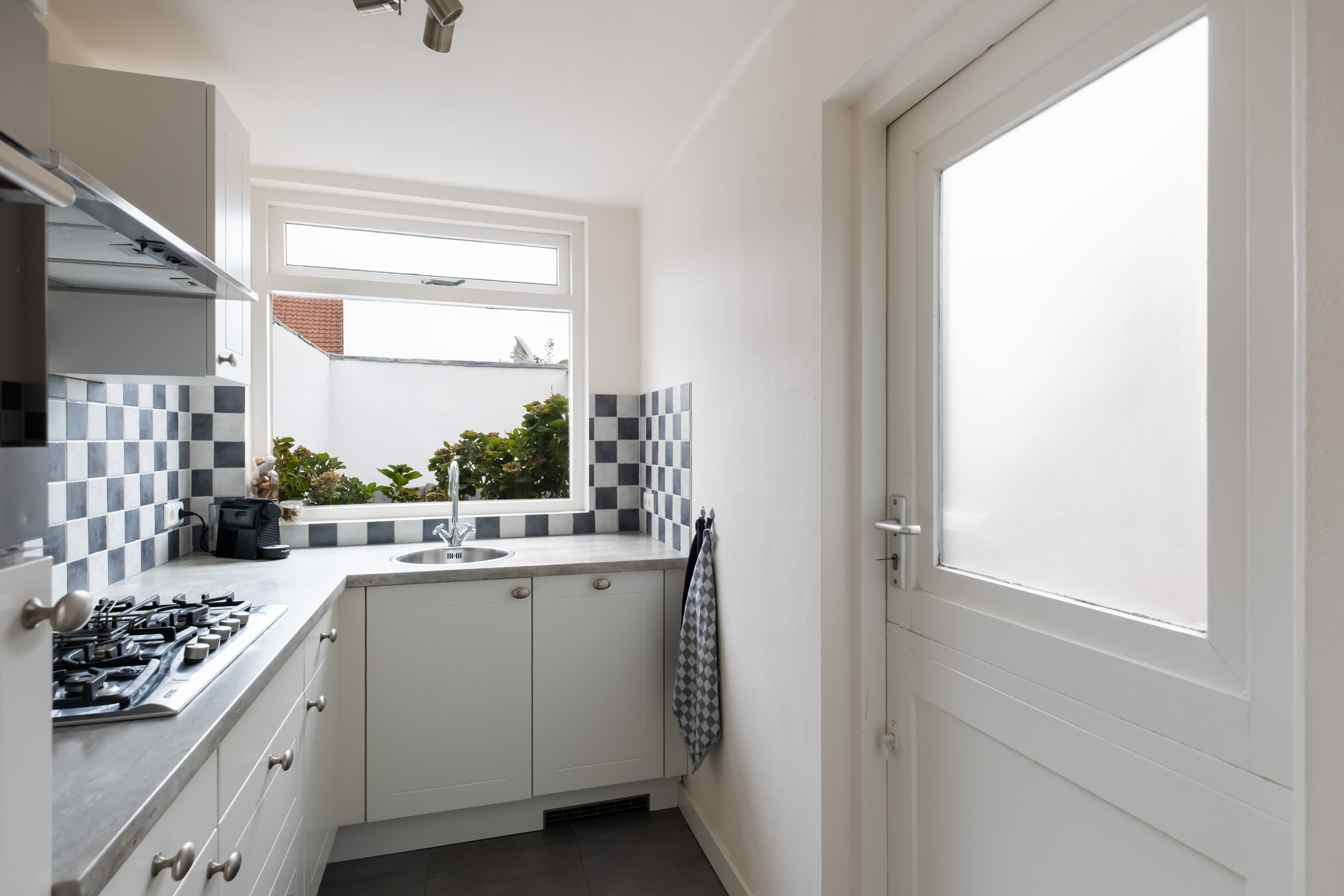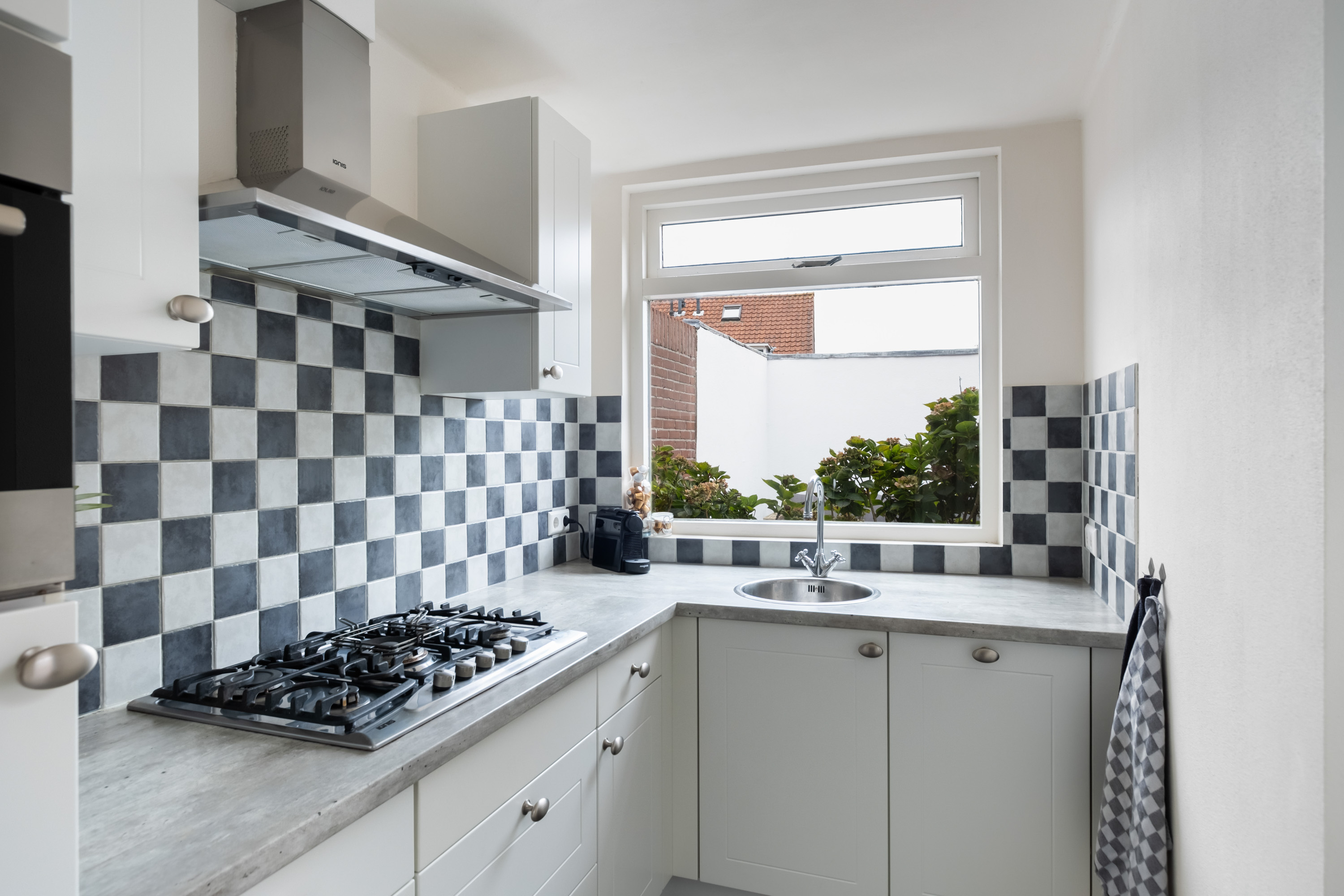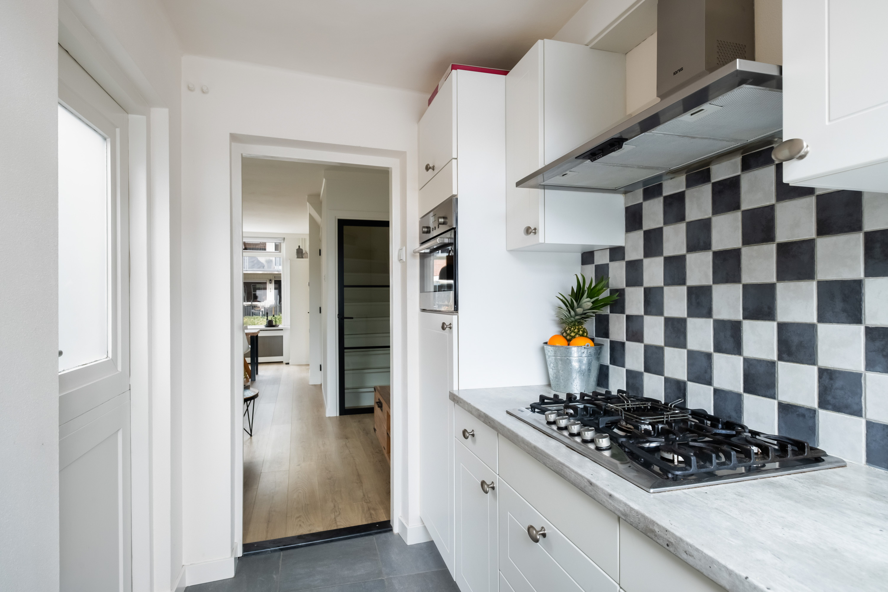 Via de open doorgang kom je in de keuken aan de achterzijde met een loopdeur naar de achtertuin. De keuken is opgesteld in een hoek en de volgende inbouwapparatuur is aanwezig: