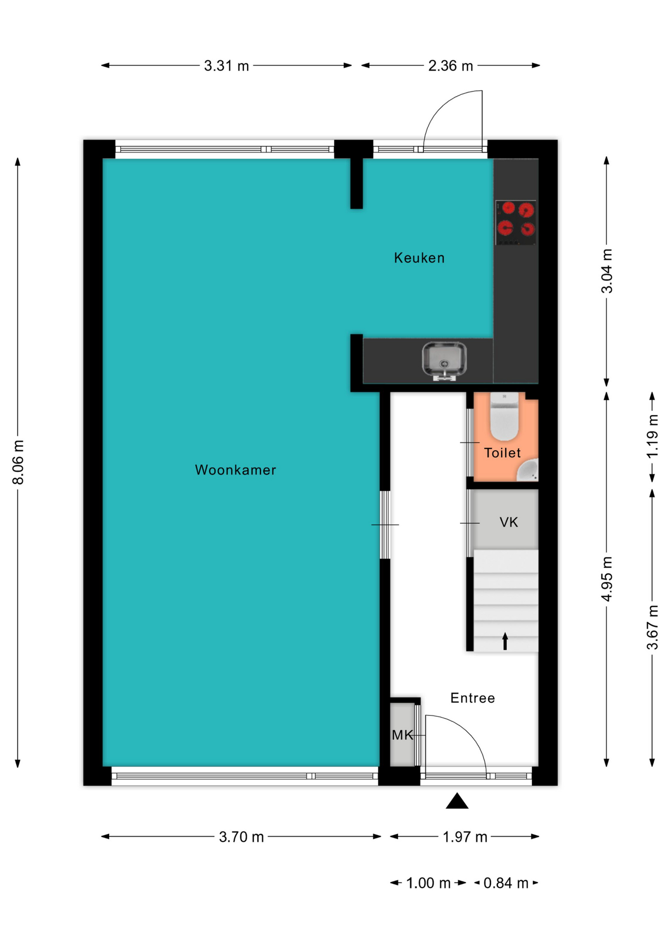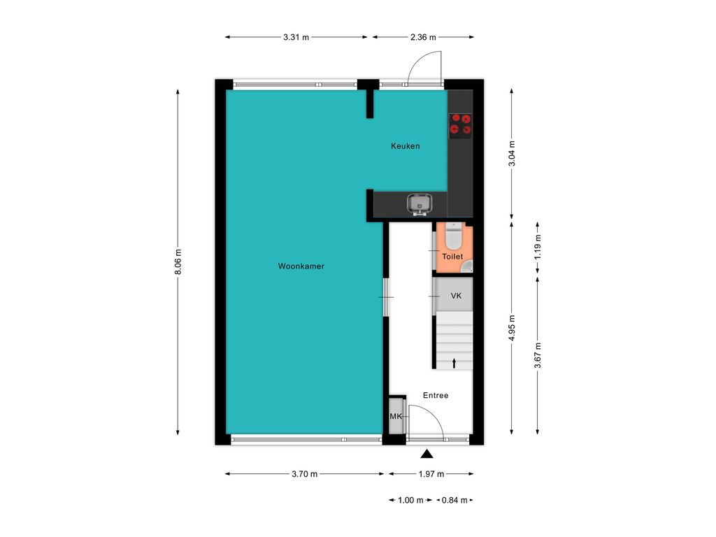 Voor de afmetingen en indeling raadpleeg de gedetailleerde plattegrond.