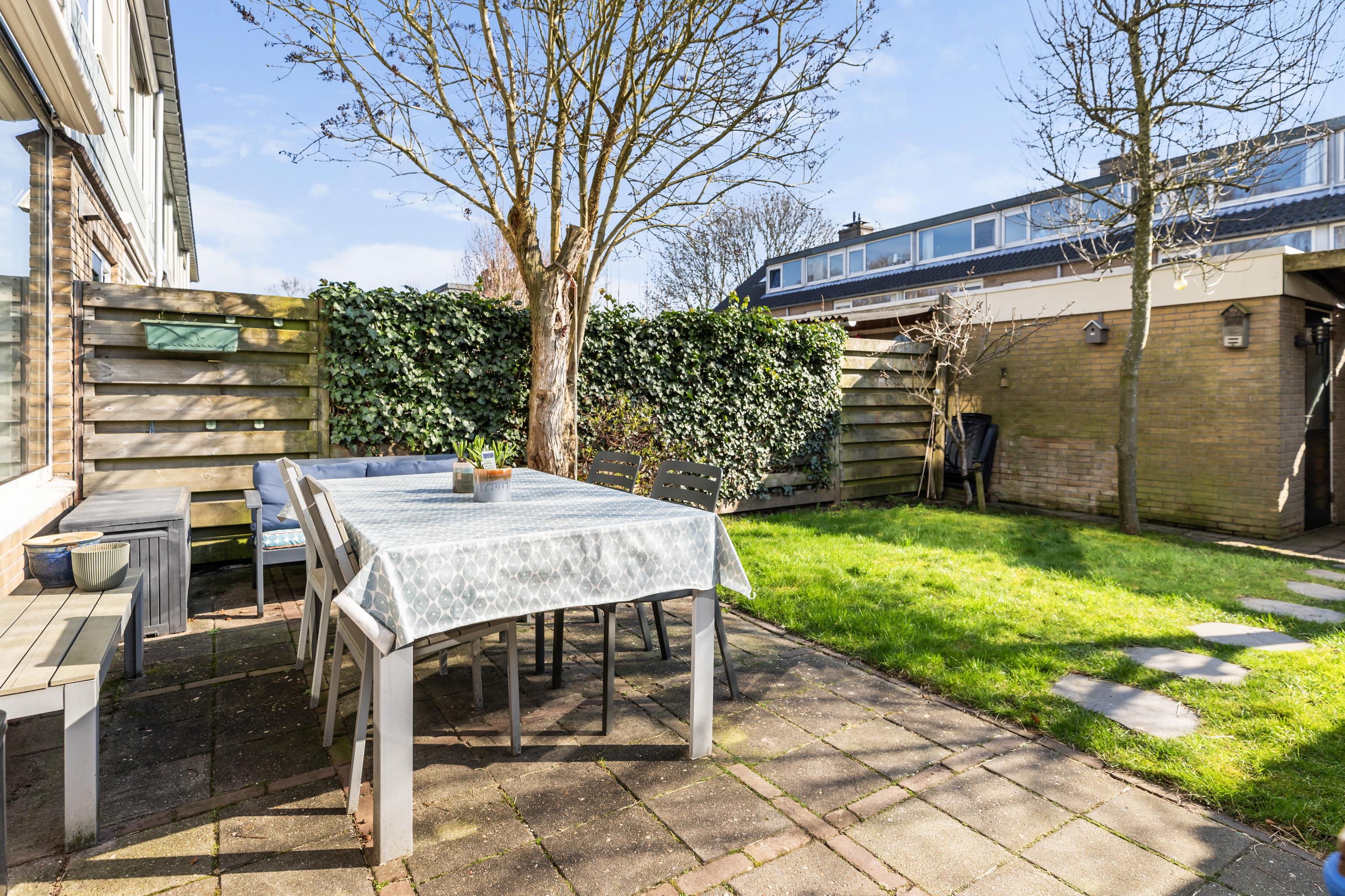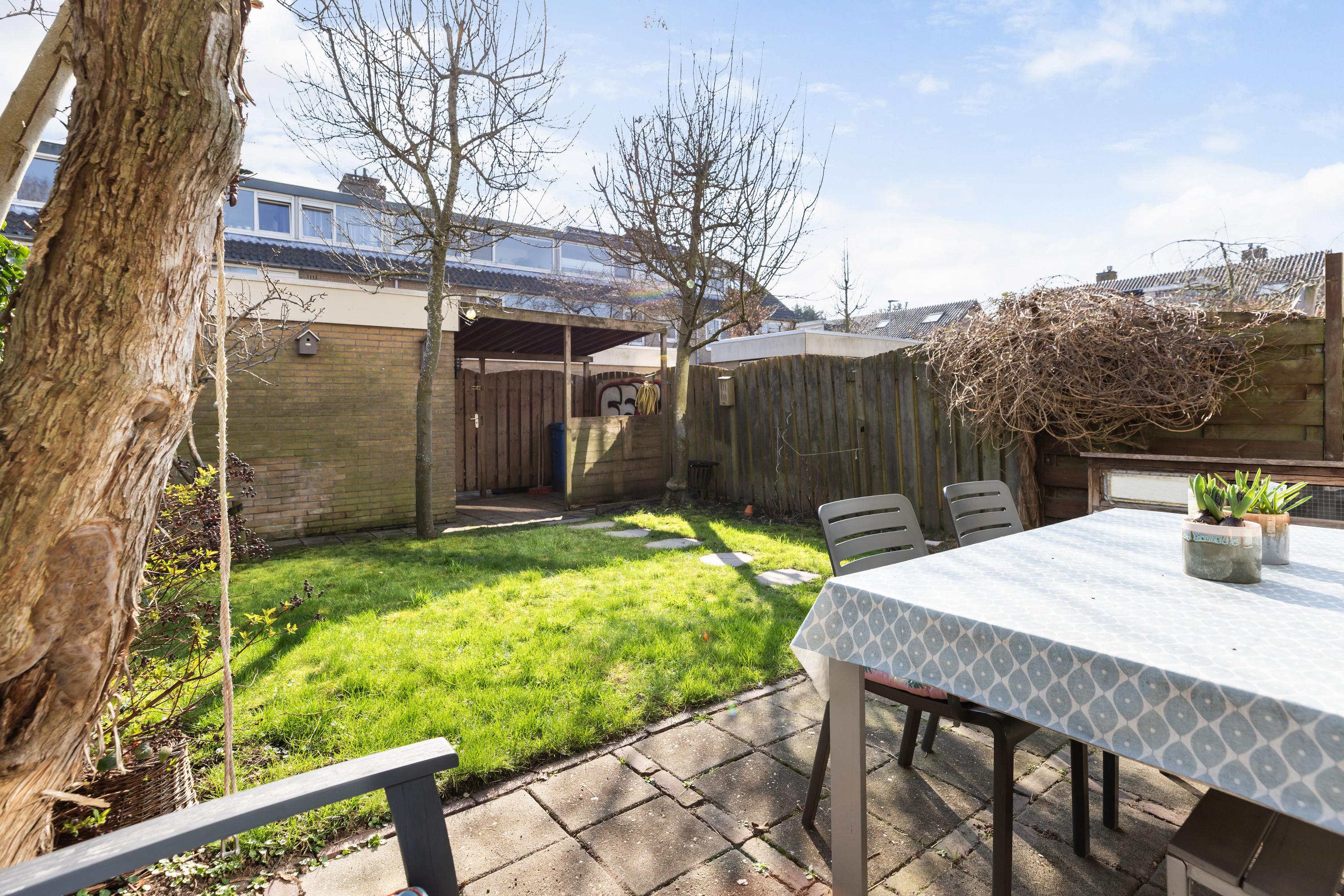 De achtertuin is ingericht met een terras van sierbestrating, een gazon met staptegels en bomen. Achterin de tuin staat een stenen berging met een aangebouwde overkapping, ideaal voor het stallen van fietsen en het opbergen van tuinspullen. Daarnaast ligt de tuin gunstig op het zuidoosten, waardoor je hier heerlijk lang van de zon kunt genieten. Aan de achtergevel is een elektrisch zonnescherm aanwezig.