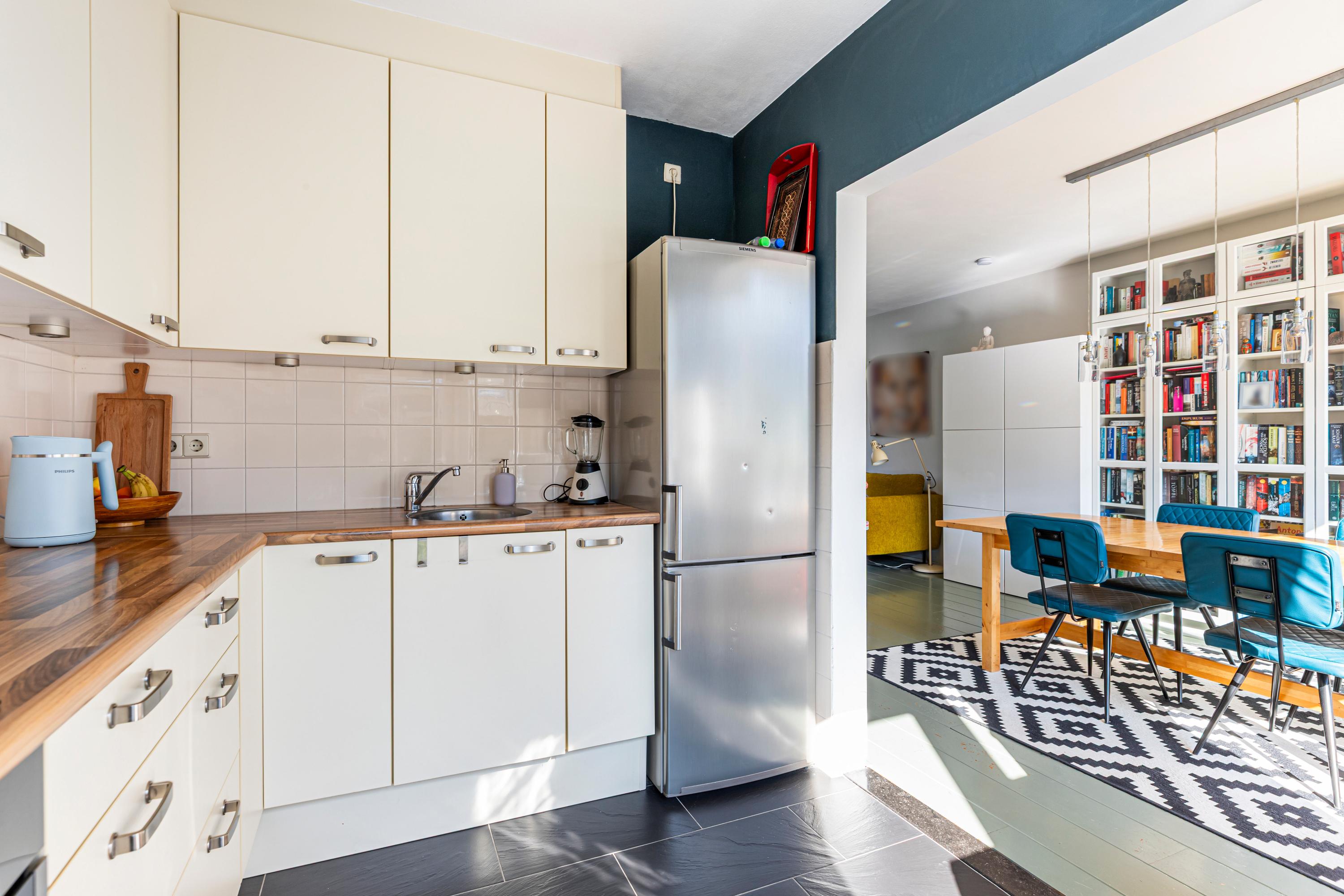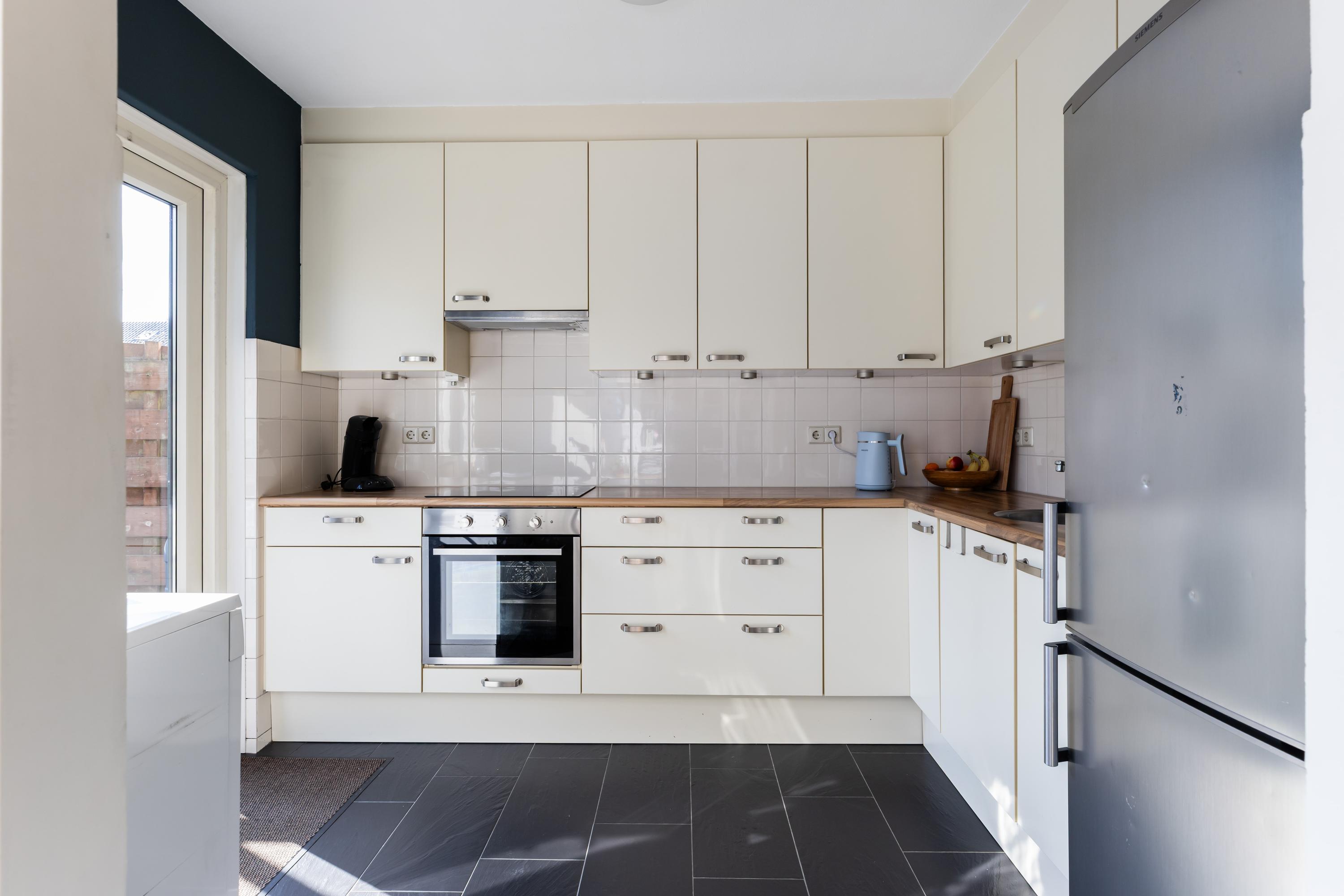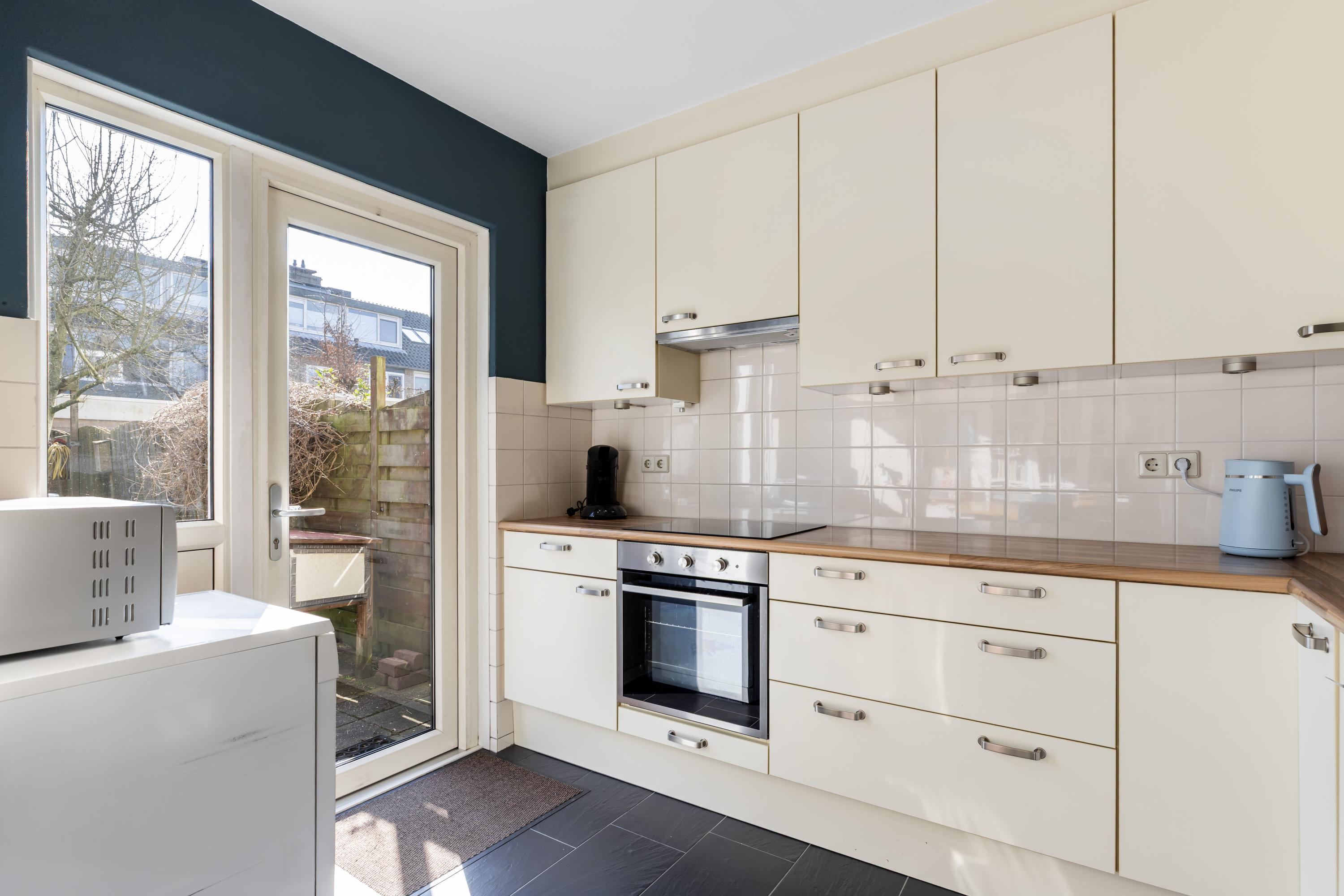 Via een loopdeur in de keuken is de achtertuin bereikbaar.