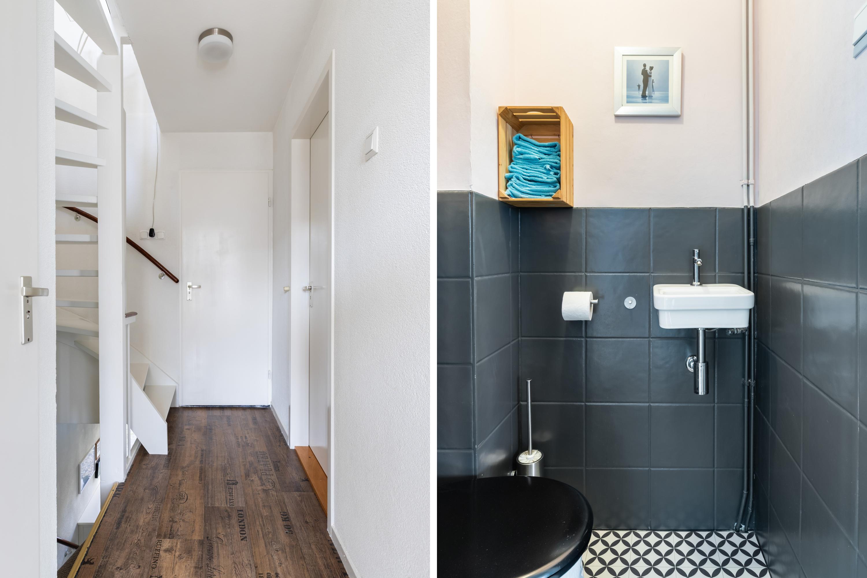 Er is voldoende parkeergelegenheid in de straat. Via de stoep bereik je voordeur en stap je de hal binnen. De hal is voorzien van de meterkast, de trapopgang, een opbergkast, de toiletruimte en de deur naar de woonkamer. Het zitgedeelte bevindt zich aan de voorzijde, waar je vanuit de grote raampartij een groen uitzicht hebt over de omgeving. In de achtergevel zijn tevens grote raampartijen met uitzicht op de tuin.