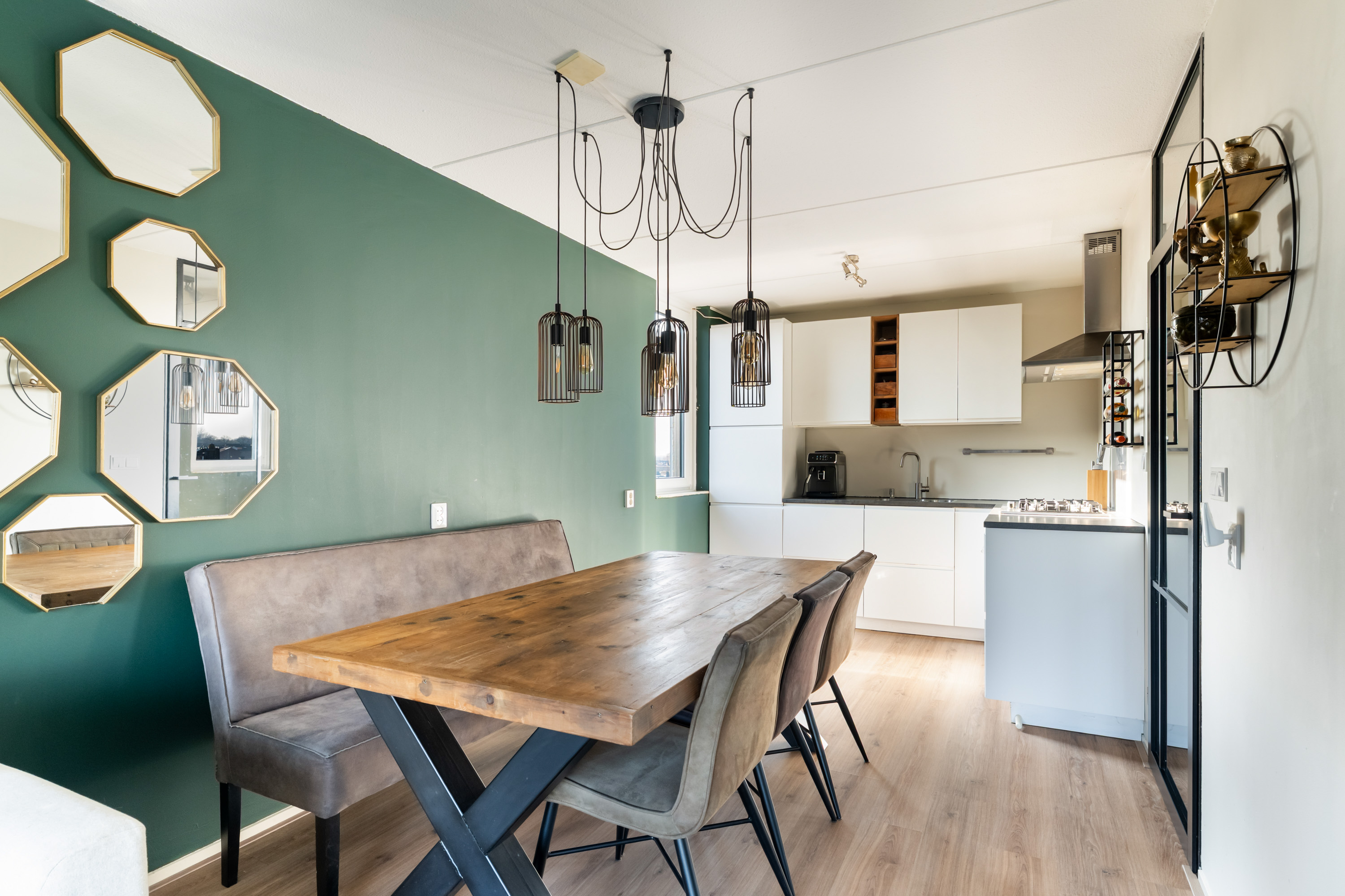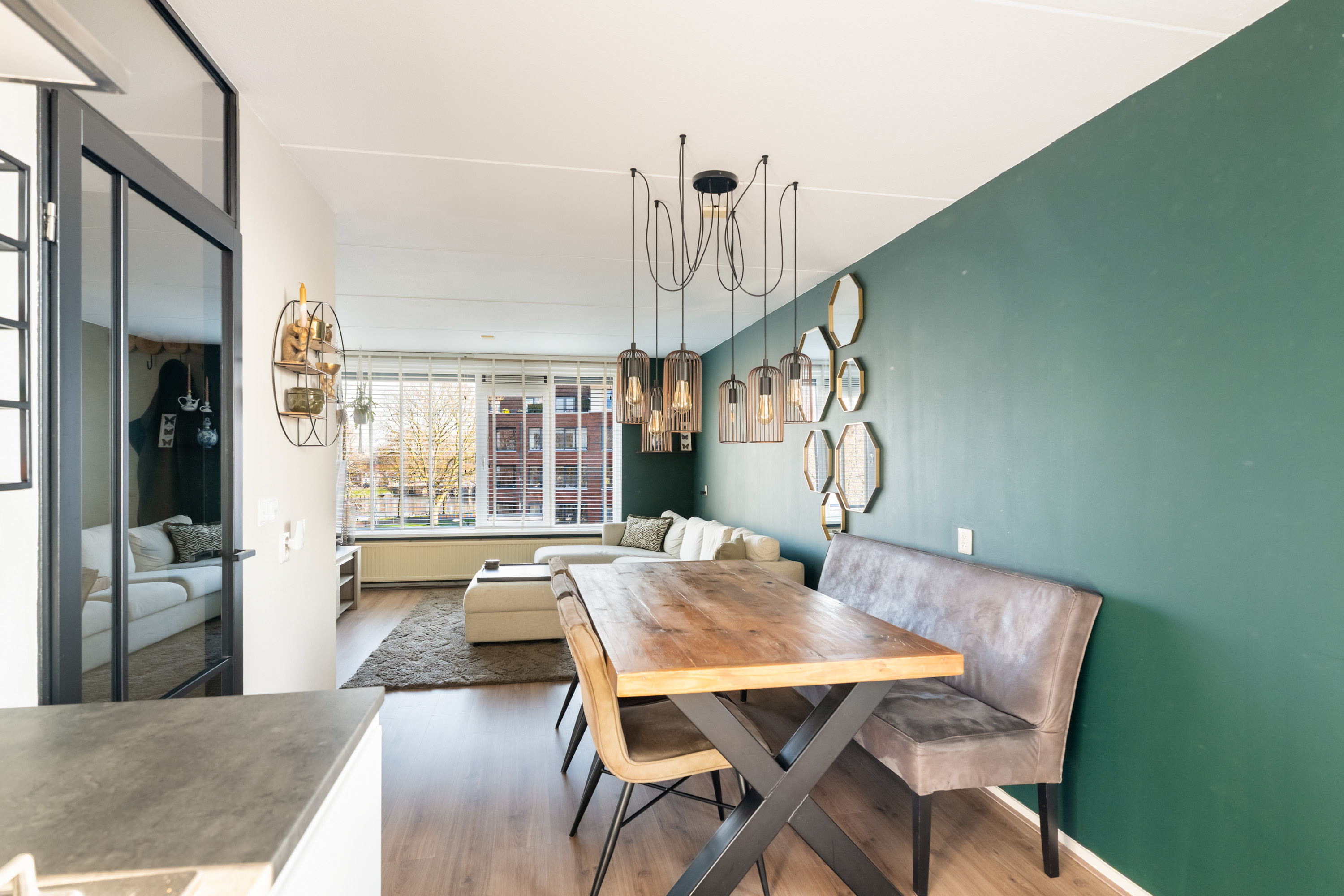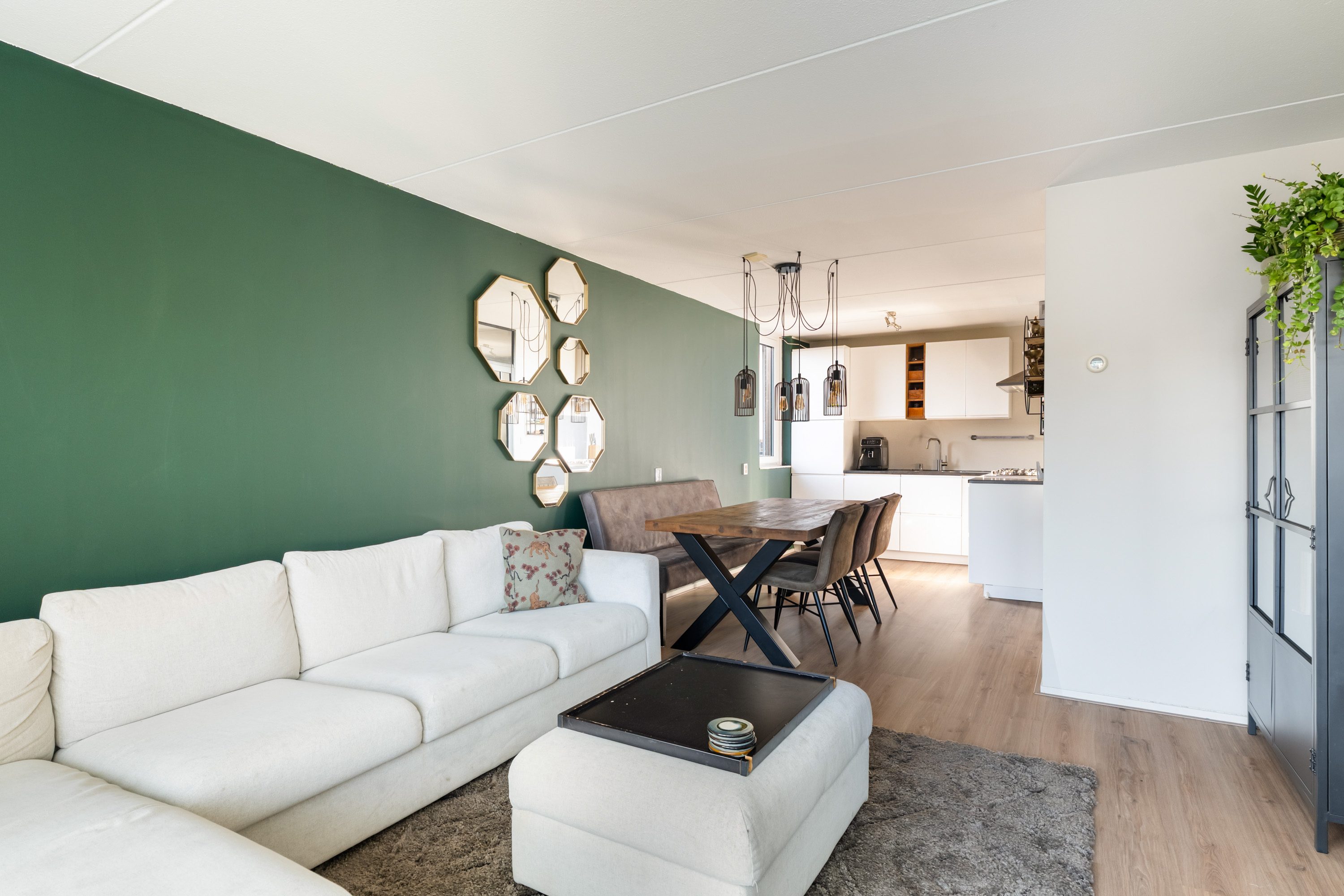 Centraal in de woonkamer is volop ruimte voor een grote eettafel, een fijne plek om gezellig te dineren.