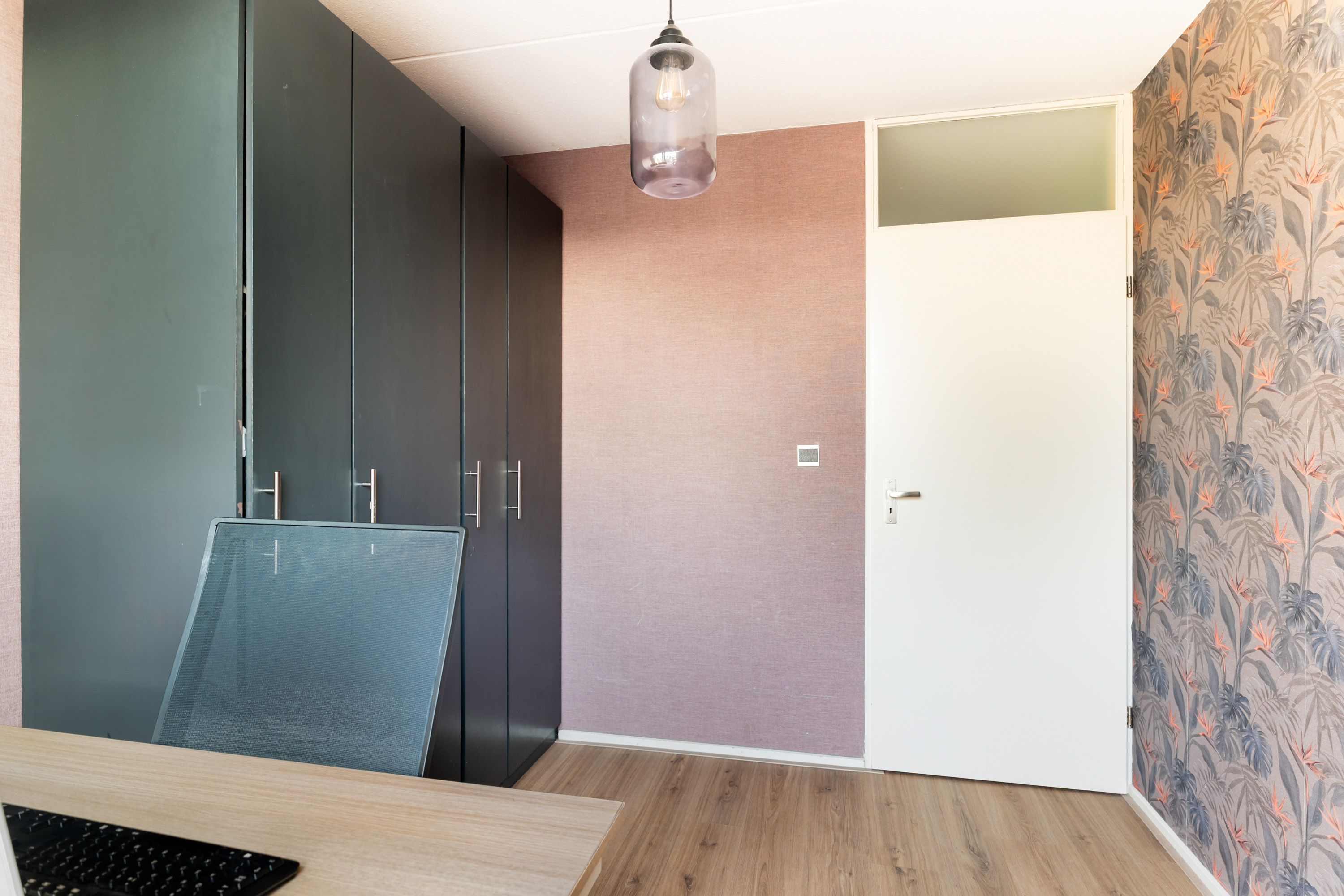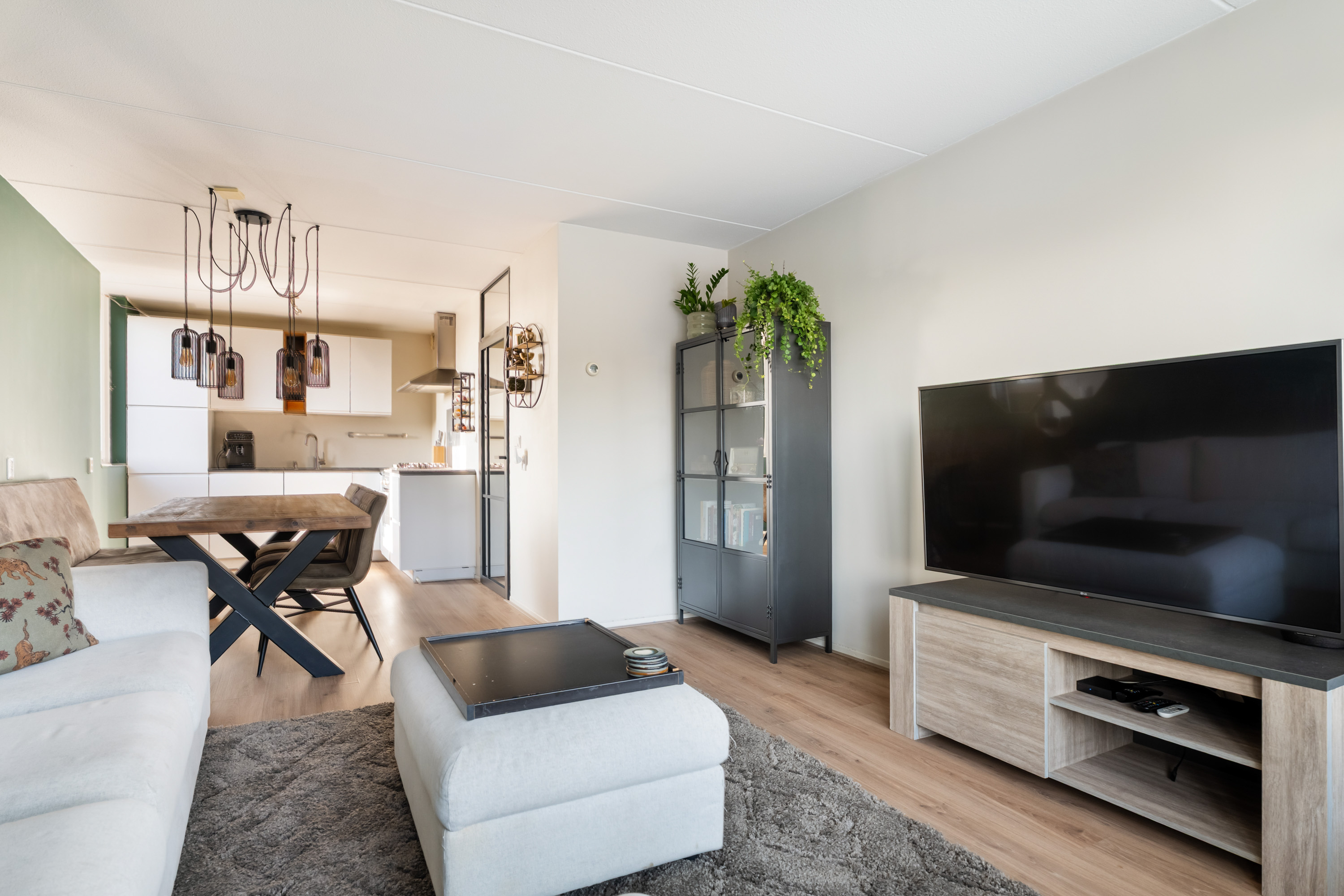 In de hal bevindt zich een vaste kast met de cv-ketel, de meterkast, toegang tot de slaapkamers en de badkamer en via de stijlvolle industriële deur kom je in de woonkamer.
