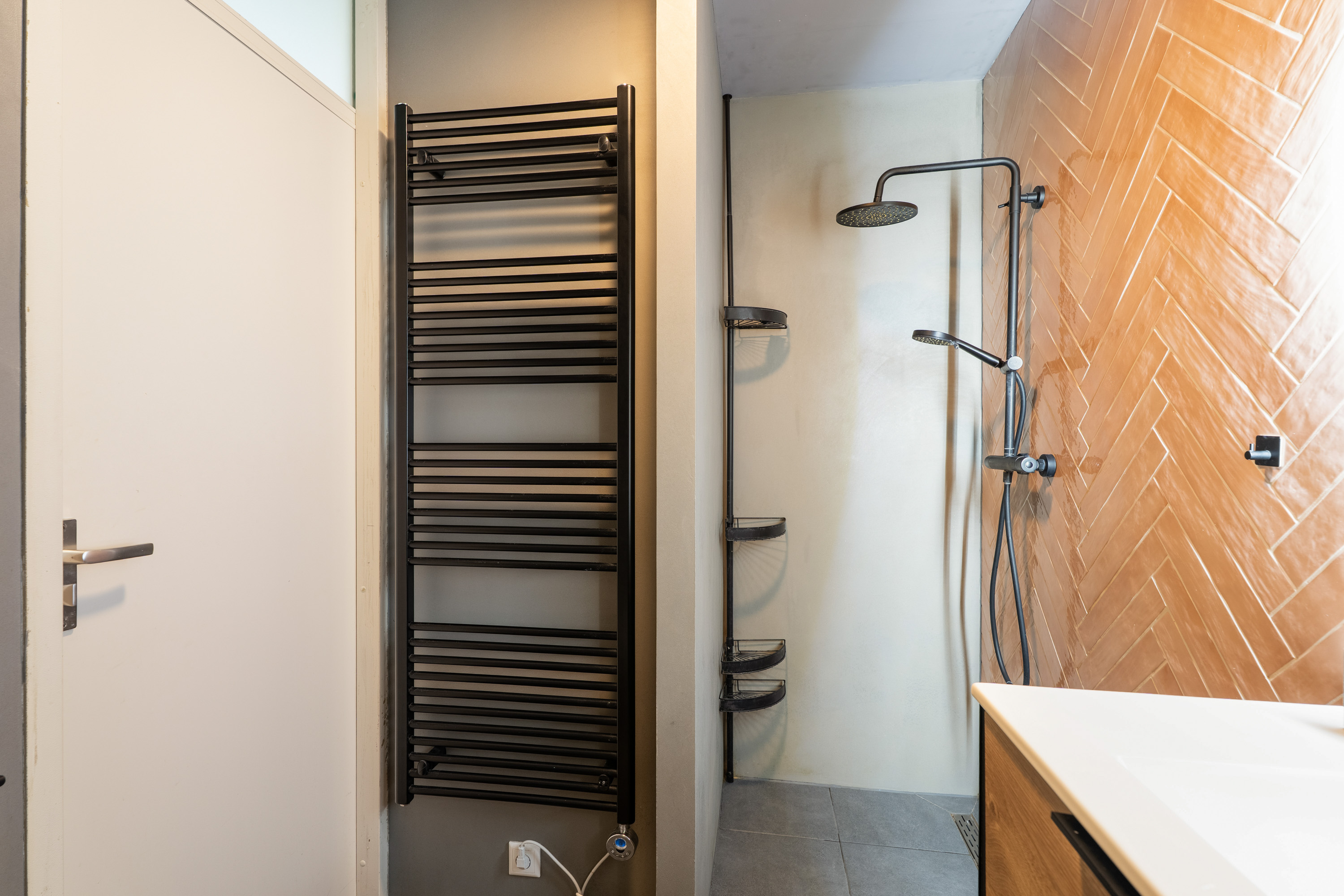 De gerenoveerde badkamer is in een moderne stijl uitgevoerd en voorzien van een inloopdouche, wastafelmeubel, toilet en handdoekenradiator.