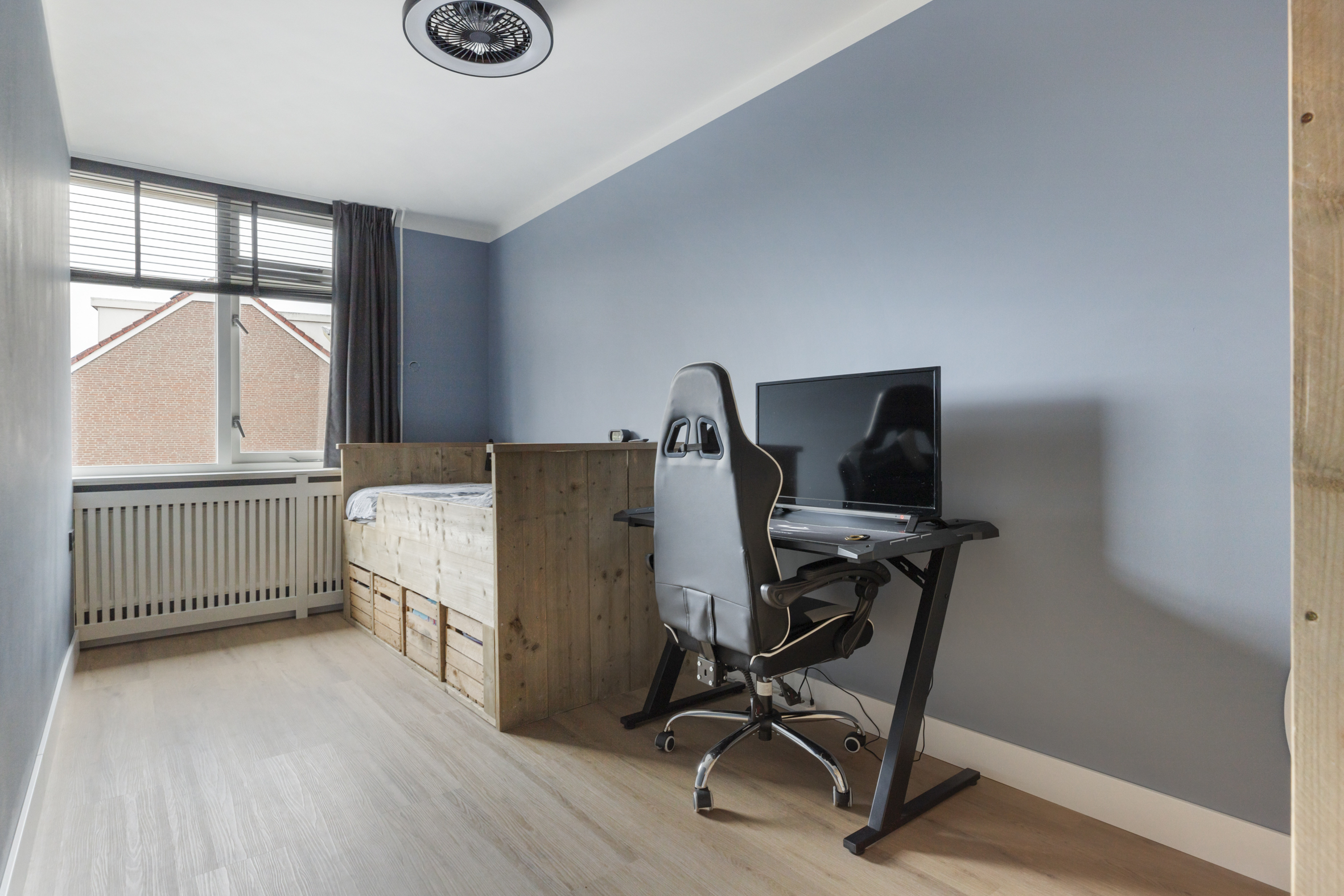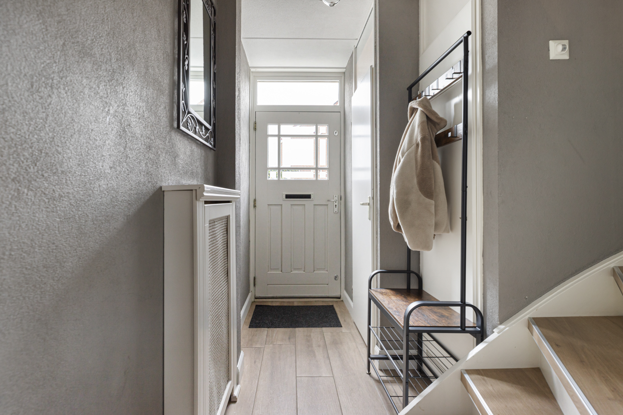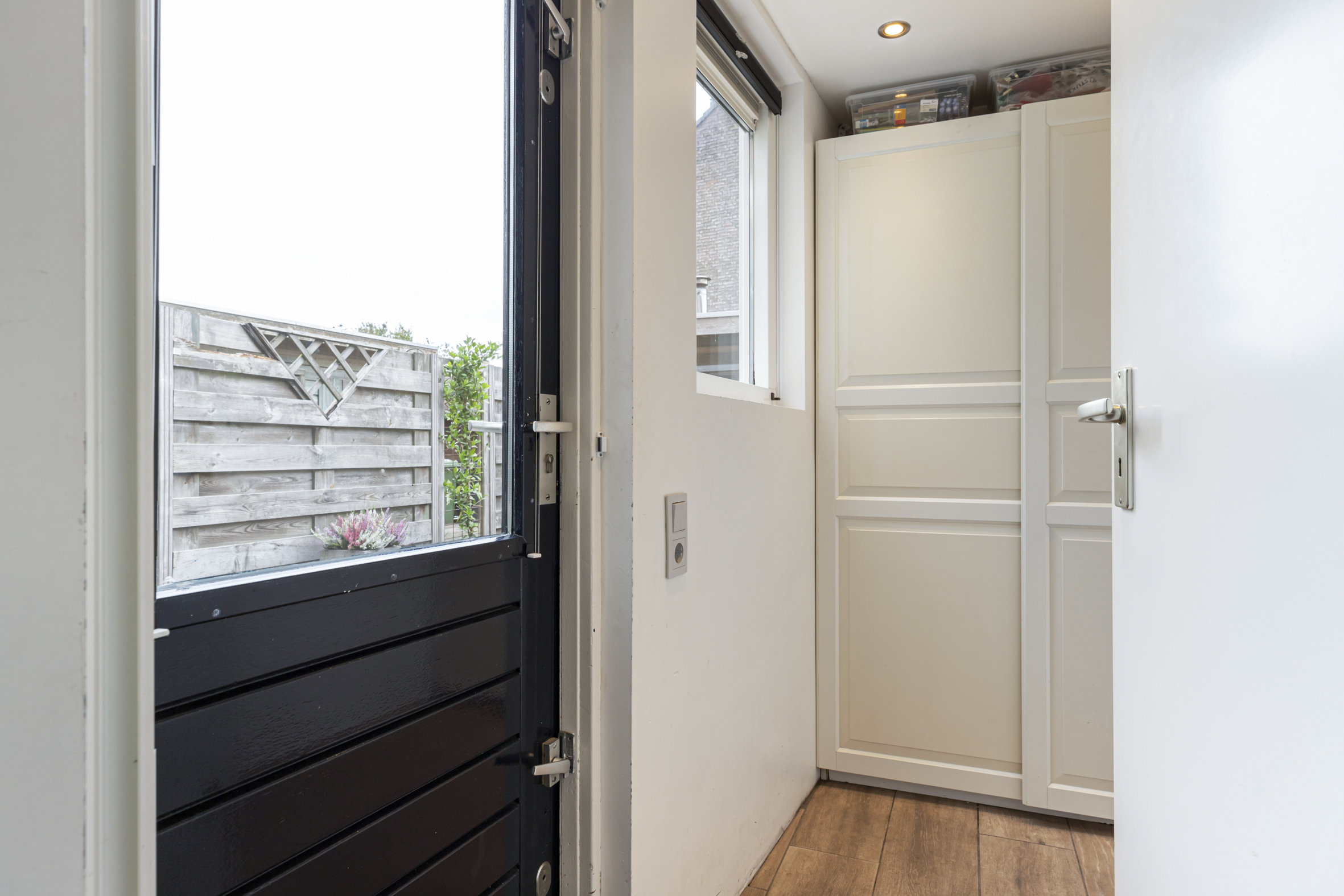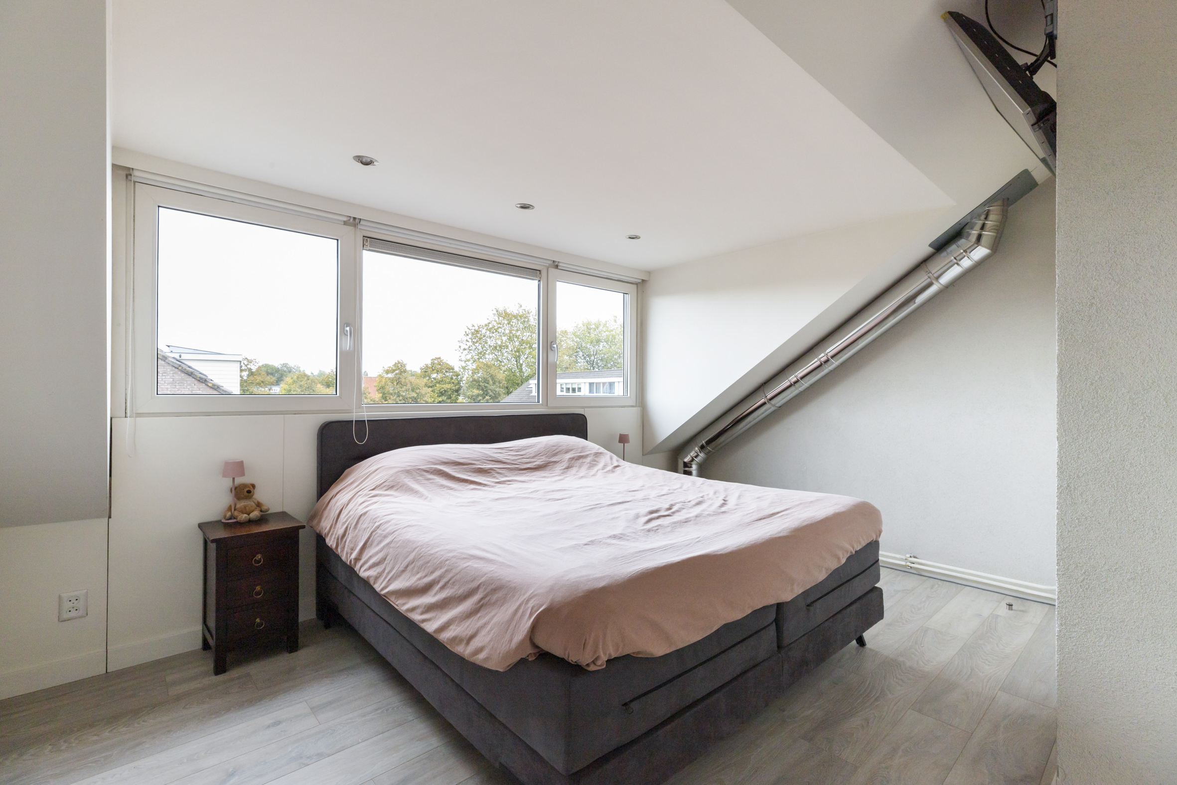 De tweede verdieping is aan zowel de voor- als achterzijde voorzien van een brede dakkapel, wat zorgt voor extra licht en ruimte. Aan de voorzijde bevindt zich een praktische was-/ opbergruimte met tevens de opstelplaats voor de HR CV-ketel. Aan de achterzijde ligt de derde slaapkamer, die de volledige breedte van het huis beslaat. Op de overloop is aironditioning (2023) aanwezig voor een prettig binnenkllimaat.