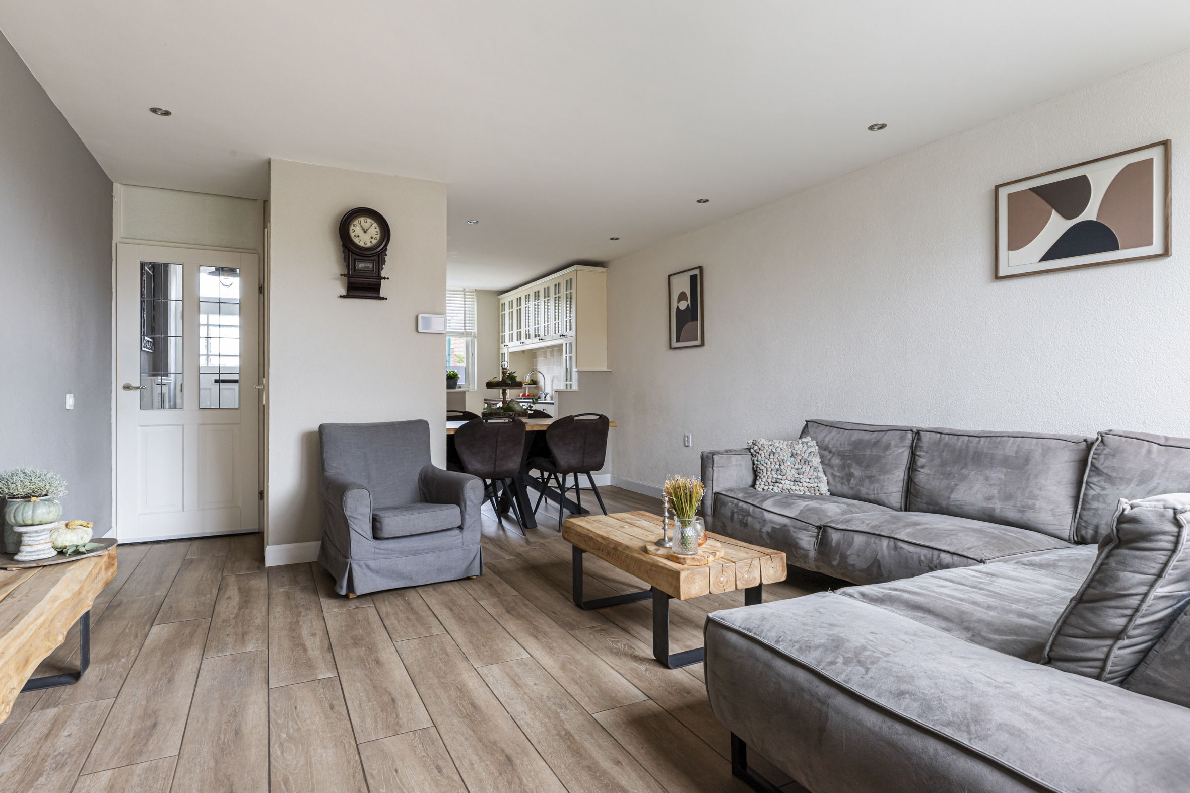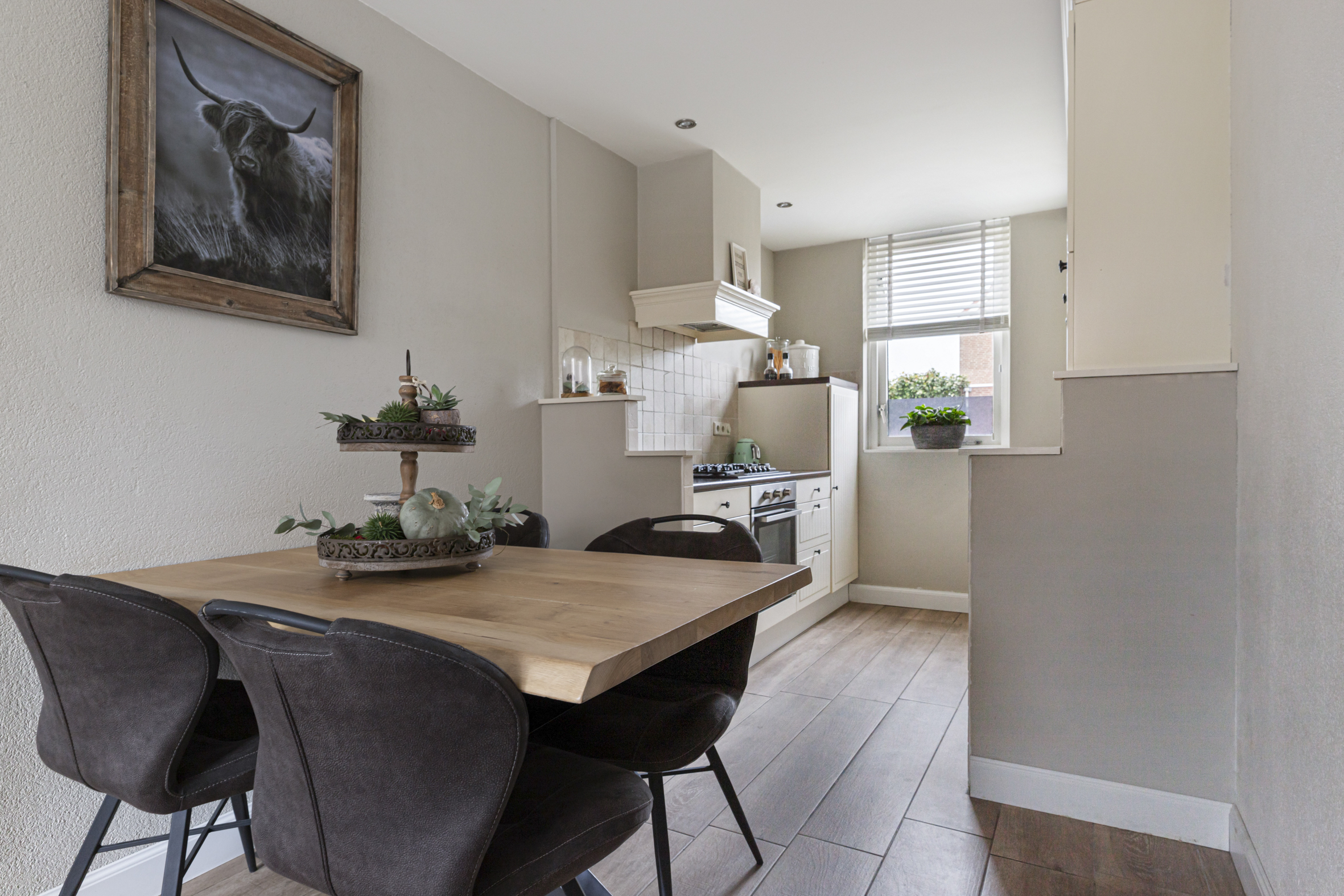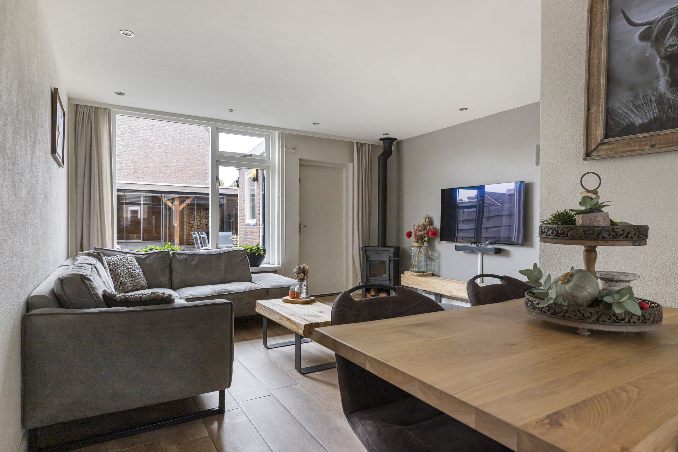 Direct naast de keuken bevindt zich het sfeervolle eetgedeelte, waar koken en gezellig tafelen samenkomen.