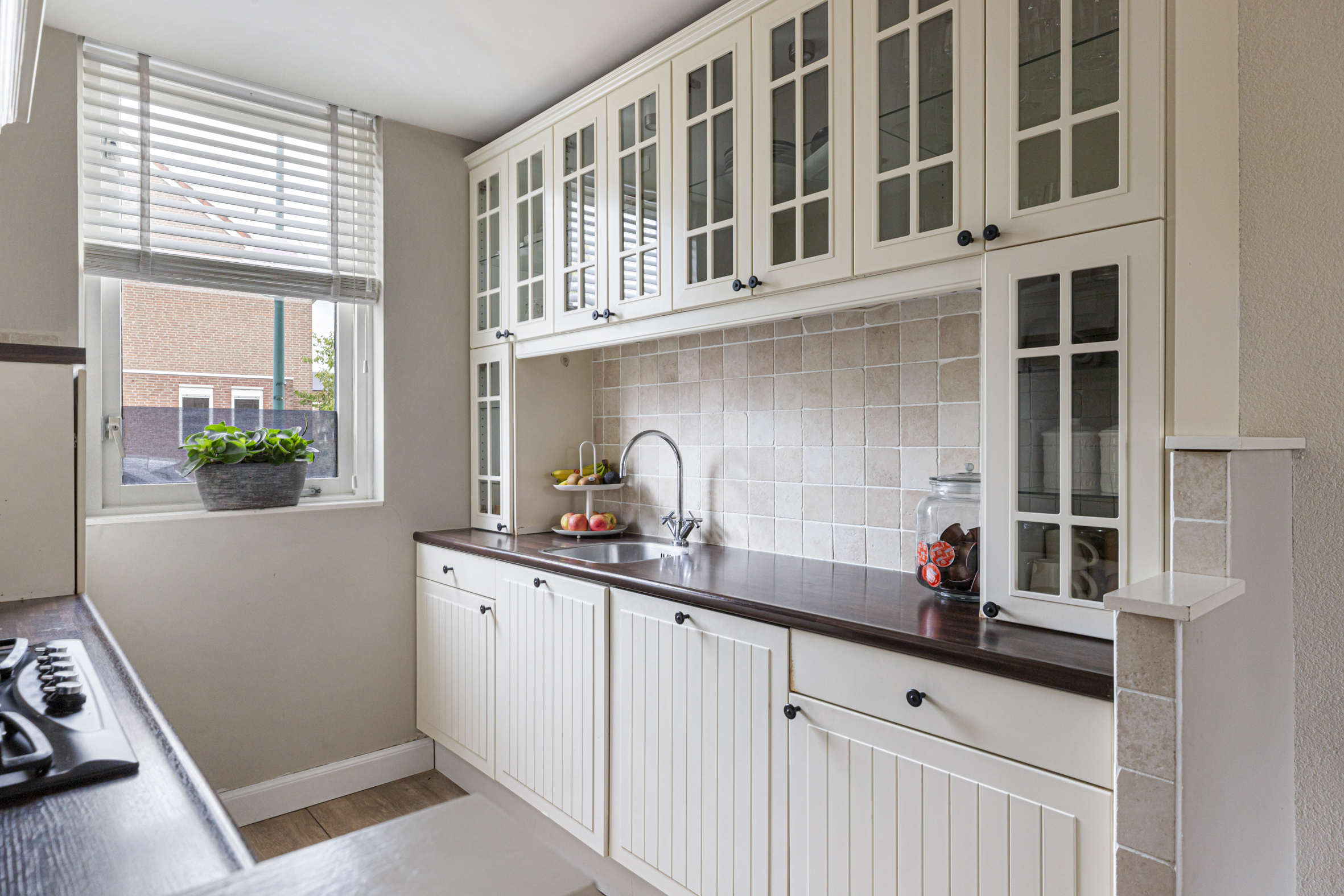 Aan de voorzijde van het huis is de open keuken te vinden met leuk en vrij uitzicht over de straat. De keuken is langs twee zijden opgesteld en voorzien van de volgende inbouwapparatuur: