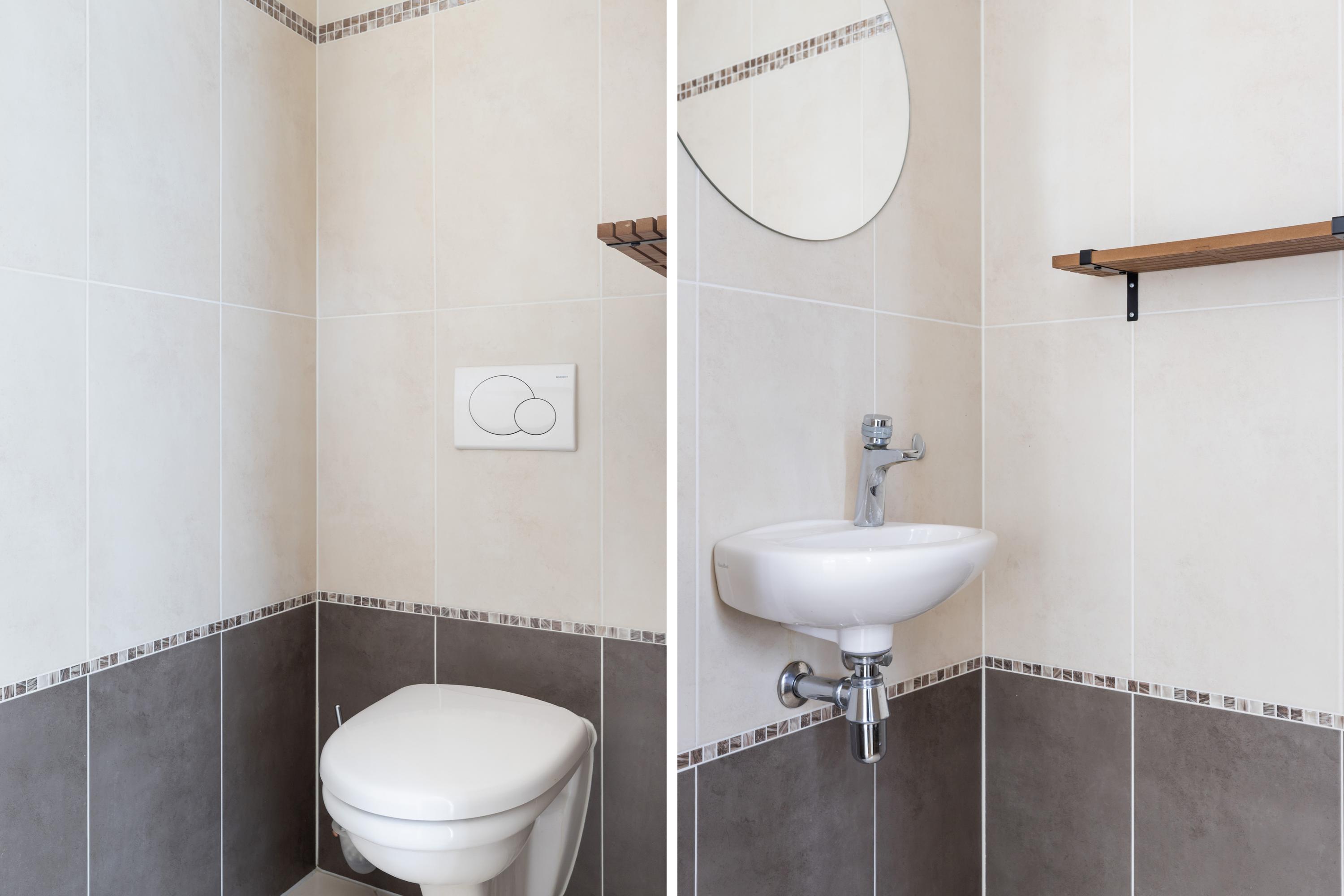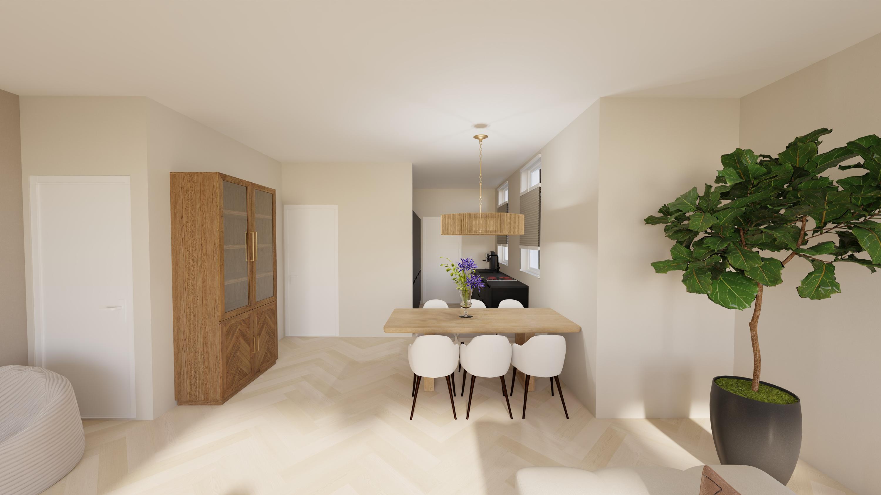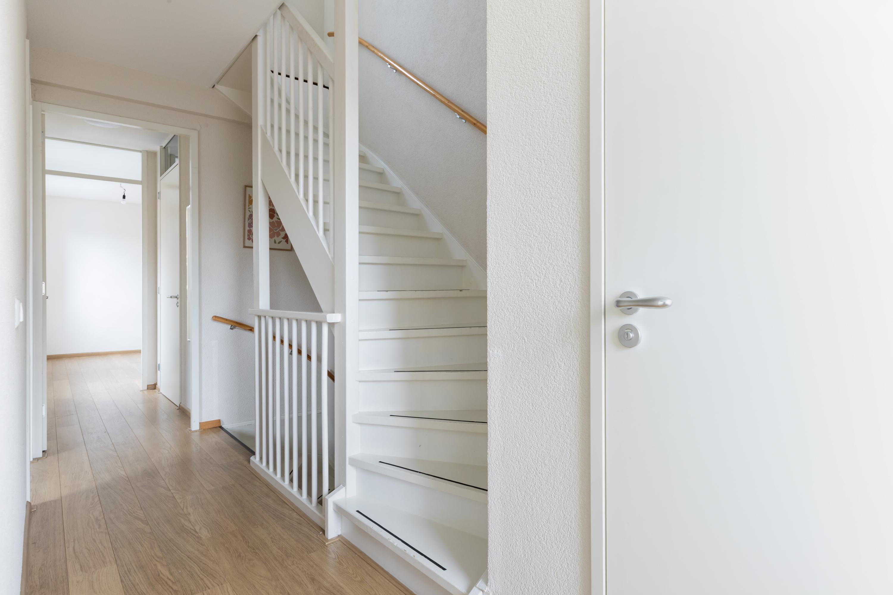 Vanuit de keuken bereik je via een schuifdeur een praktische bergruimte met de elektrische boiler, mechanische ventilatiebox en de aansluitingen voor wasapparatuur. Verder is de lichte woonkamer aan de achterzijde voorzien van een deur naar de achtertuin en onder de trap is een royale vaste kast voor extra opbergruimte.
