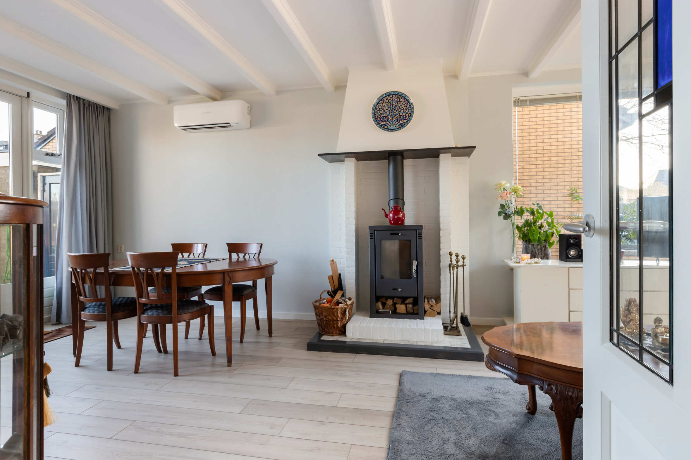 Vanaf de brede straat parkeer je de auto in de garage of op de eigen oprit. In de hal vind je de toiletruimte, meterkast, garderobe, trapopgang naar boven en de deur naar de woonkamer. De ruime woonkamer is voorzien van grote raampartijen en een gezellige haard. Daarnaast zorgt de airconditioning voor een optimaal binnenklimaat. De keuken bevindt zich aan de achterzijde, is half open en in een hoekopstelling geplaatst. Hier krijg je de beschikking over de volgende inbouwapparatuur:
