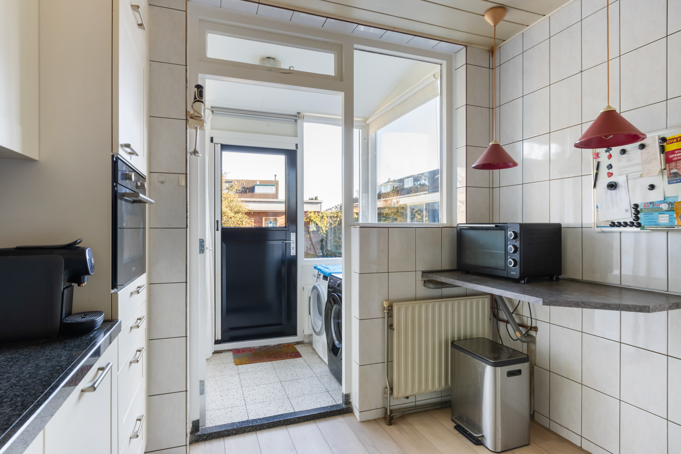 Vanuit de keuken is de bijkeuken bereikbaar. Hier bevinden zicht de aansluitingen voor de wasapparatuur en via een deur kom je in de achtertuin.