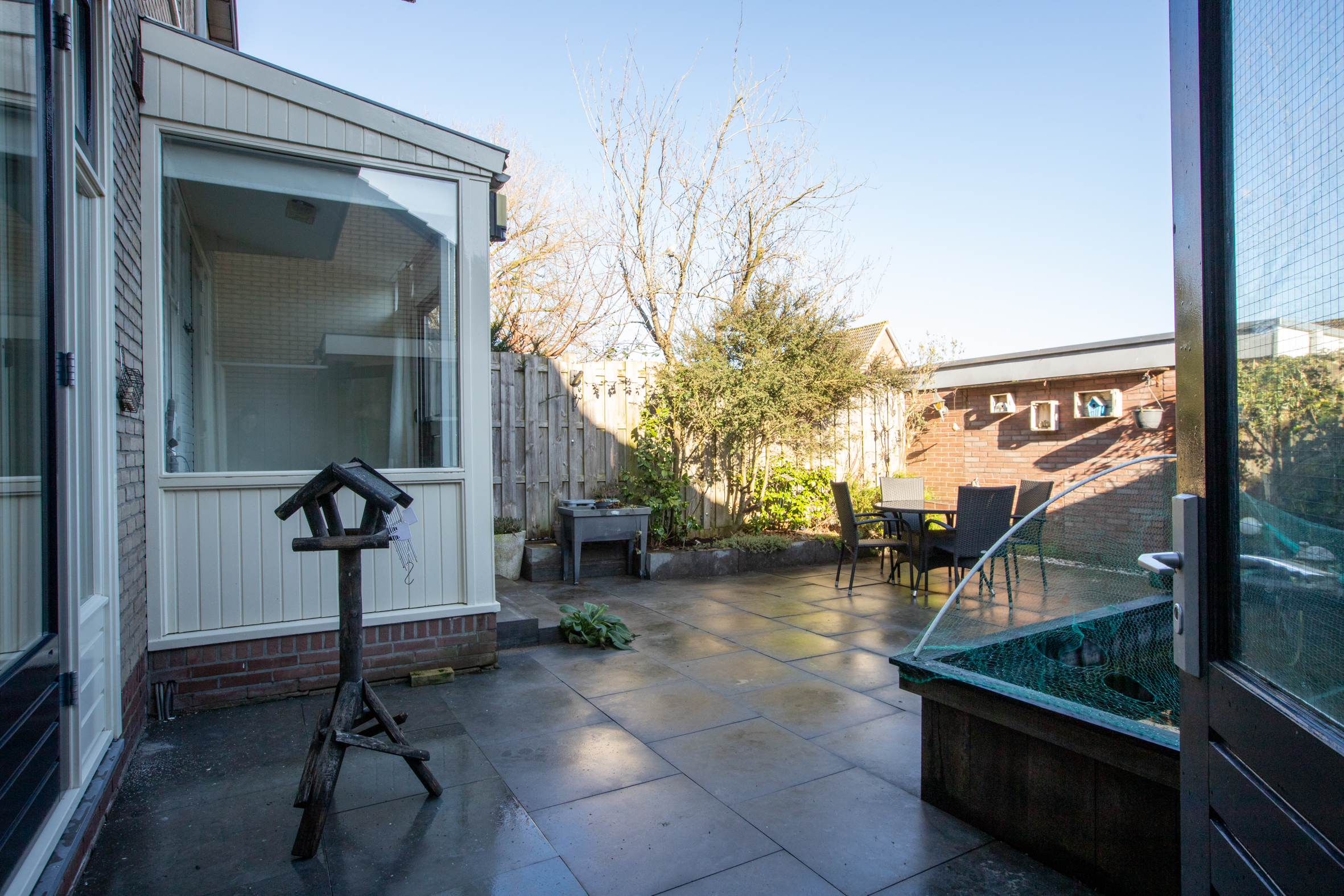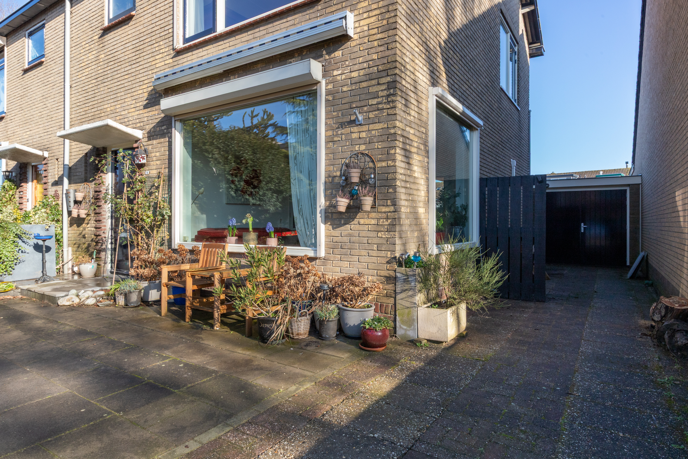 Vanaf de straat is er toegang tot de voortuin, de oprit en de vrijstaande garage. De garage is voorzien van elektra, openslaande deuren aan de voorkant en een loopdeur naar de tuin. Vanuit de woonkamer kom je via openslaande deuren in de achtertuin. Hier geniet je van ochtend- en middagzon en heb je veel privacy door de vrije ligging.